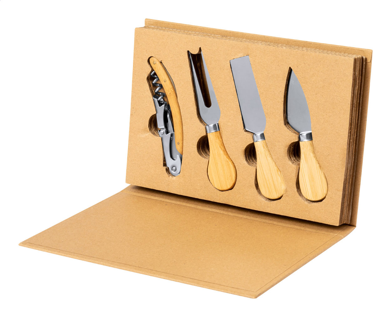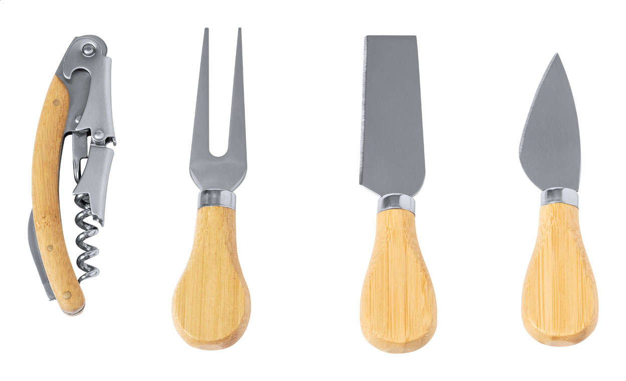 4-teiliges Wein- und Käsemesserset aus Edelstahl mit Bambusgriffen, verpackt in buchförmige Schachtel aus recyceltem Kraftpapier. Set beinhaltet: Korkenzieher, 2 Käsemesser und 1 Käsegabel.