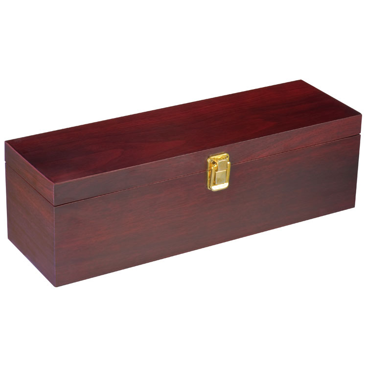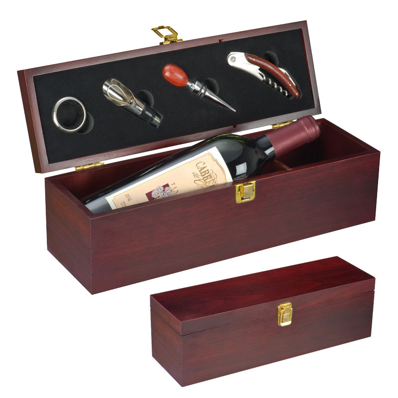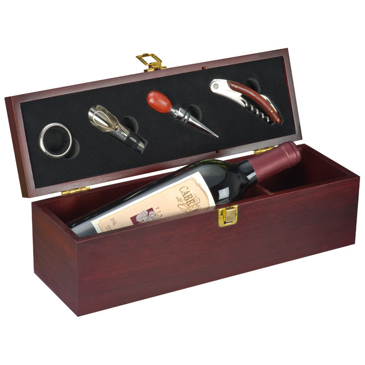 Stilvolle Weinbox ausgestattet mit einem Kellnermesser, einem Tropfring, einem Flaschenverschluss aus Metall sowie einem Ausgießer mit Verschluss. Ihre Werbung wird auf dem Deckel unten rechts vorzugsweise in Gold angebracht.