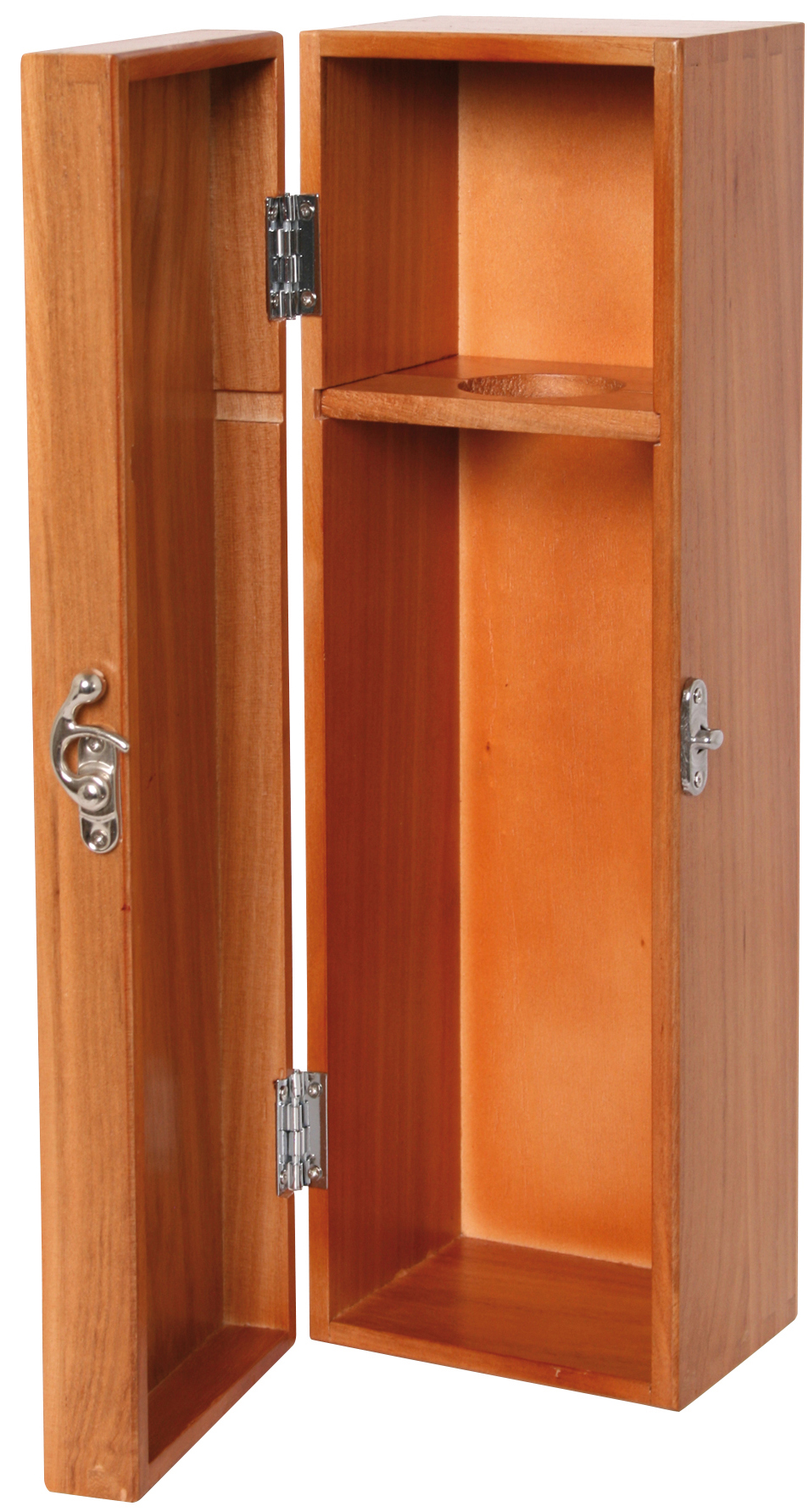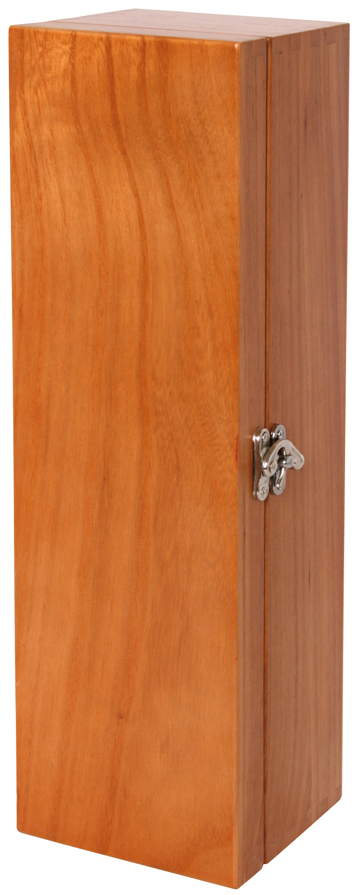 Aus Holz mit Metall-Zierverschluss, Klappdeckel und Steg für den Flaschenhals. Für eine Flasche.