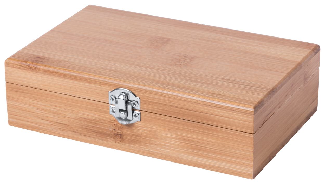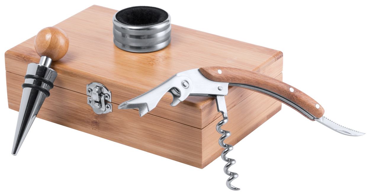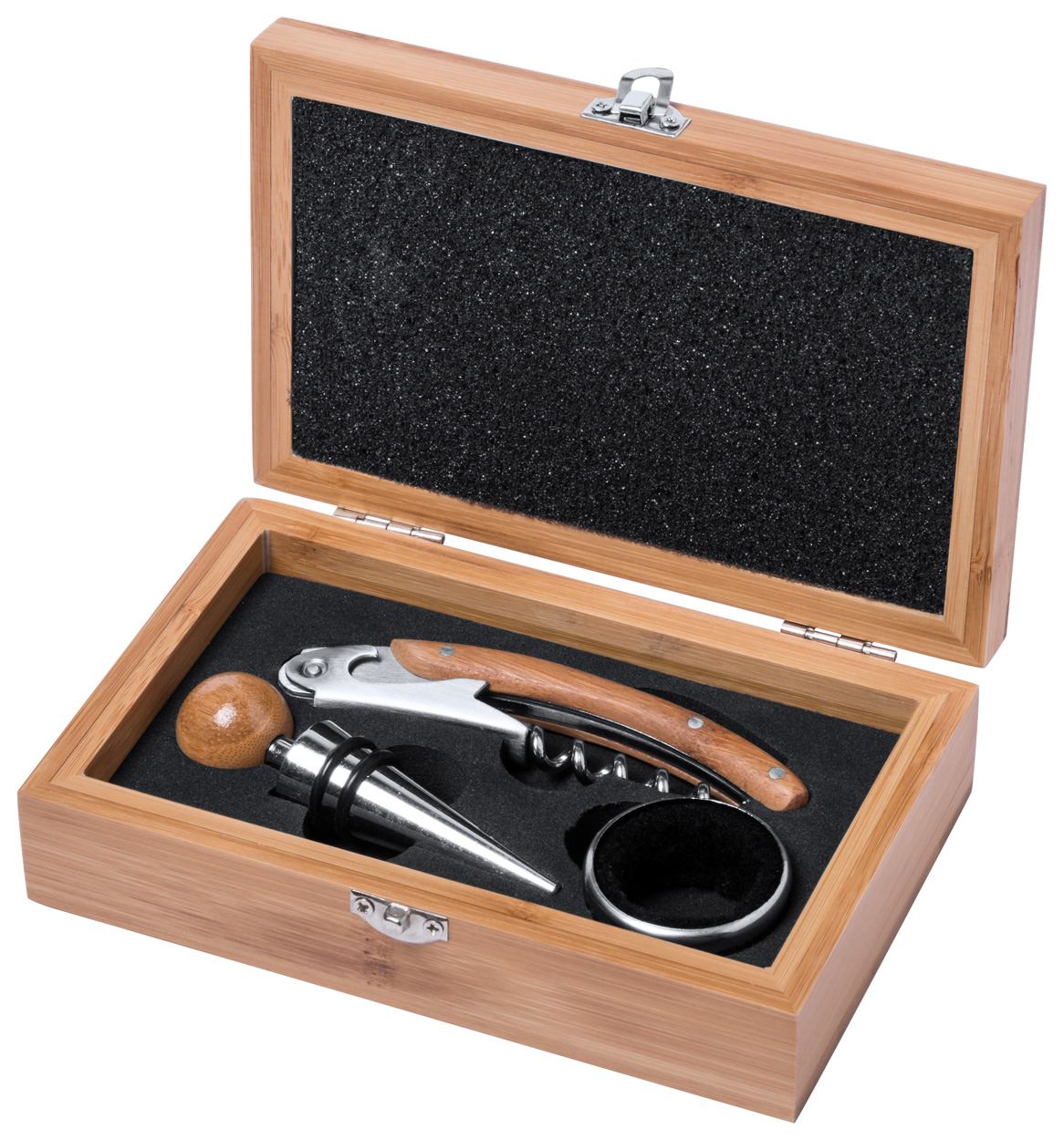 Bambus-Weinset mit Korkenzieher, Tropfring und Flaschenverschluss in Bambus-Schachtel.