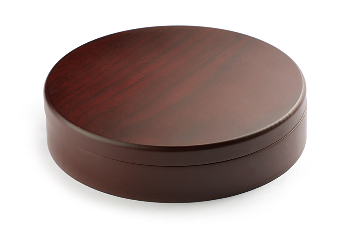 Praktisches 4-teiliges Weinset in einer runden Holzkiste. Kellnermesser, 2 mit Korken verzierte Flaschenverschlüsse. Das Logo ist auf der Holzkiste eingraviert.