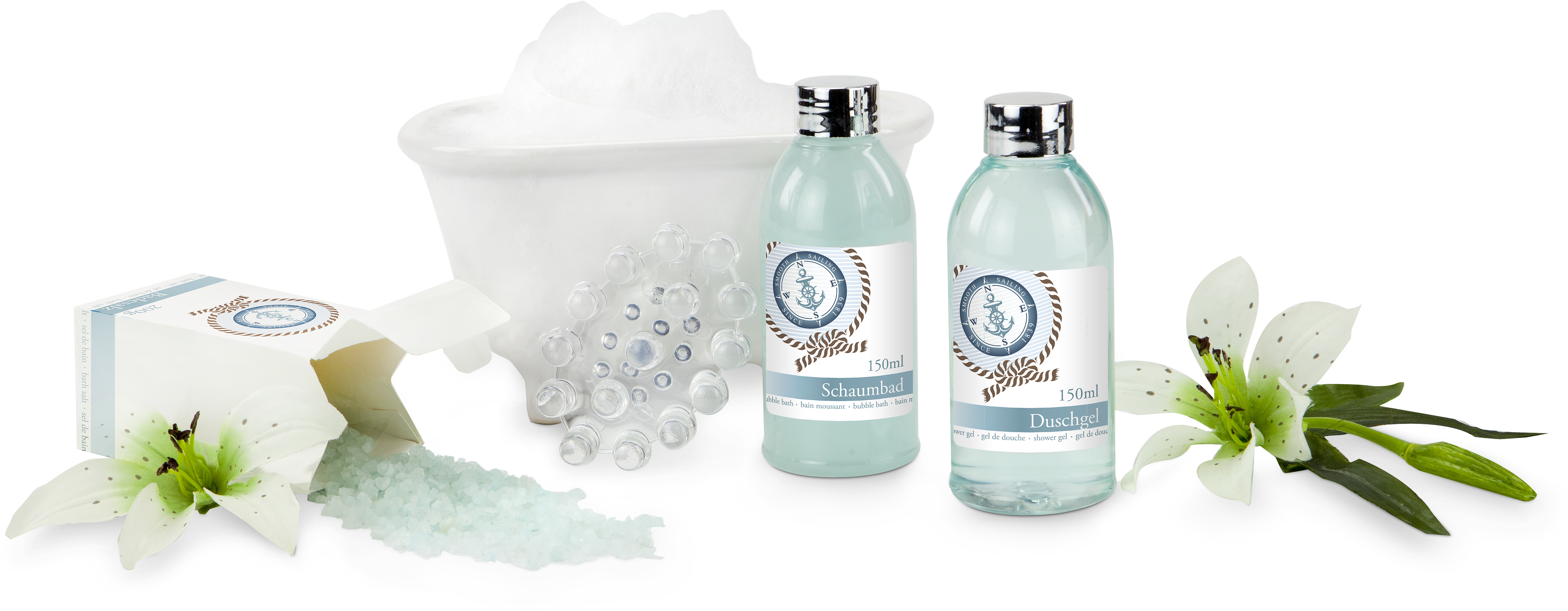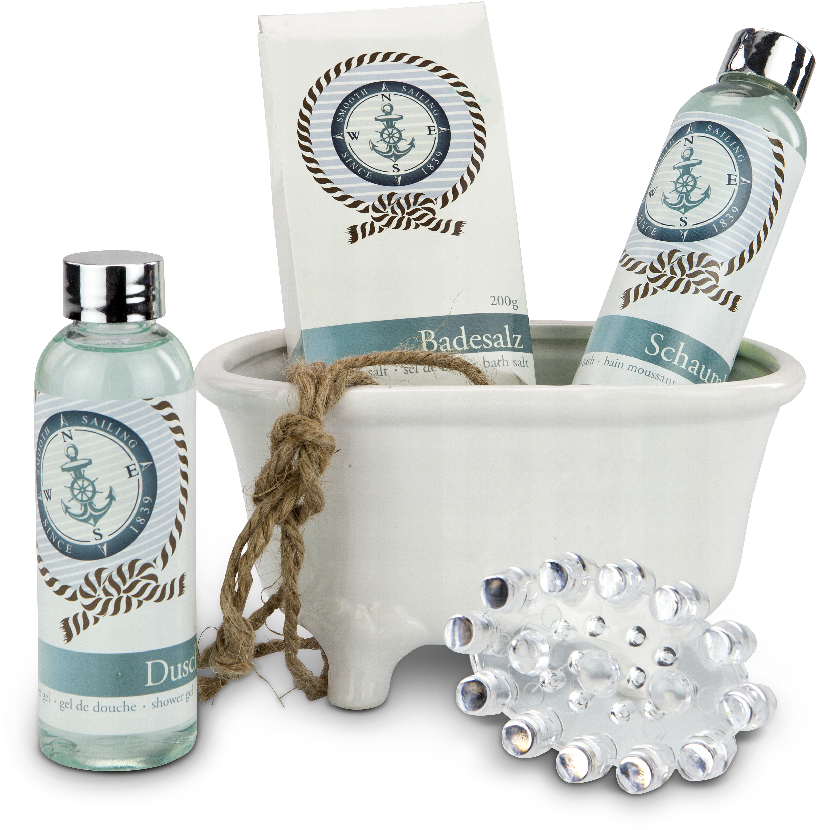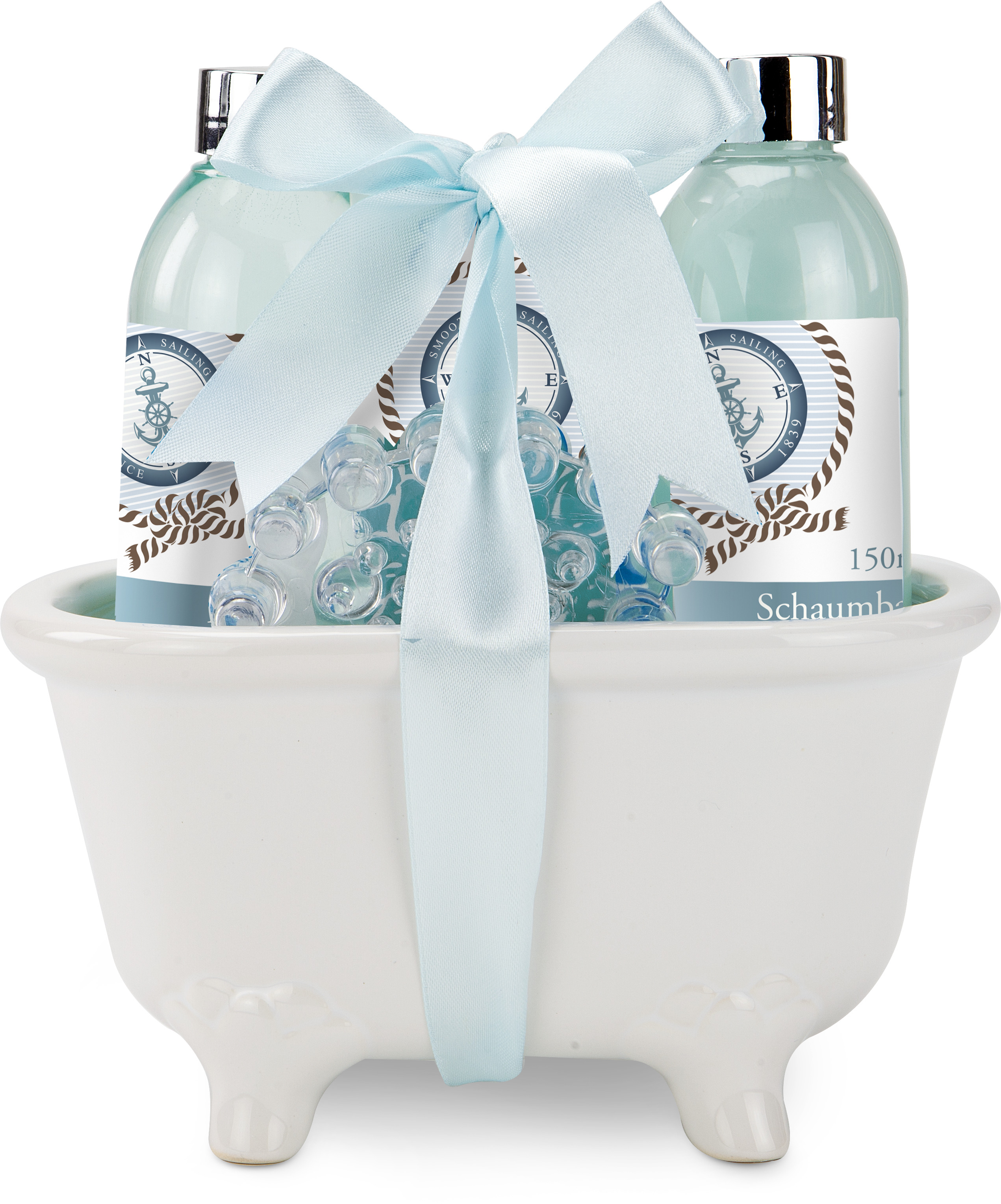Eine Wanne voller Entspannung bietet dieses Set. 150 ml Duschgel, 150 ml Schaumbad, 200 g Badesalz sowie eine Massagebürste aus Kunststoff sind stilvoll verpackt in einer weißen Keramik-Badewanne. Duft Ocean.