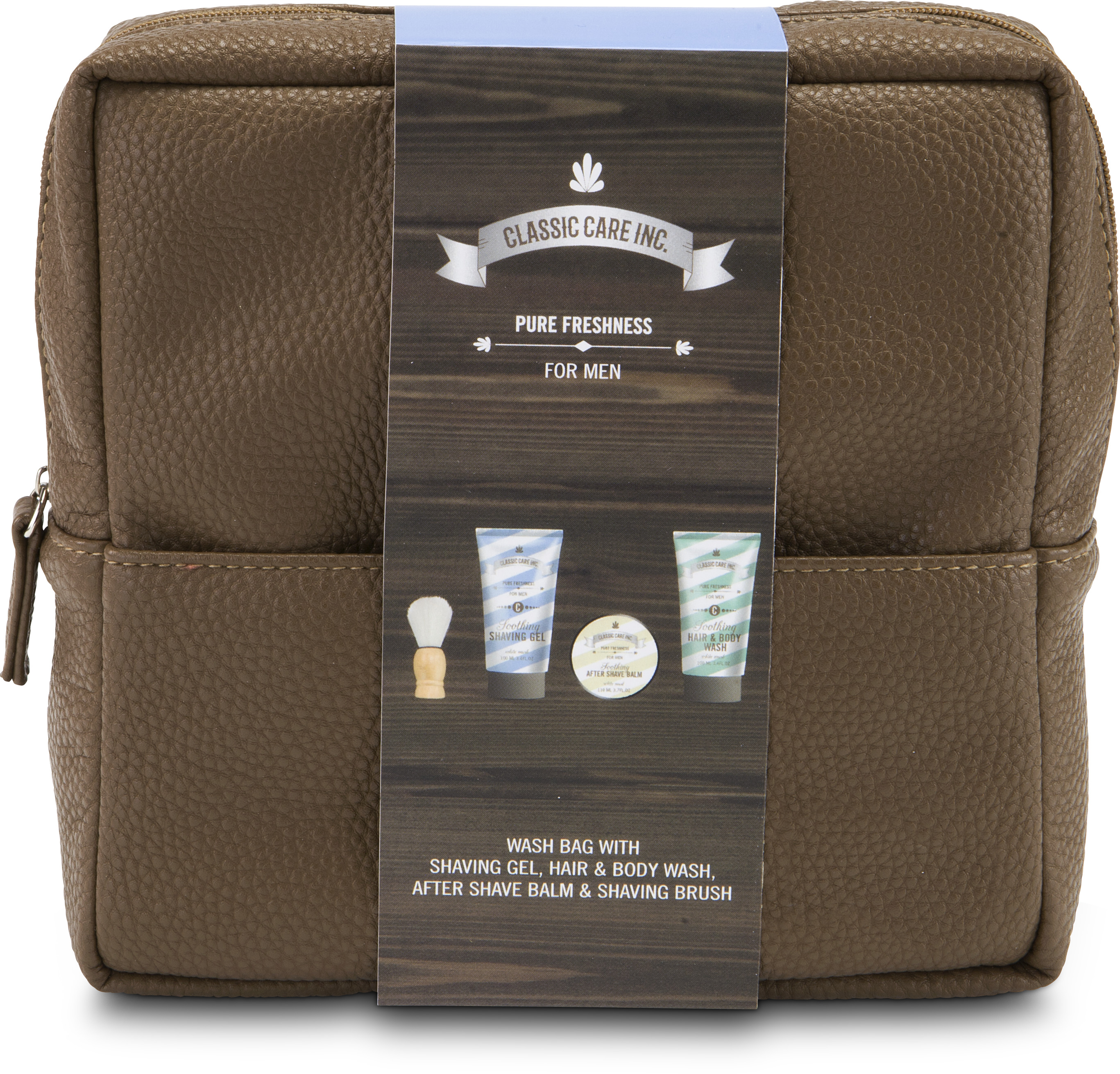 Sind Sie bereit für Ihre nächste Reise? Wir sind es! Die braune Kosmetiktasche ist gefüllt mit 100 ml Rasiergel, 100 ml 2in1 Duschgel & Shampoo, 110 ml After Shave Balsam und einem Rasierpinsel. Eben all das was Sie für Ihre nächste Geschäftsreise oder Urlaub benötigen. Auch 'Sie' können Sie mitnehmen: Classic Care - für Sie (WS183-33). Duft: Weißer Moschus.