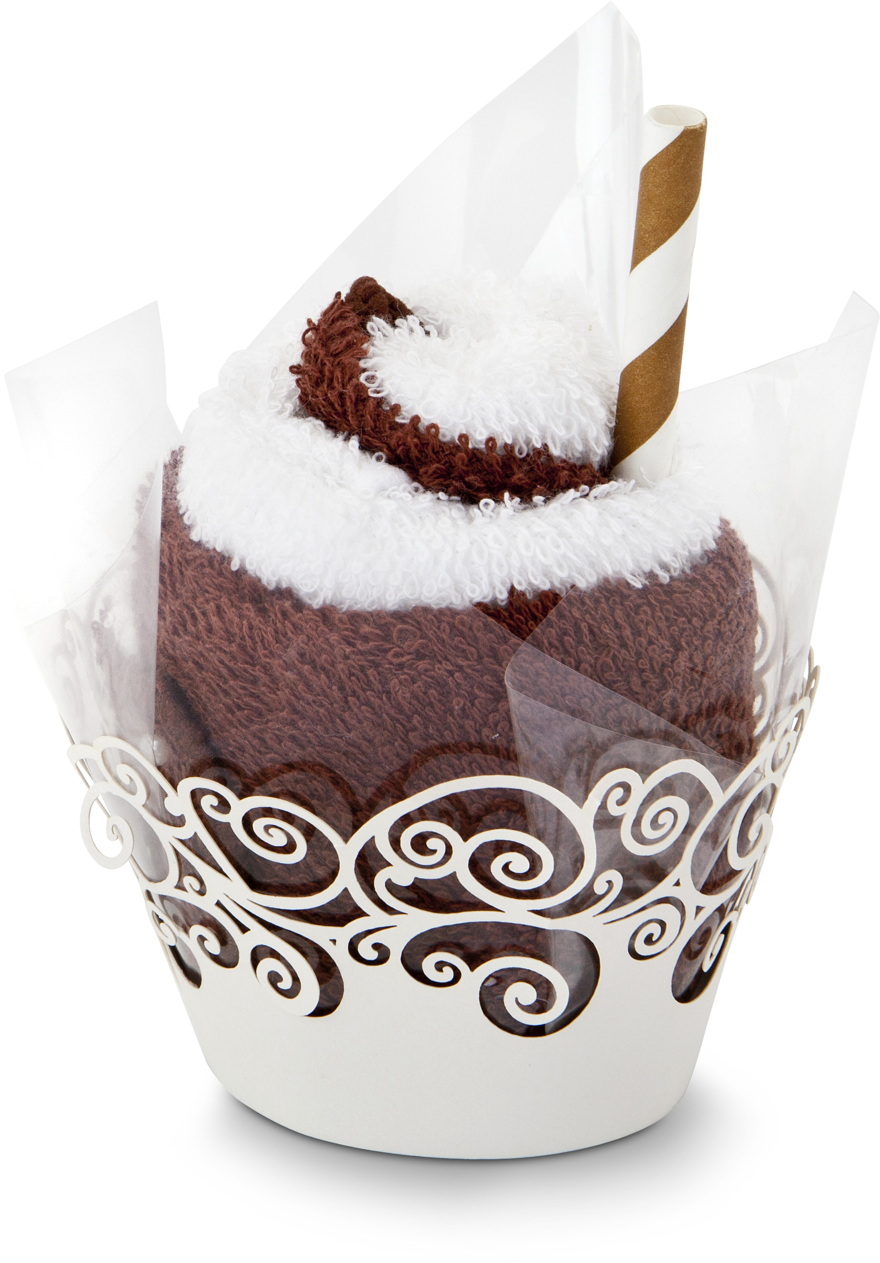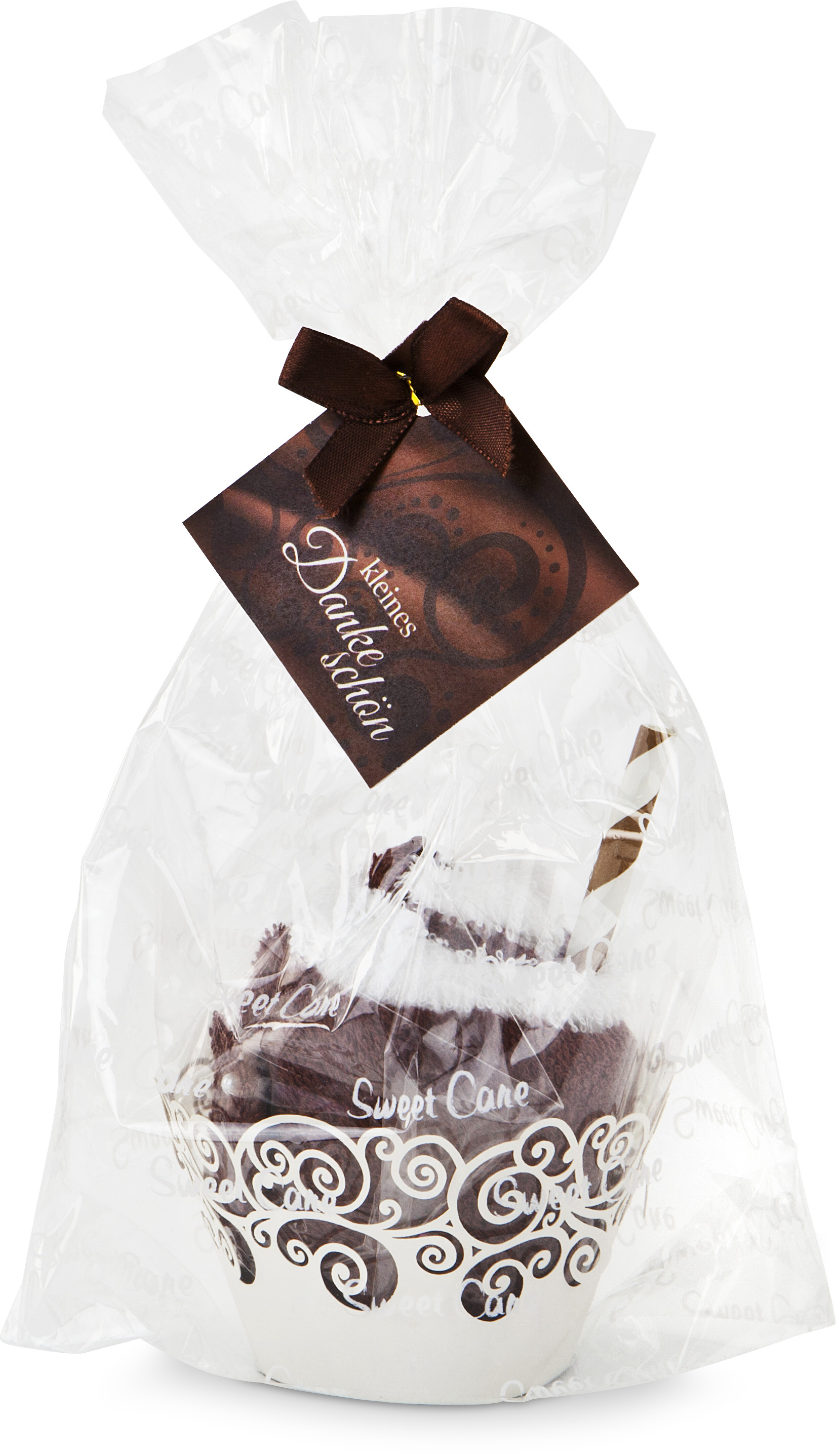 Ein Cupcake ganz ohne Kalorien und schlechtes Gewissen. Eine originelle Geschenkidee, die garantiert für Freude sorgt. Zwei Gesichtstücher in Weiß und Braun (ca. 20 x 20 cm und 30 x 30 cm) wurden geschickt zu einem kleinen, schmackhaften Muffin gerollt. Als dekoratives Highlight wurde der kleine Kuchen noch mit einem "Schokoröllchen” garniert. Die Handtuchtorte kommt hübsch verpackt in transparenter Geschenkfolie mit Schleife und ist somit direkt Übergabe bereit bei jeder Gelegenheit.