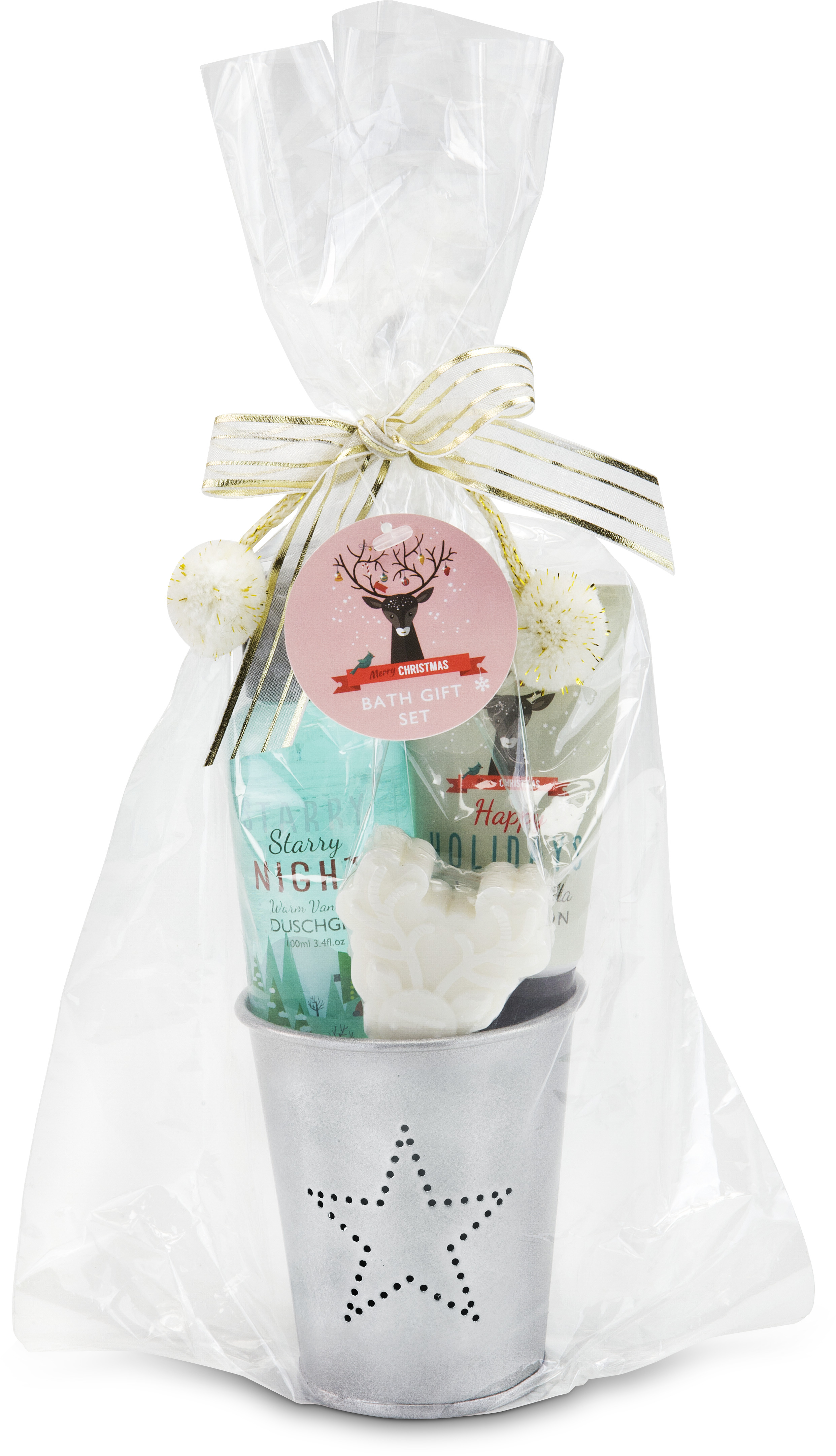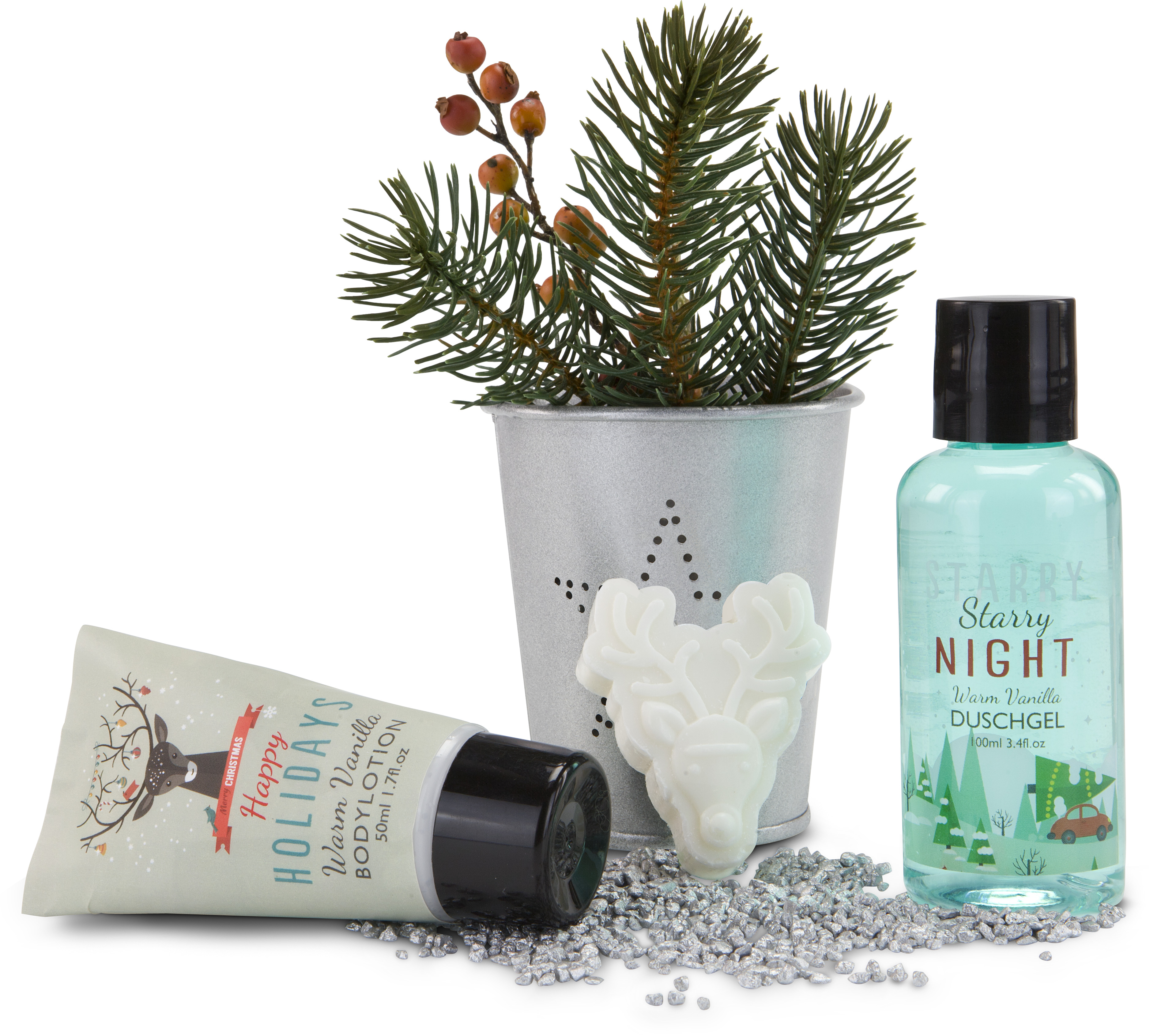 Gerade in der kalten Jahreszeit benötigen wir besondere Pflege. Dieses Set beinhaltet alles was Ihnen guttut: 100 ml Duschgel, 50 ml pflegende Body Lotion und 30 g Seife in Rentierform mit dem Duft nach warmer Vanille und Lindenblüten. Verpackt im silbernen Metallbecher mit Sternstanzung und liebevollem Rentieranhänger.