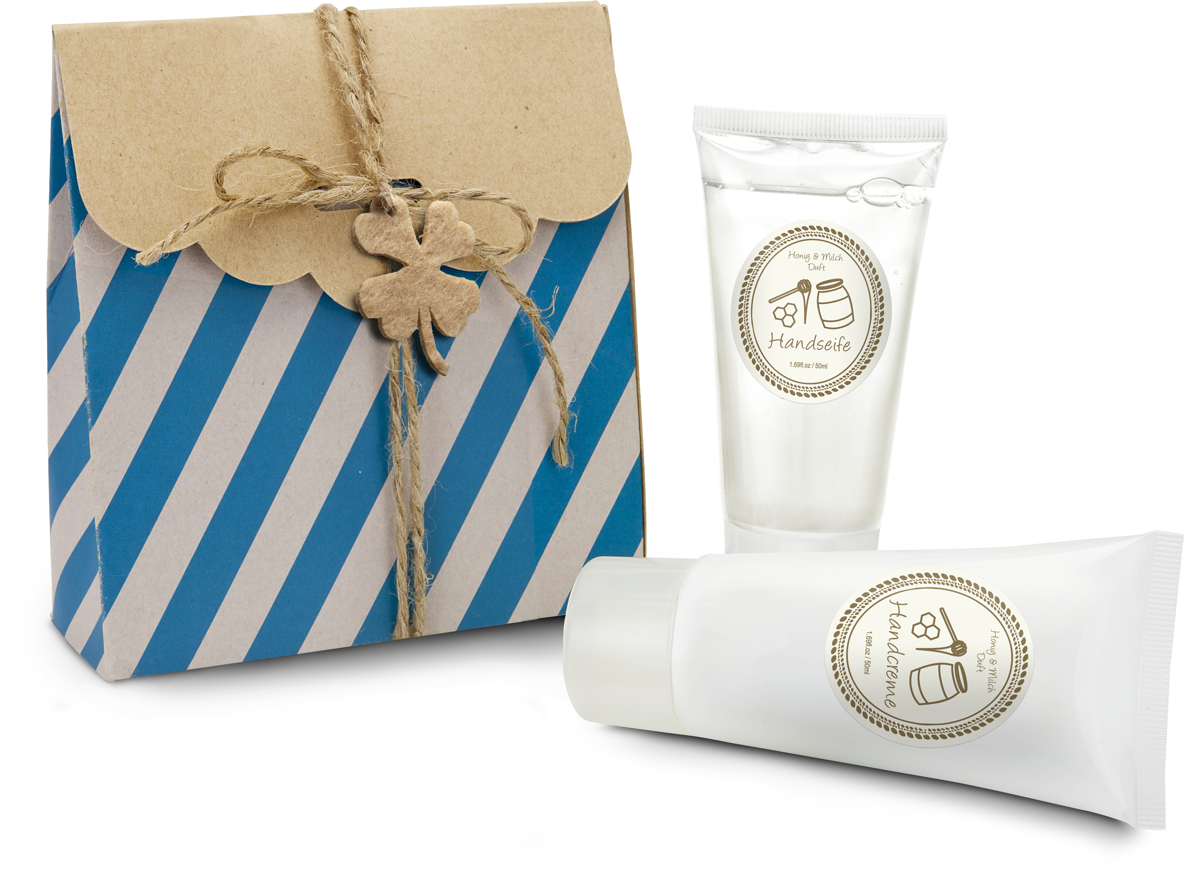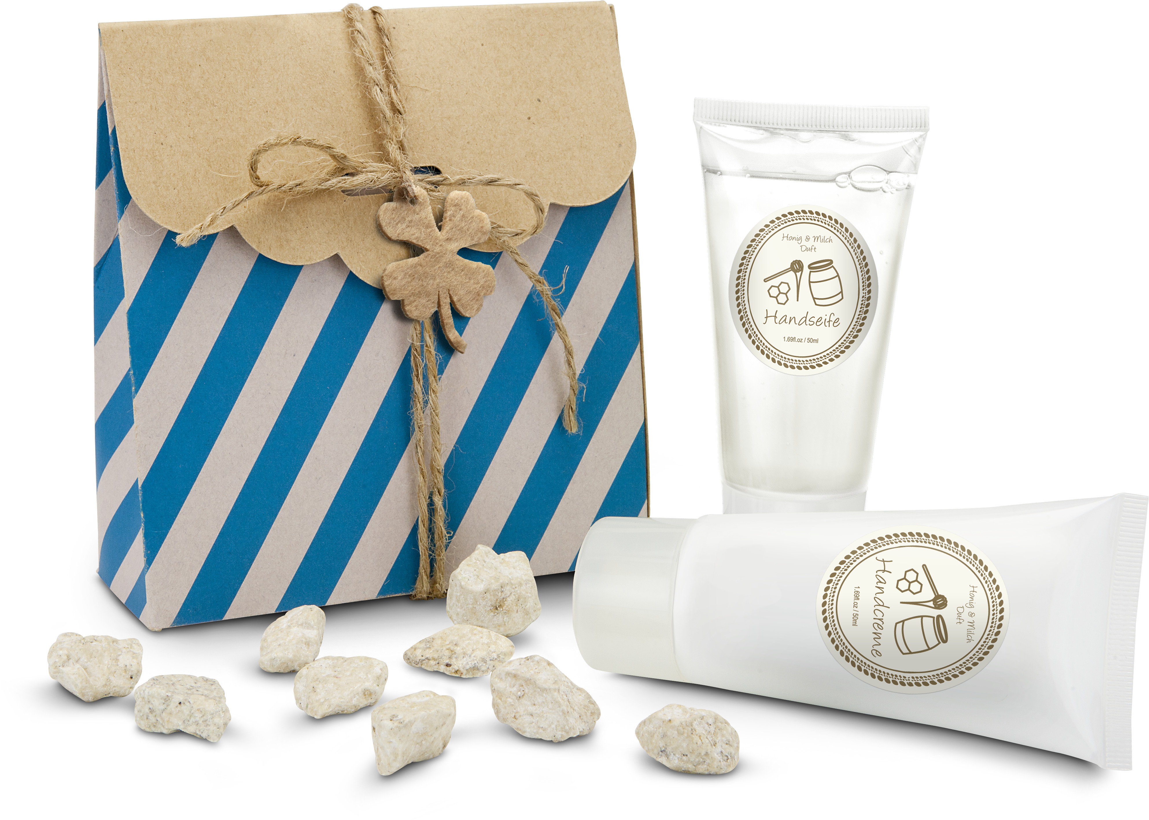 Verschenken Sie ein paar Glücksmomente für Ihre Hände. Diese süße Geschenktüte mit dekorativen Streifen und einem kleinem Kleeblatt Anhänger aus Filz ist mit 50 ml Handseife und 50 ml Handcreme der Duftrichtung Milch und Honig bestückt damit sich Ihre Hände jeder Zeit frisch und gepflegt anfühlen.