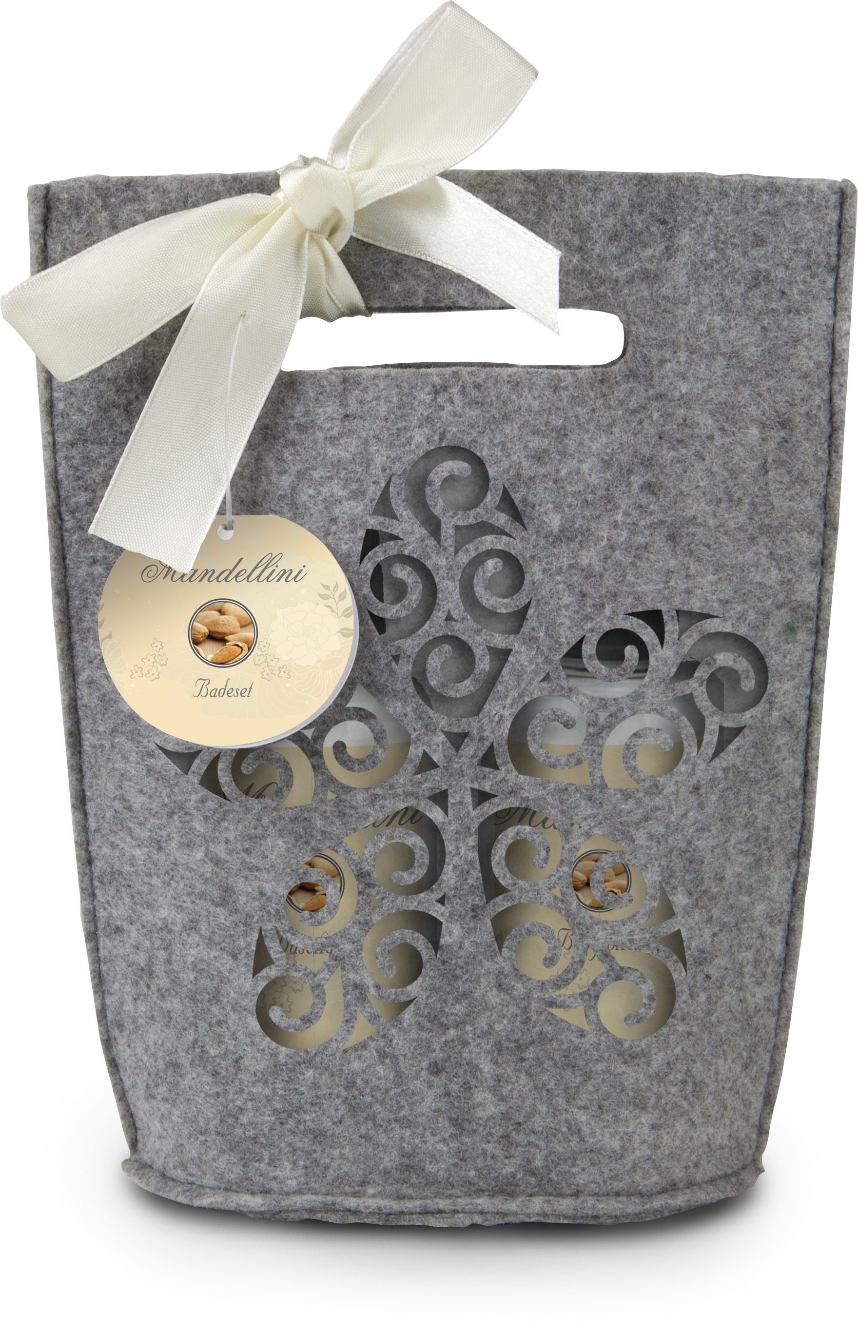 Diese kleine aber feine Filztasche mit dekorativer Ausstanzung enthält je 100 ml Duschgel und Bodylotion. Ein kleines Präsent, das von Herzen kommt. Duft: Mandelmilch