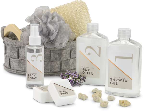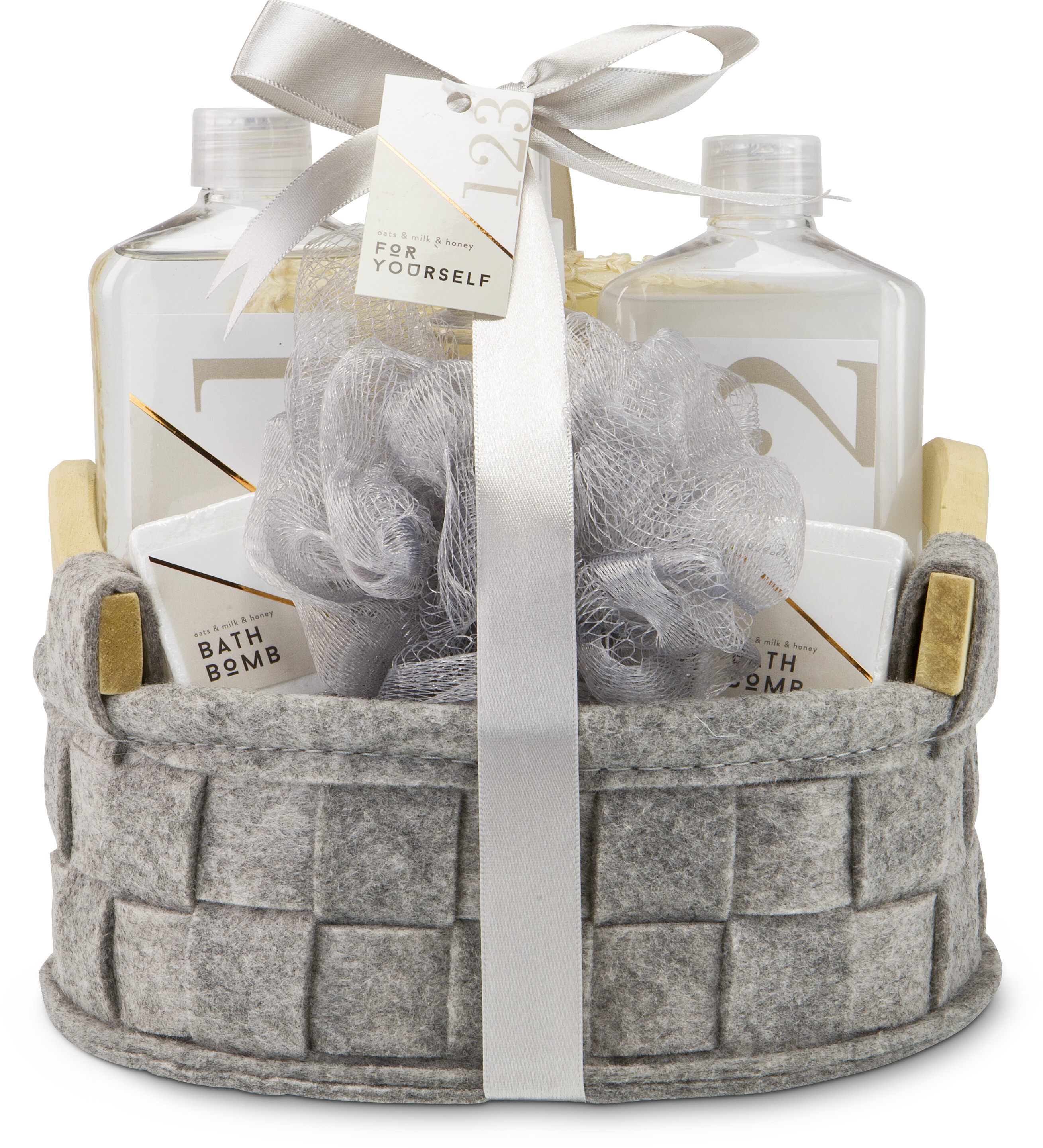 Milch verwöhnt Körper und Seele - das wusste Cleopatra schon. Unser Set Mjölk kombiniert den angenehmen Duft von Milch mit Honey & Oats. 280 ml Duschgel, 280 ml Body Lotion, 105 ml Körperspray, 2 x 40 g Badebomben, Mesh-Schwamm in grau und Sisal-Schwamm sind verpackt in einem dekorativen Filzkorb in dezentem grau.