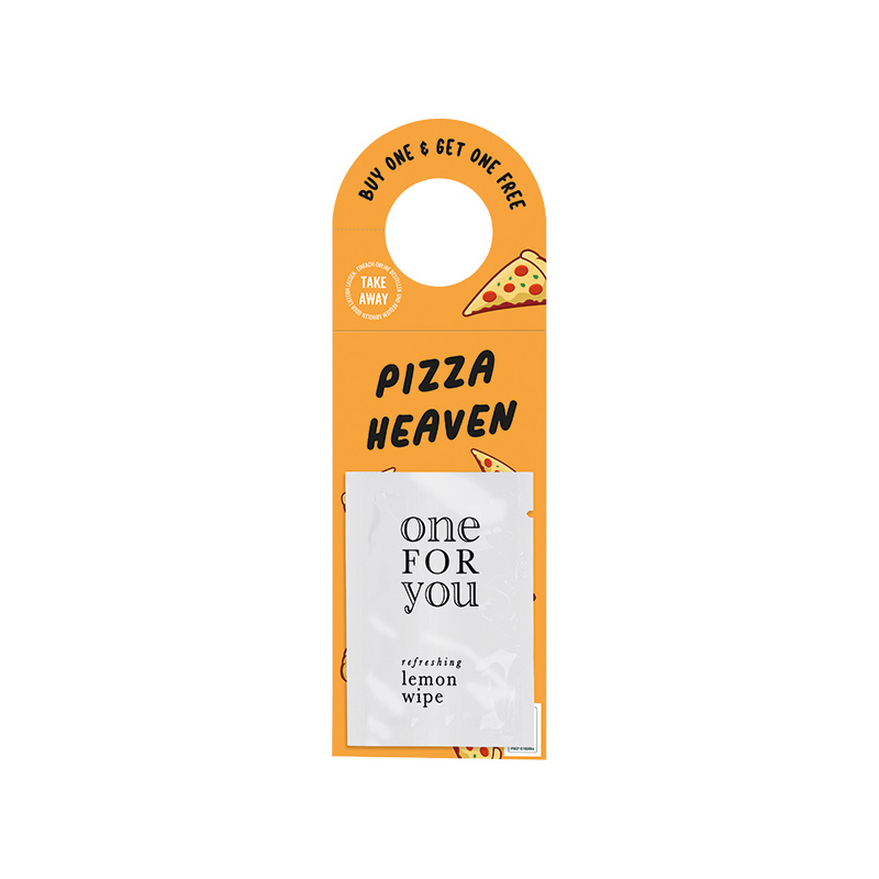 Werbeanhänger komplett aus Karton individuell bedruckt. Inhalt: 1 Tütchen mit einem Erfrischungstuch mit zartem Zitronenduft, 7 g