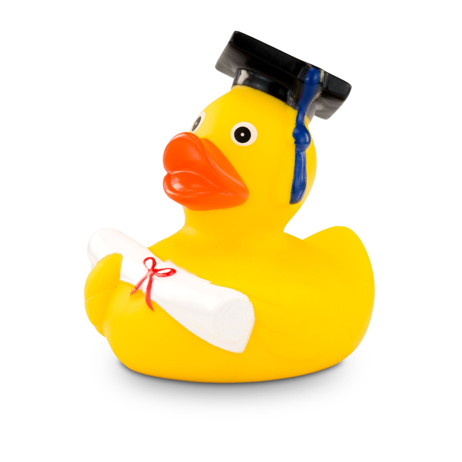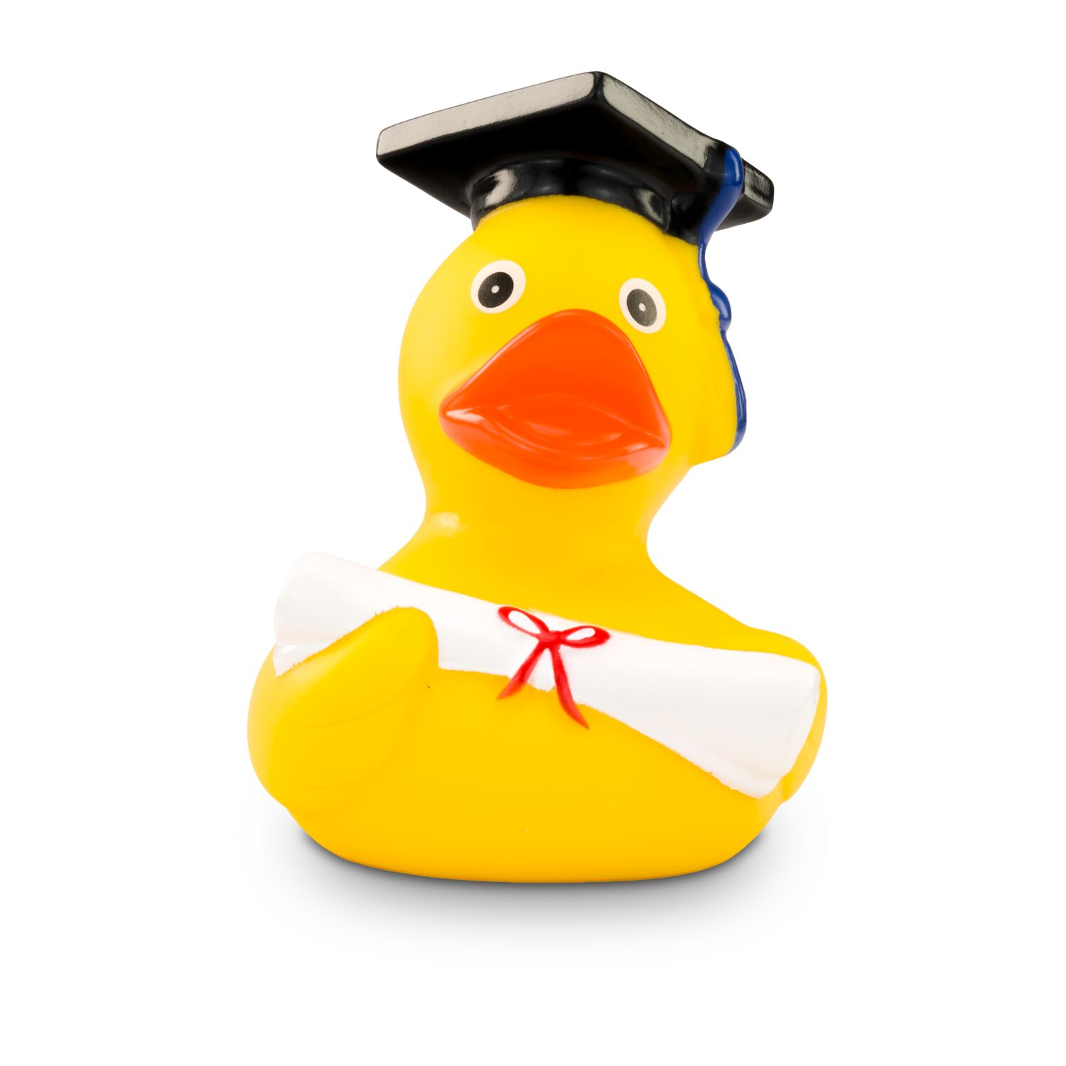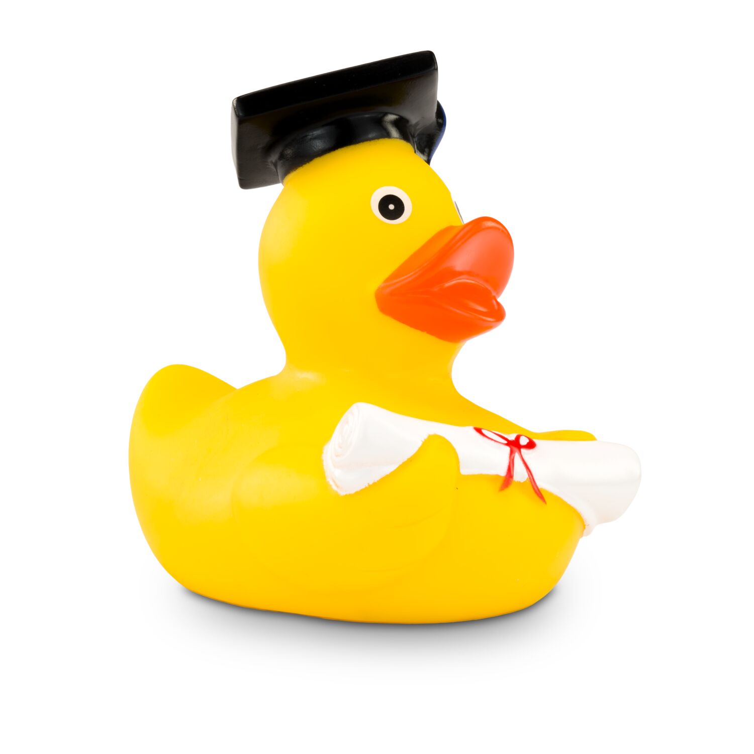 Albert Akademiker ist der schlauste Schnabel im Ententeich. Stolz trägt er seinen Absolventenhut und sein Diplom in der Hand. Er hat die Enten-Uni abgeschlossen und während seinem Bachelor und Master sehr viel gelernt, was er für seinen Doktortitel nutzen konnte. Größe: ca. 8 cm. Inklusive Quietschventil