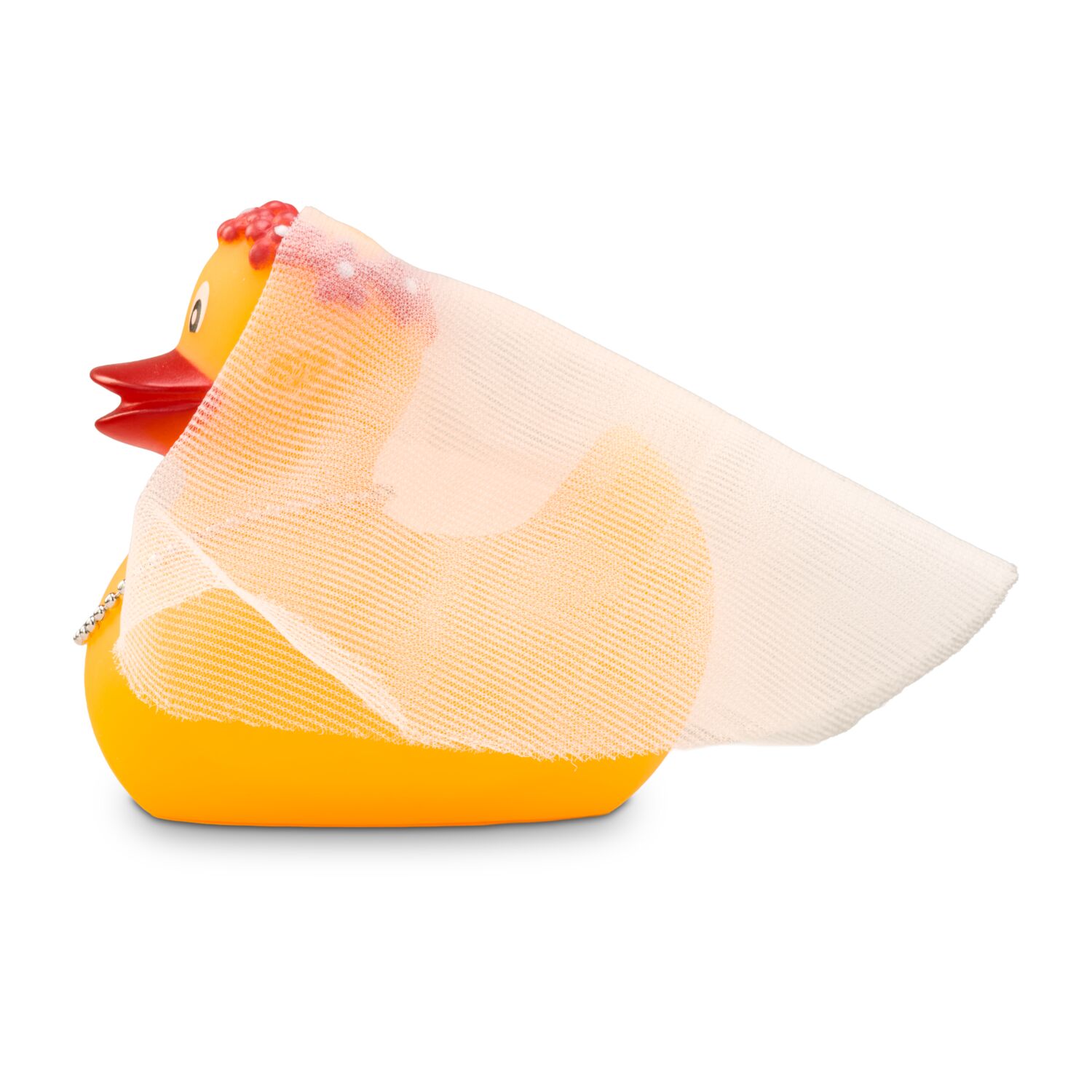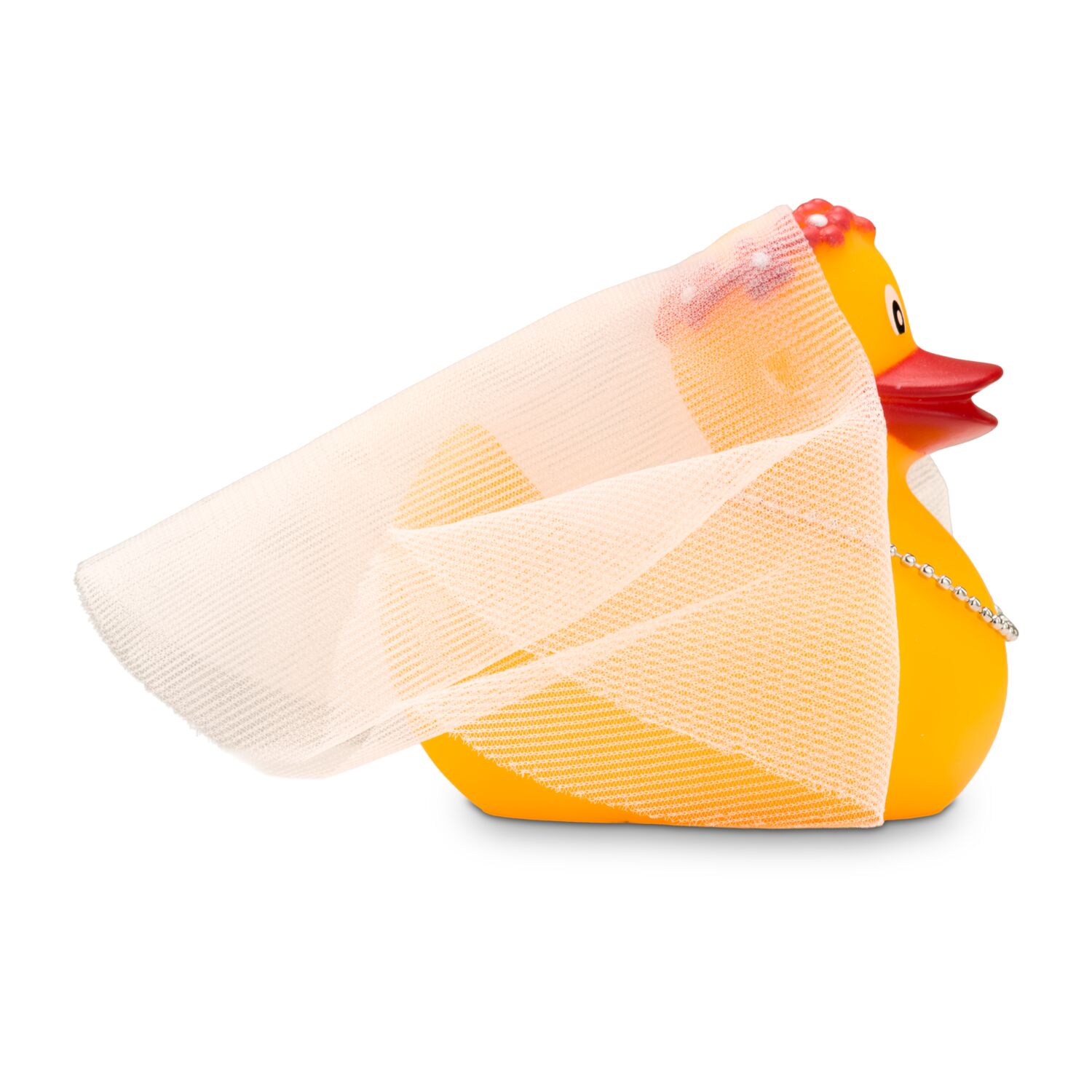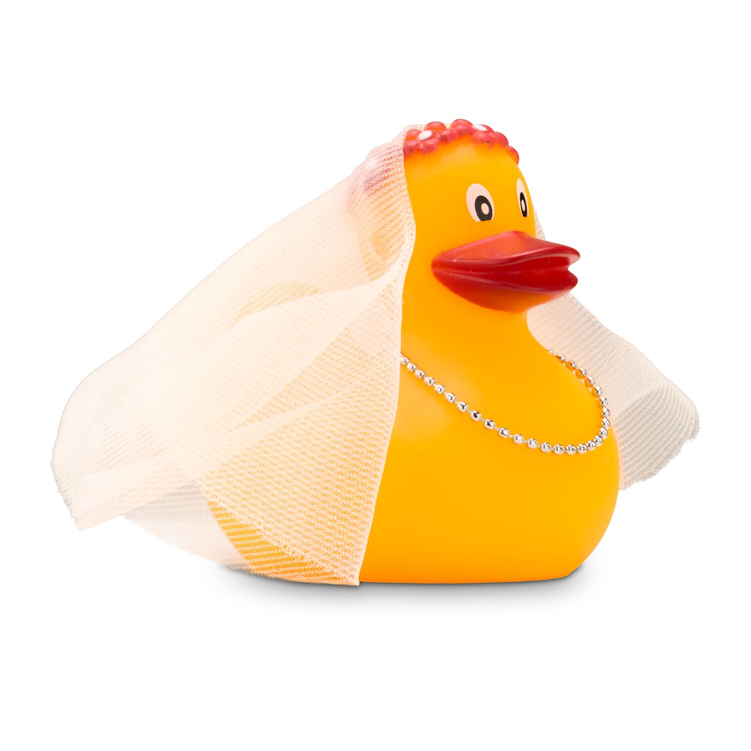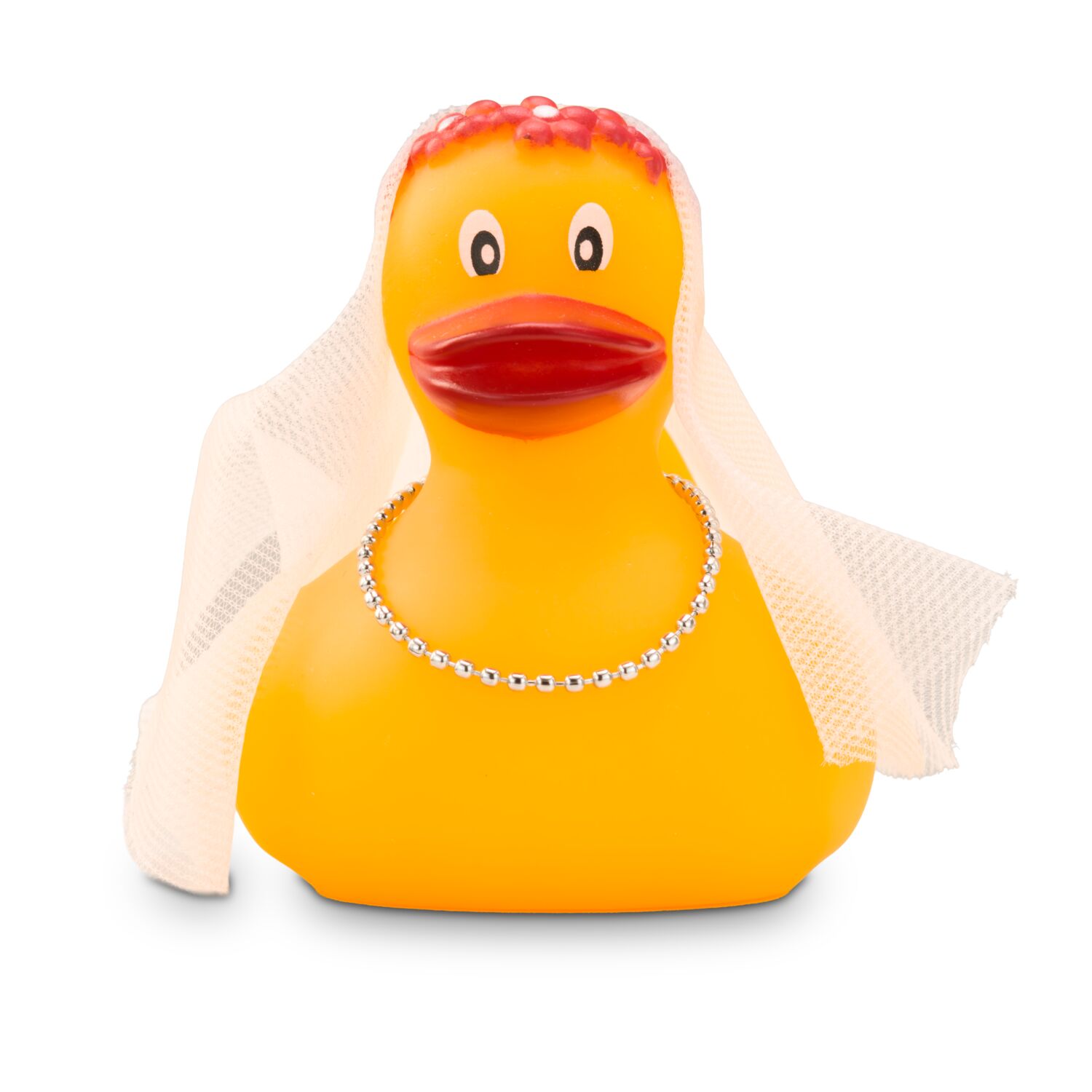 Bonnie Braut watschelt anmutig zum Altar. Mit einem echten Schleier aus Tüll, der von dem rosa Diadem gehalten wird und einer Perlenkette um den Hals ist die Badeente im Kleinformat für ihren großen Tag bestens ausgestattet. Originelle Badeente für Hochzeiten und Junggesellinnenabschiede. Größe: ca. 6 cm. Inklusive Quietschventil