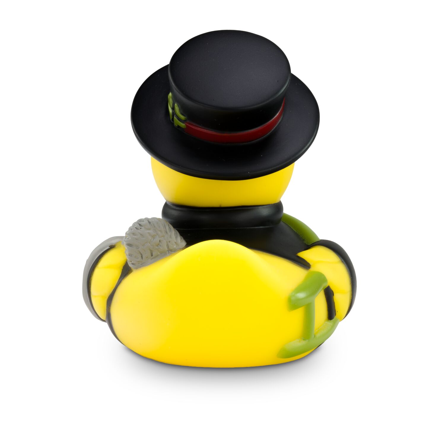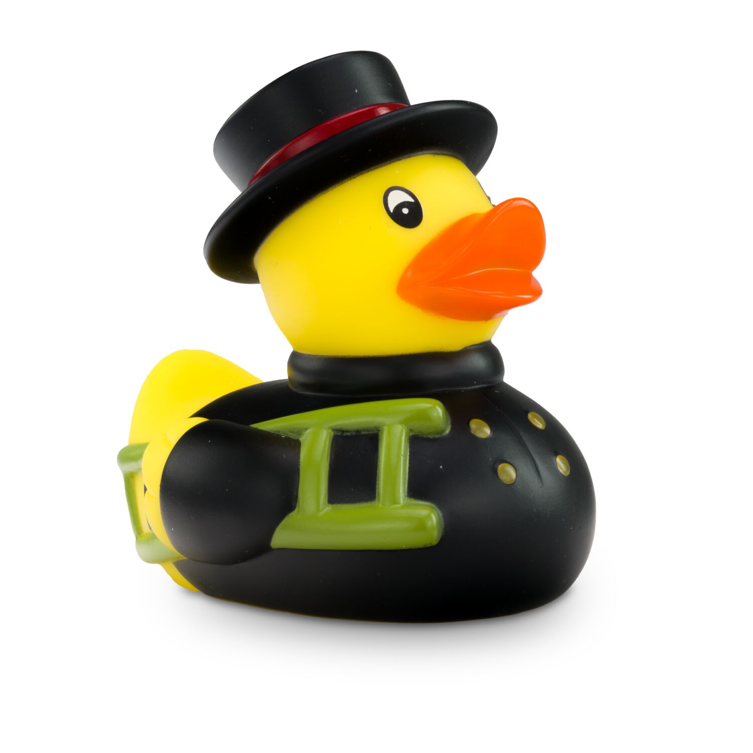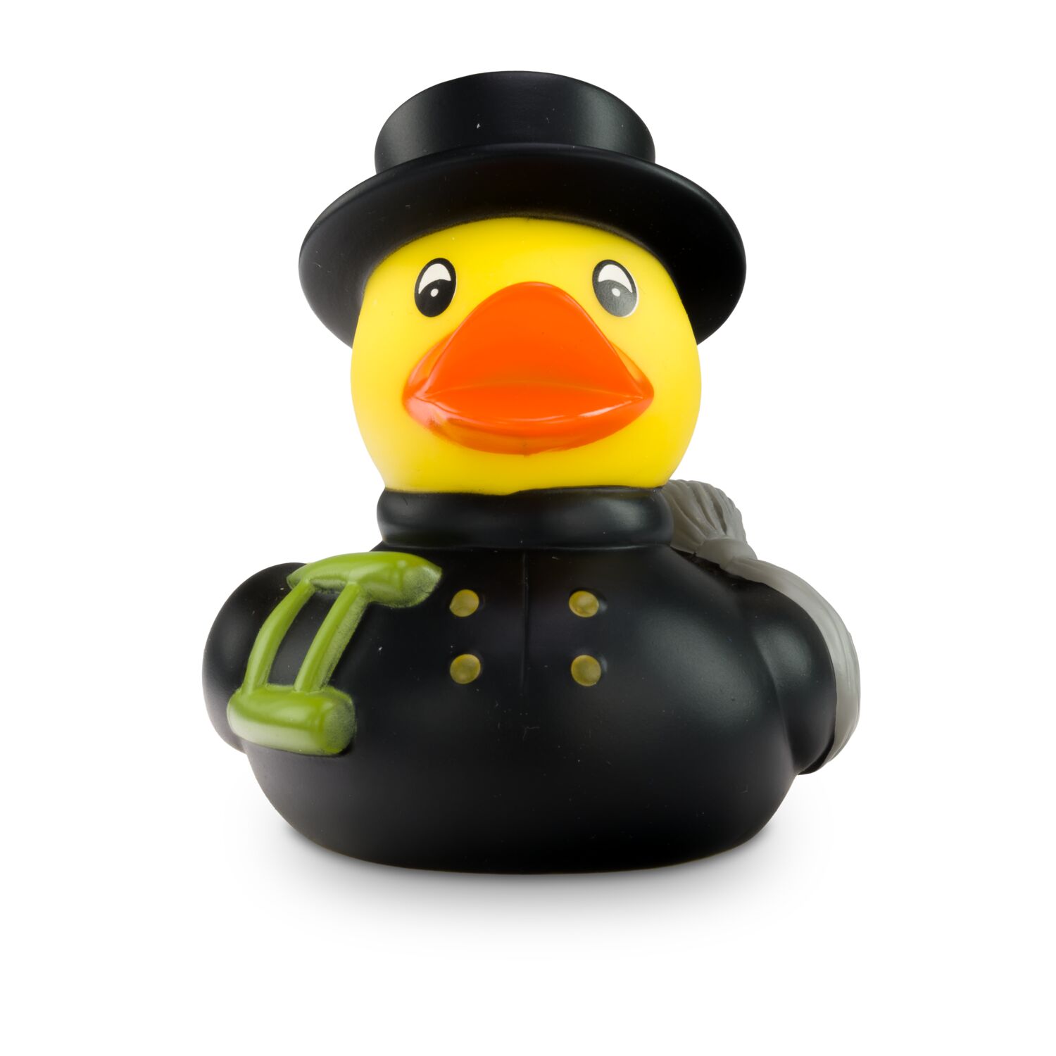 Felix Fegeglück ist der Meister unter den Schornsteinfegern. Er ist in perfekter Uniform in schwarz gekleidet und trägt einen großen schwarzen Zylinder, der ihn vor dem ganzen Ruß schützt. Eine Berufsente, die zudem Jedermann Glück bringt. Größe: ca. 8 cm. Inklusive Quietschventil