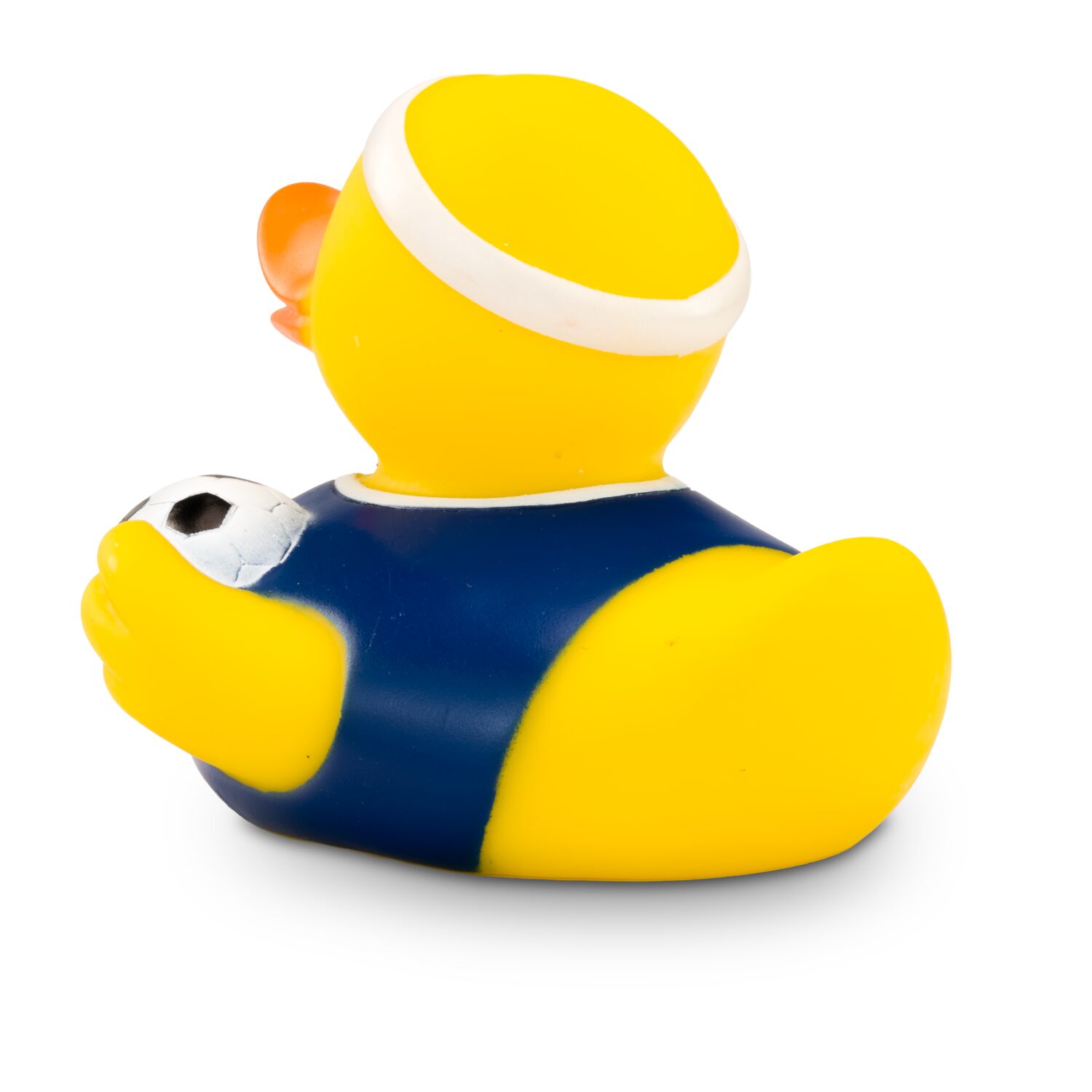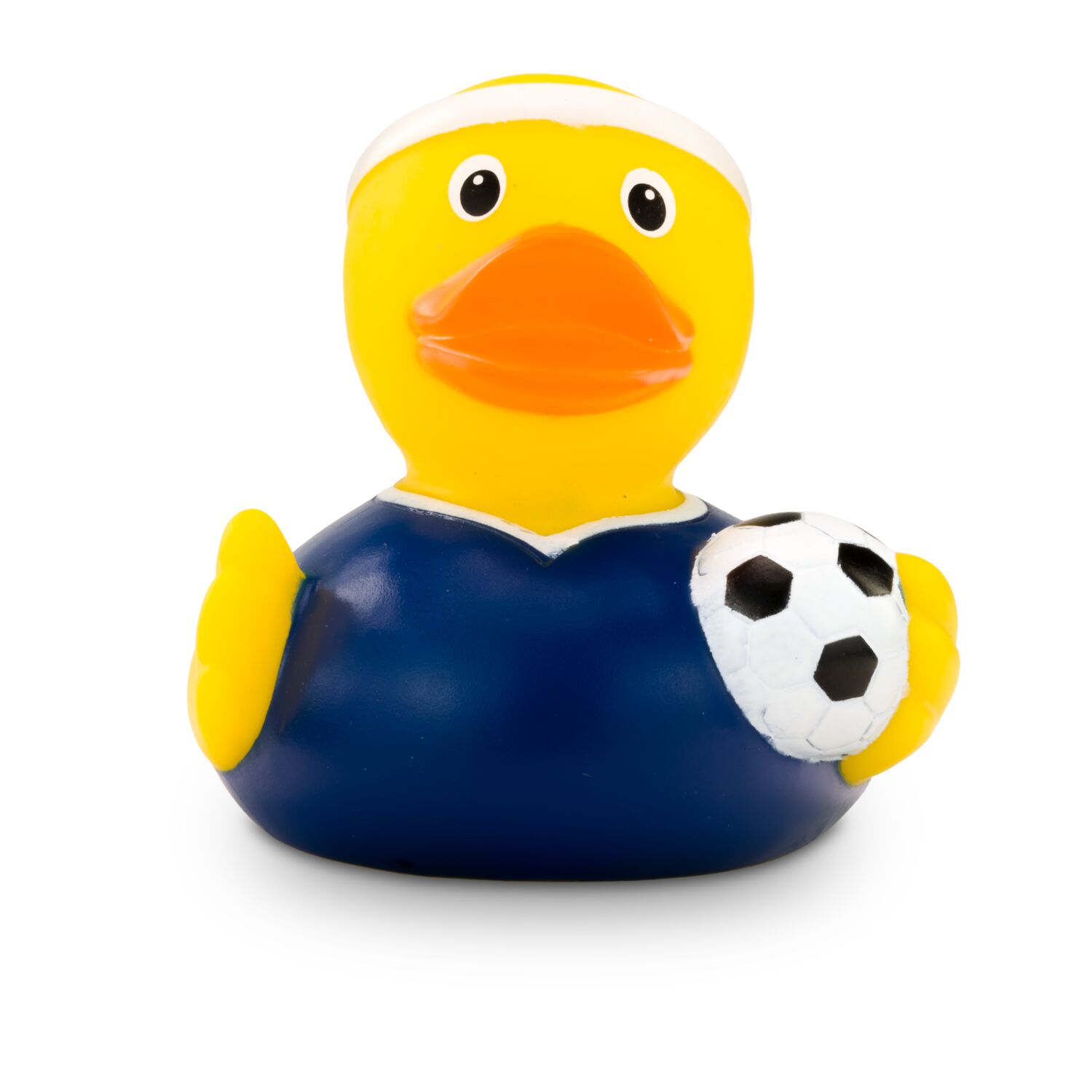 Fritz Freistoß ist der gefürchtetste Stürmer in der Enten-Fußballliga! In seinem blauen Trikot, dem Stirnband auf dem Kopf und mit Ball unter dem Arm macht er sich gerade bereit für den nächsten Strafstoß. Als Profi-Fußballer bringt er Stadion-Feeling in die Badewanne. Größe: ca. 8 cm. Inklusive Quietschventil