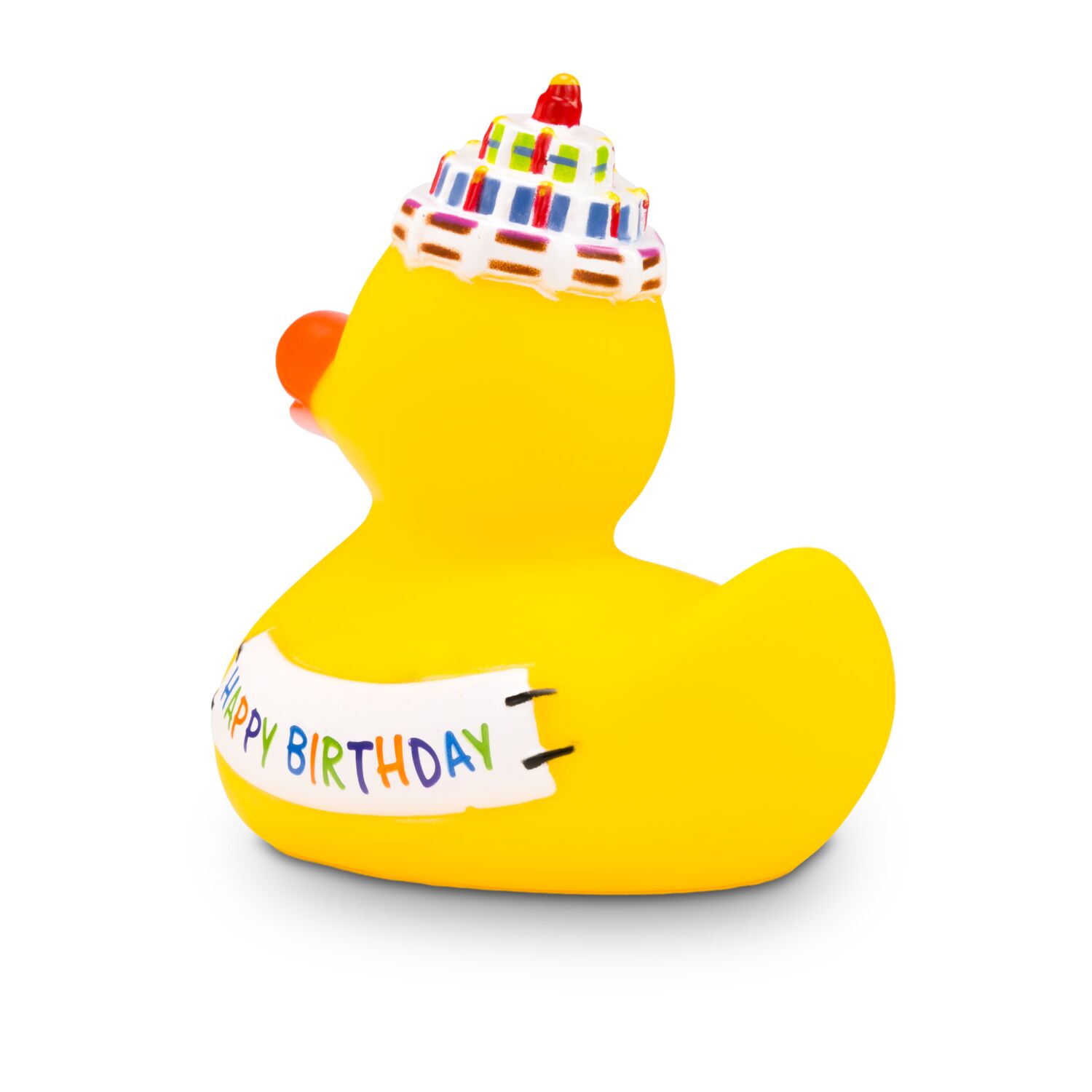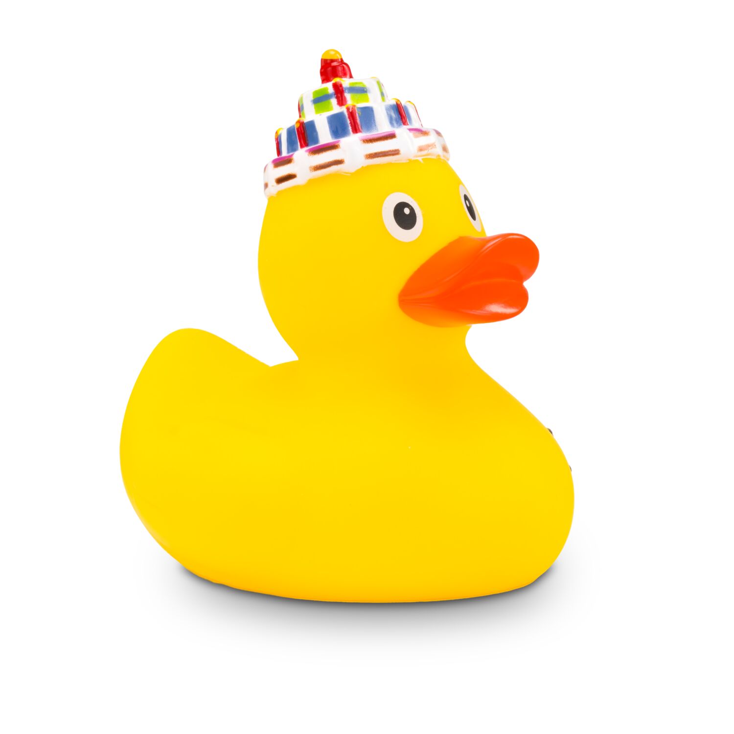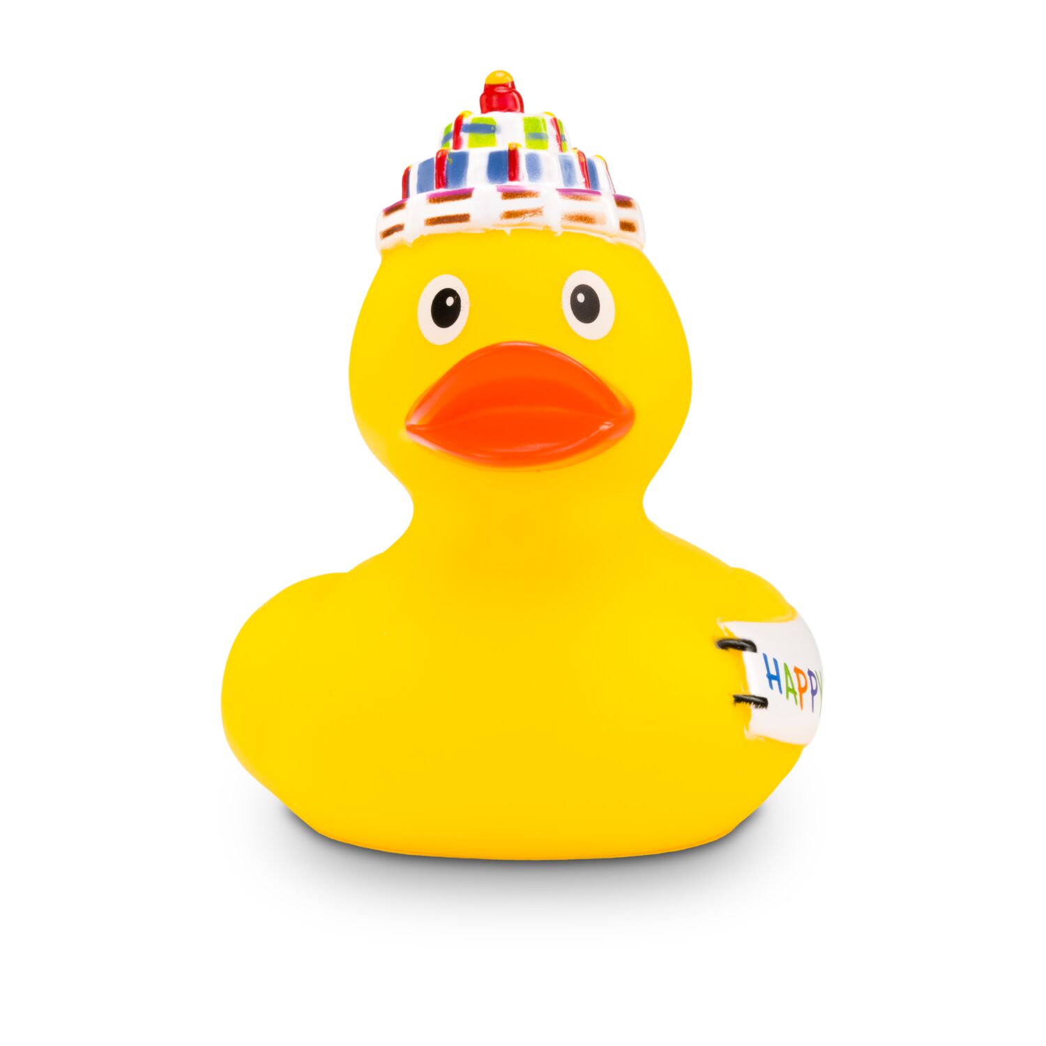 Die fröhliche Quietscheente Gabi Geburtstag ist eine originelle Geburtstagsüberraschung. Sie trägt eine Geburtstagskuchenmütze mit Kerze auf dem Kopf und hat ein ‚Happy Birthday‘-Banner an der Seite. So sorgt diese Badeente garantiert für gute Laune bei jeder Feier. Perfekt als witziges Giveaway für jedes Alter, bringt diese Badeente Spaß, Farbe und ein Lächeln mit sich. Größe: ca. 8 cm. Inklusive Quietschventil