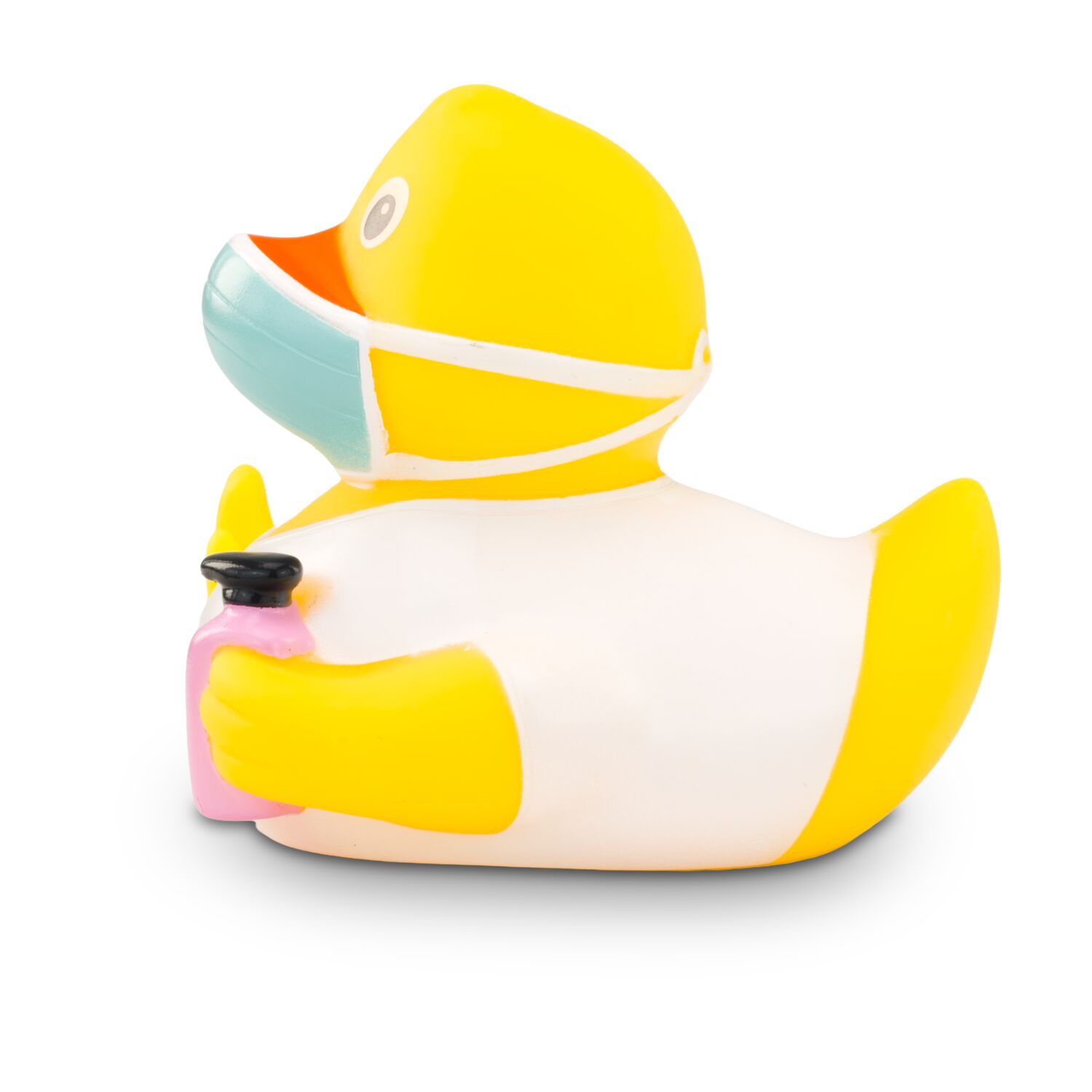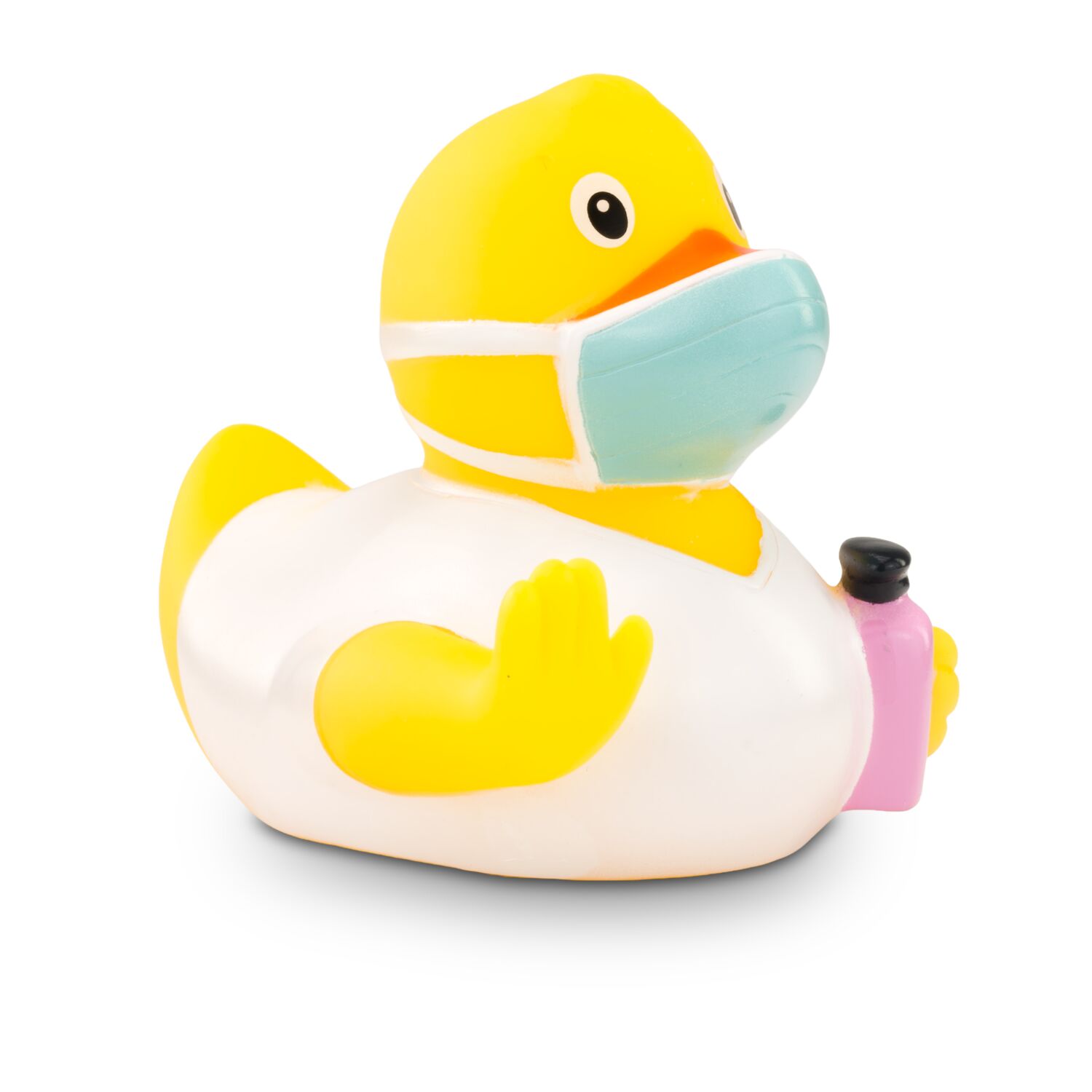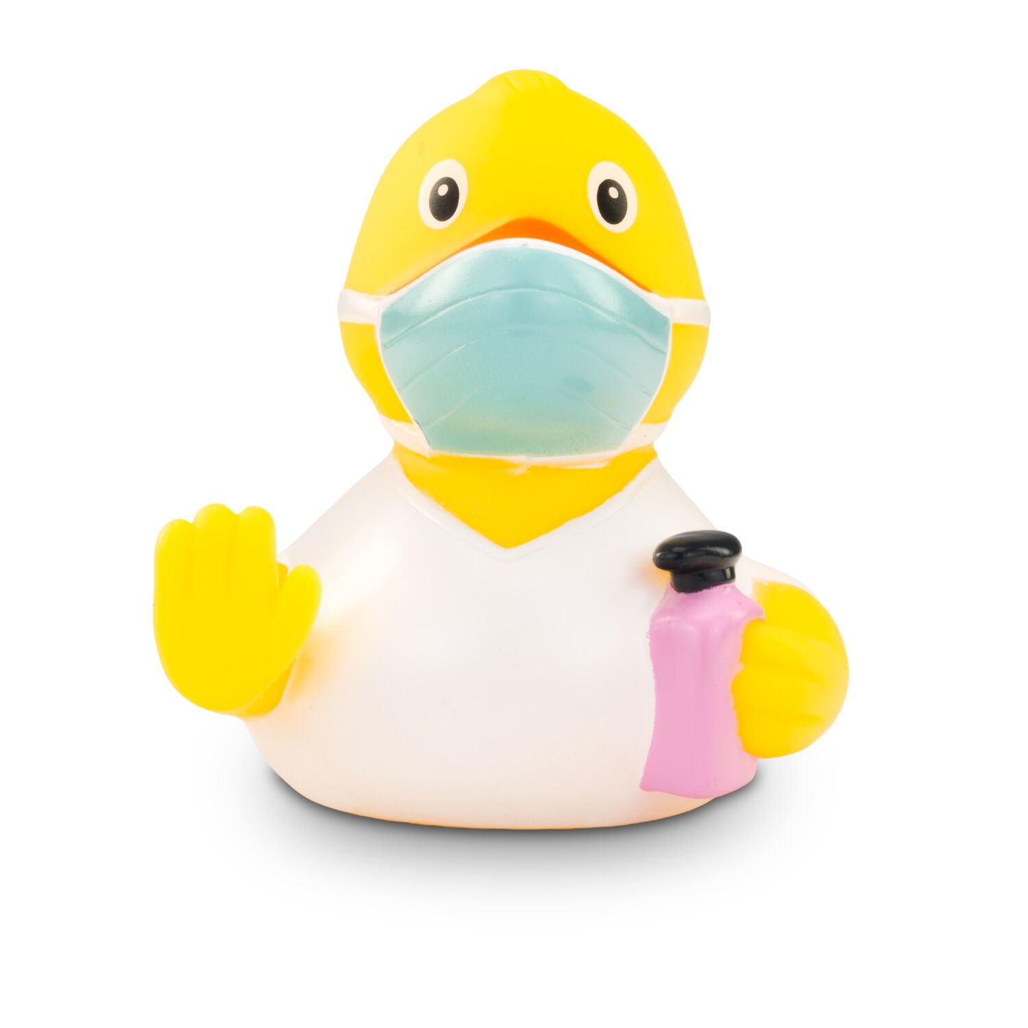 Gerda Gesund ist die Heldin der Hygiene. Mit ihrer türkisblauen Maske über dem Schnabel und einer Flasche Desinfektionsmittel unter dem Flügel sorgt sie im Krankenhaus, der Arztpraxis oder in der Pflege jederzeit für Wohlbefinden. Ihr weißer Arztkittel verkündet: Sie ist eine Ente mit Hygiene-Verantwortung. Größe: ca. 8 cm. Inklusive Quietschventil