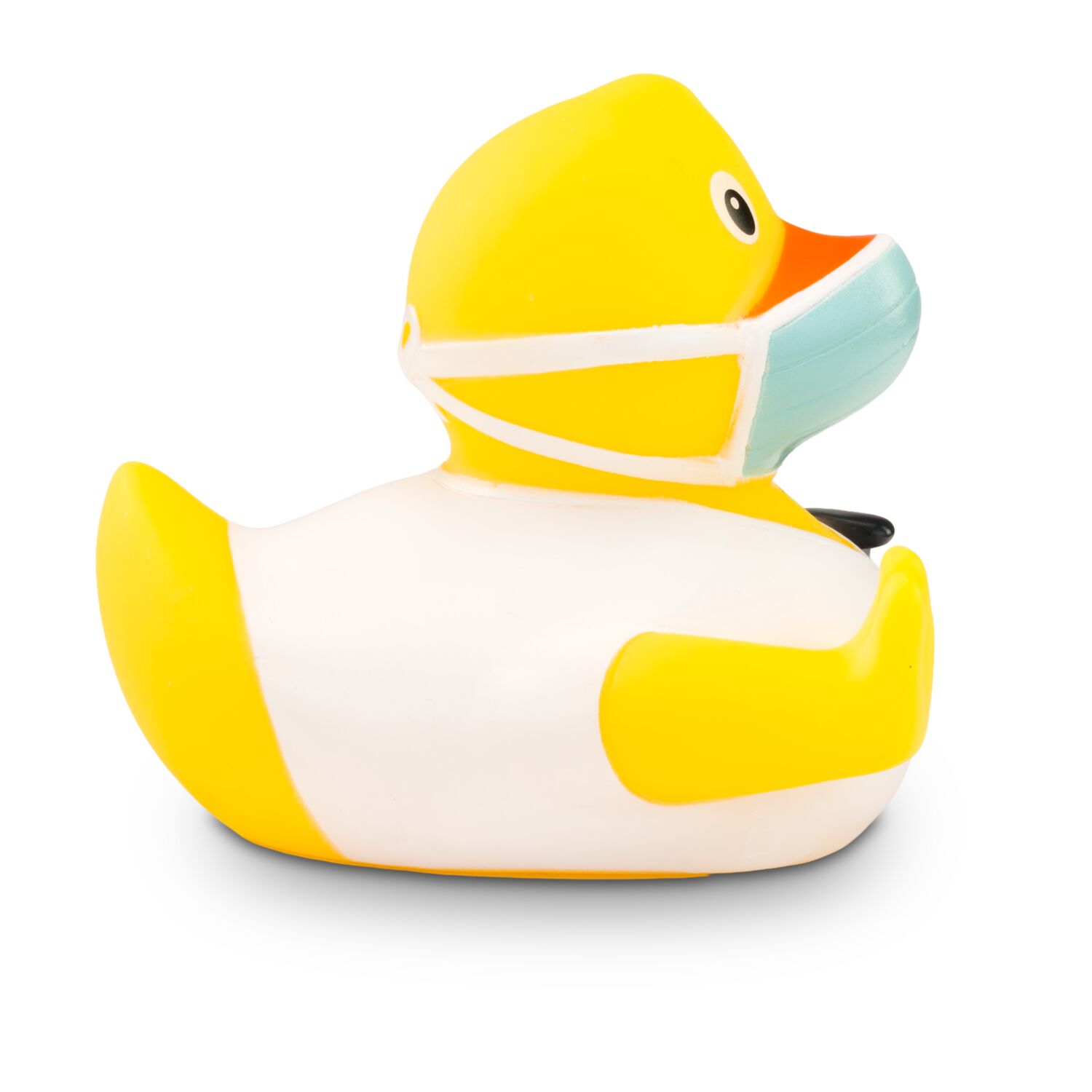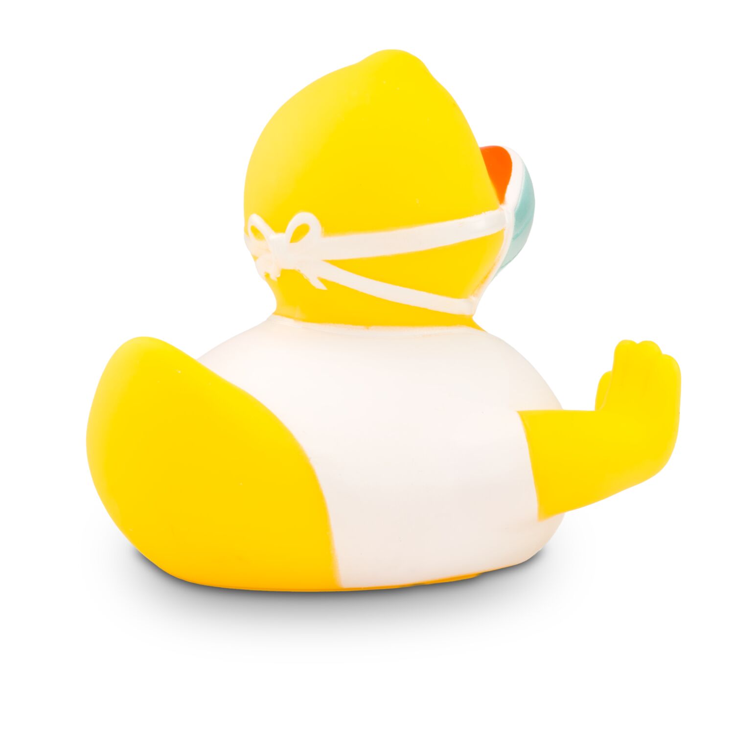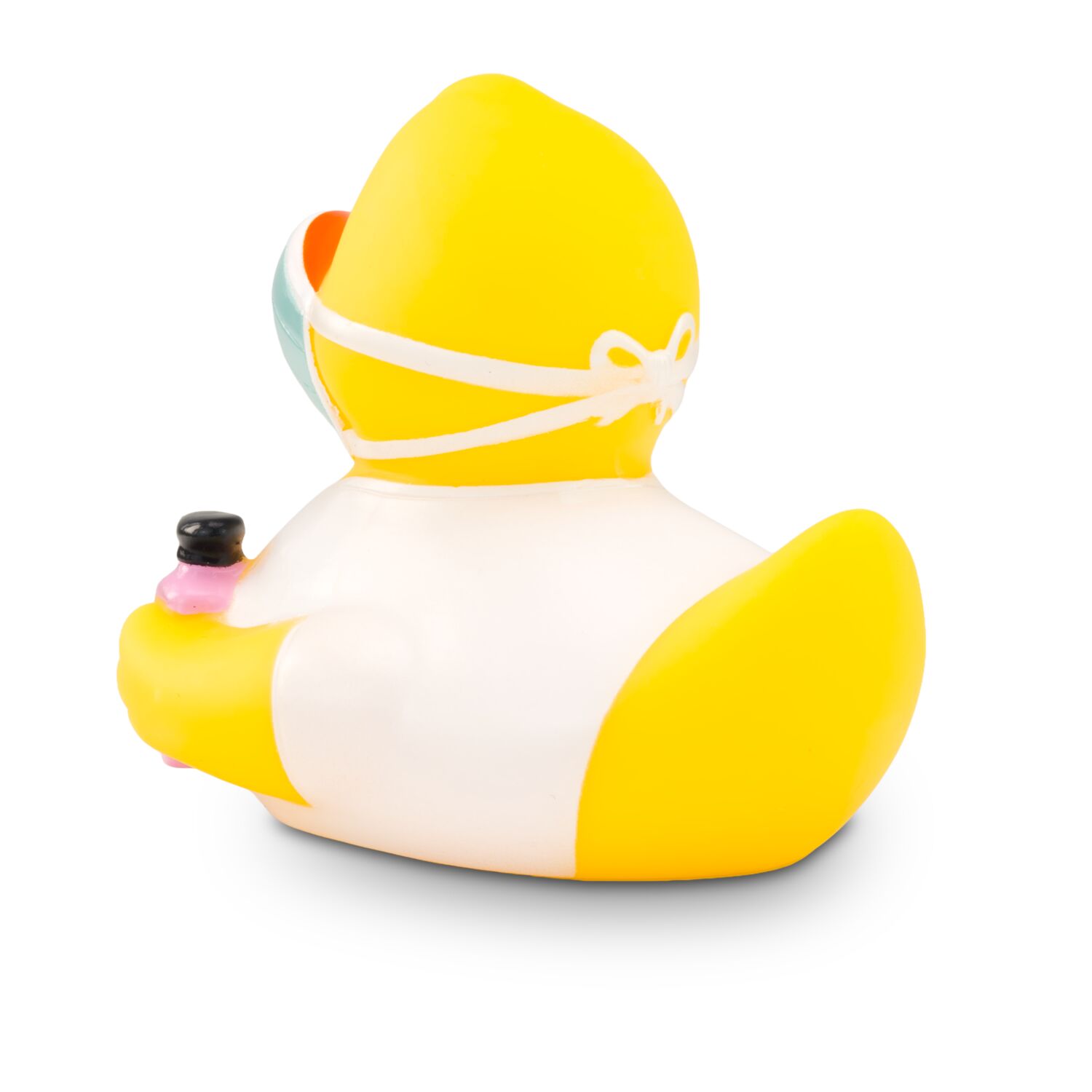Gerda Gesund ist die Heldin der Hygiene. Mit ihrer türkisblauen Maske über dem Schnabel und einer Flasche Desinfektionsmittel unter dem Flügel sorgt sie im Krankenhaus, der Arztpraxis oder in der Pflege jederzeit für Wohlbefinden. Ihr weißer Arztkittel verkündet: Sie ist eine Ente mit Hygiene-Verantwortung. Größe: ca. 8 cm. Inklusive Quietschventil