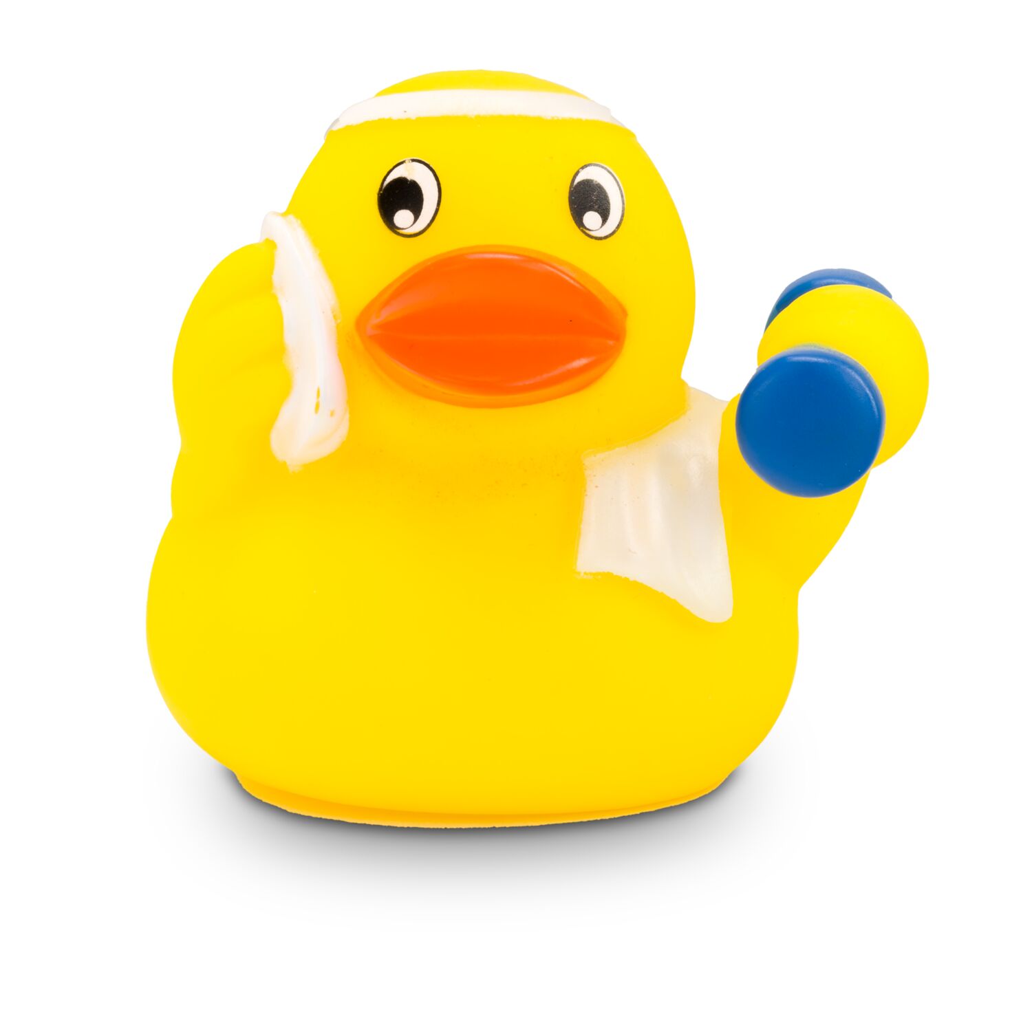 Der toughe Muskelprotz Herbert Hantel ist jeden Tag im Fitnessstudio und trainiert fleißig. Die blaue Hantel in der Hand braucht er für sein Workout. Wenn er ins Schwitzen kommt, helfen ihm Handtuch und Stirnband. Sein Motto? No pain, no gain! Größe: ca. 8 cm. Inklusive Quietschventil