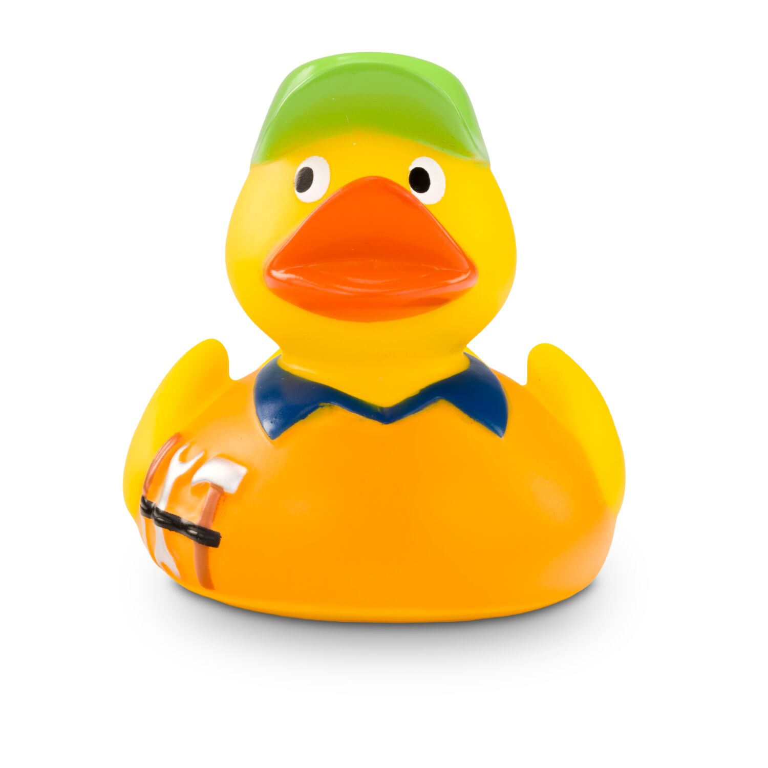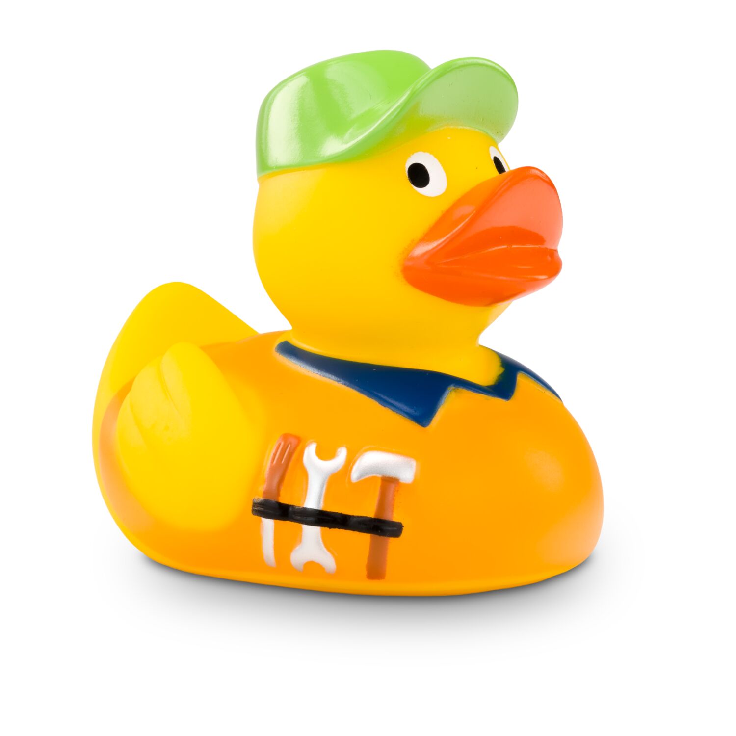Badeente Hugo Handwerker - die perfekte Quietscheente für alle Hand- und Heimwerker. Mit orangefarbener Kappe, weißem Hemd, blauem Kragen und praktischem Werkzeug-Gürtel ist diese Ente ideal für alle, die viel auf Baustellen sind und Werkzeug lieben. Größe: ca. 8 cm. Inklusive Quietschventil