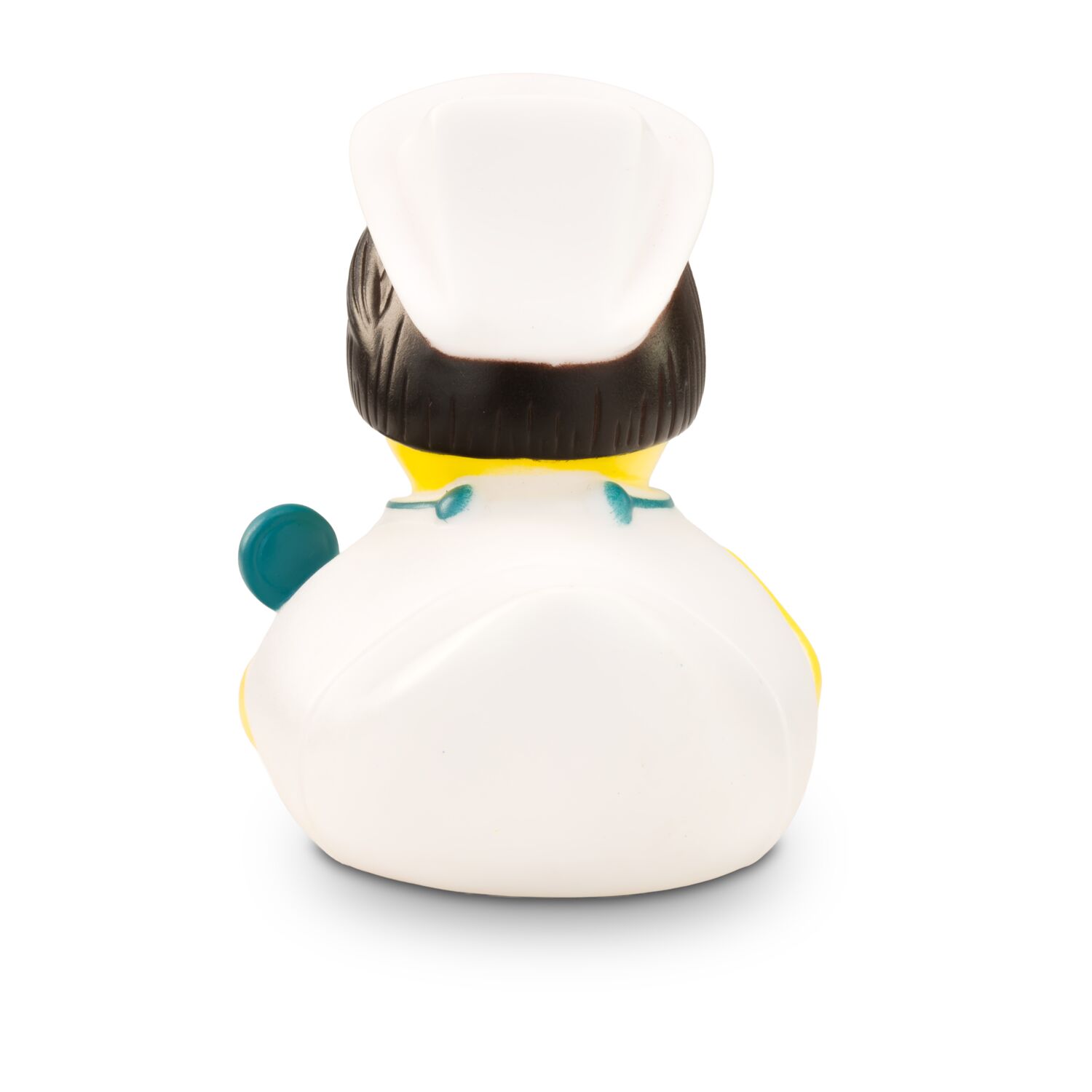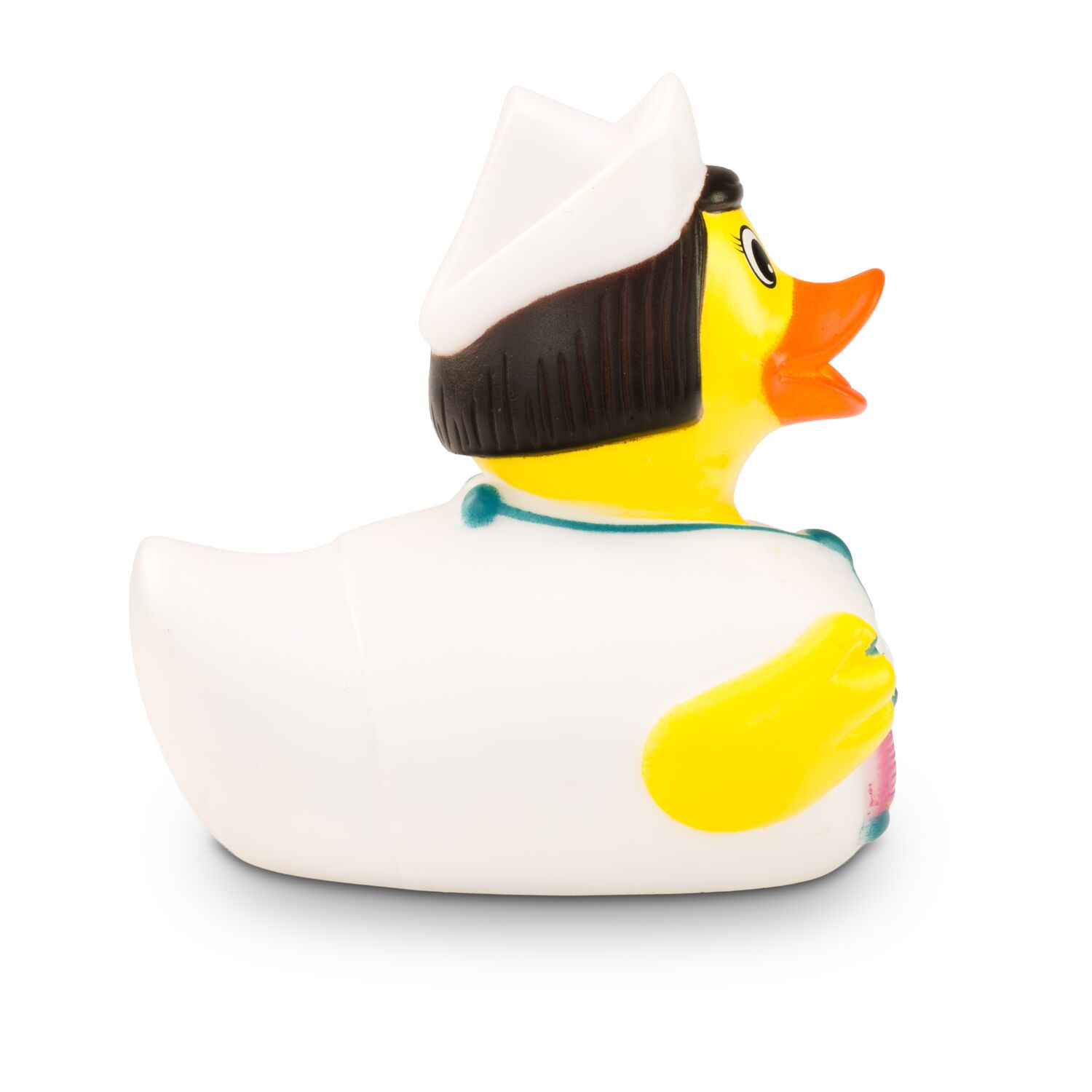 Kerstin Krankenschwester im klassischen Krankenschwestern-Outfit mit Haube auf dem Kopf sorgt jederzeit für das Wohlbefinden der Patienten im Enten-Krankenhaus. Sie trägt ein Stethoskop um den Hals und hält eine Spritze bereit, um die Patienten gesund zu pflegen. Größe: ca. 8 cm. Inklusive Quietschventil