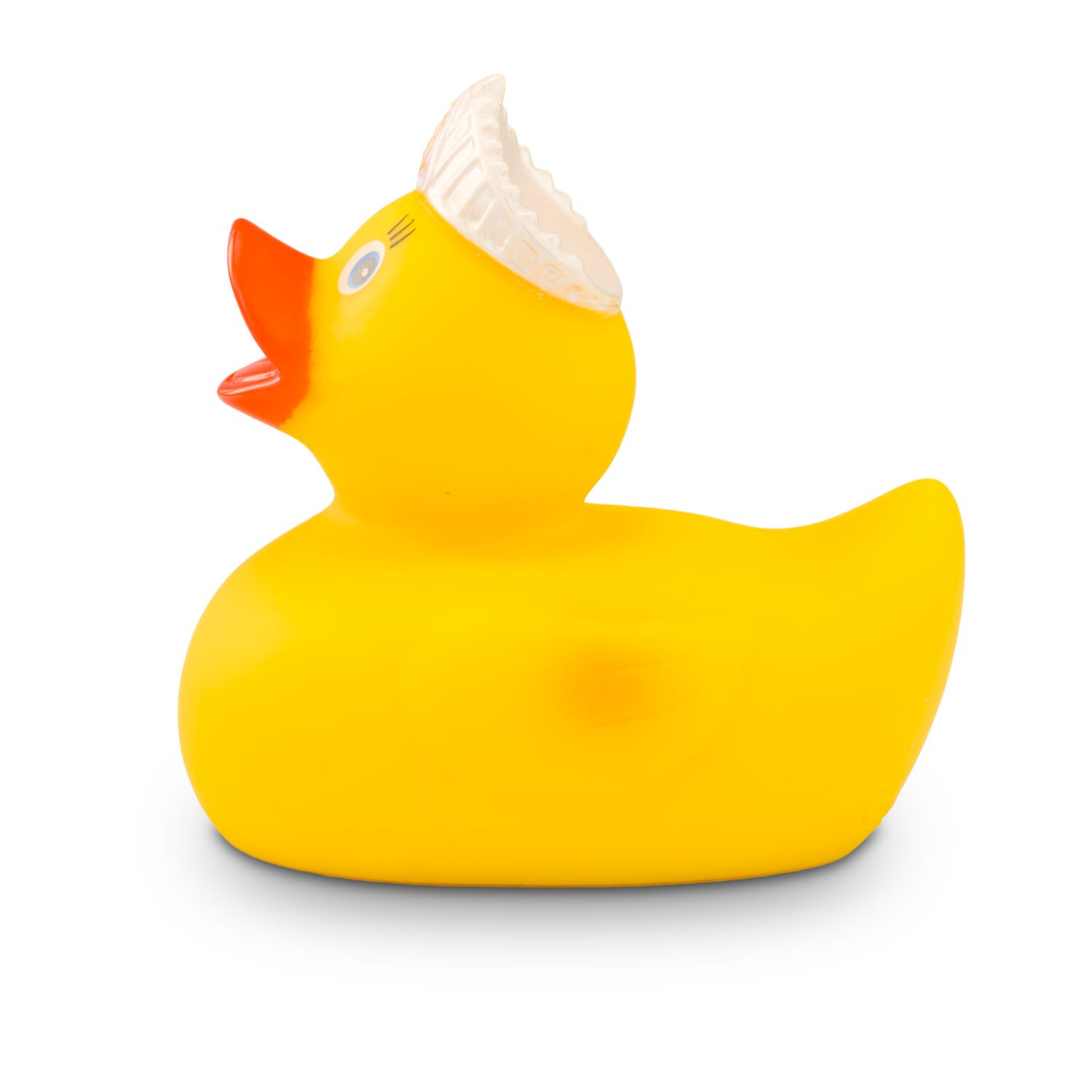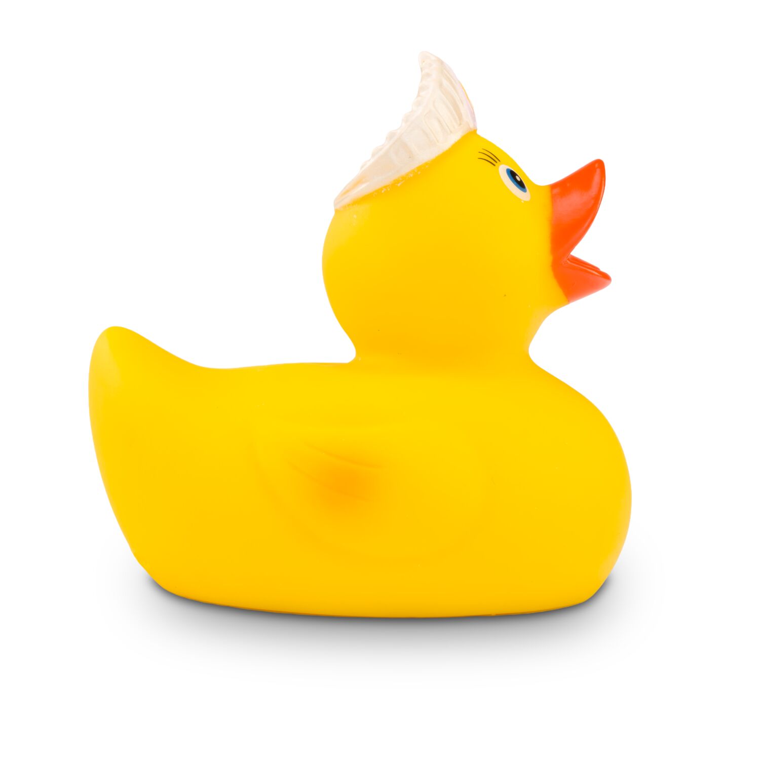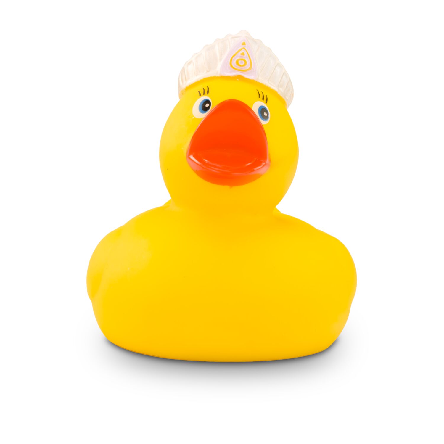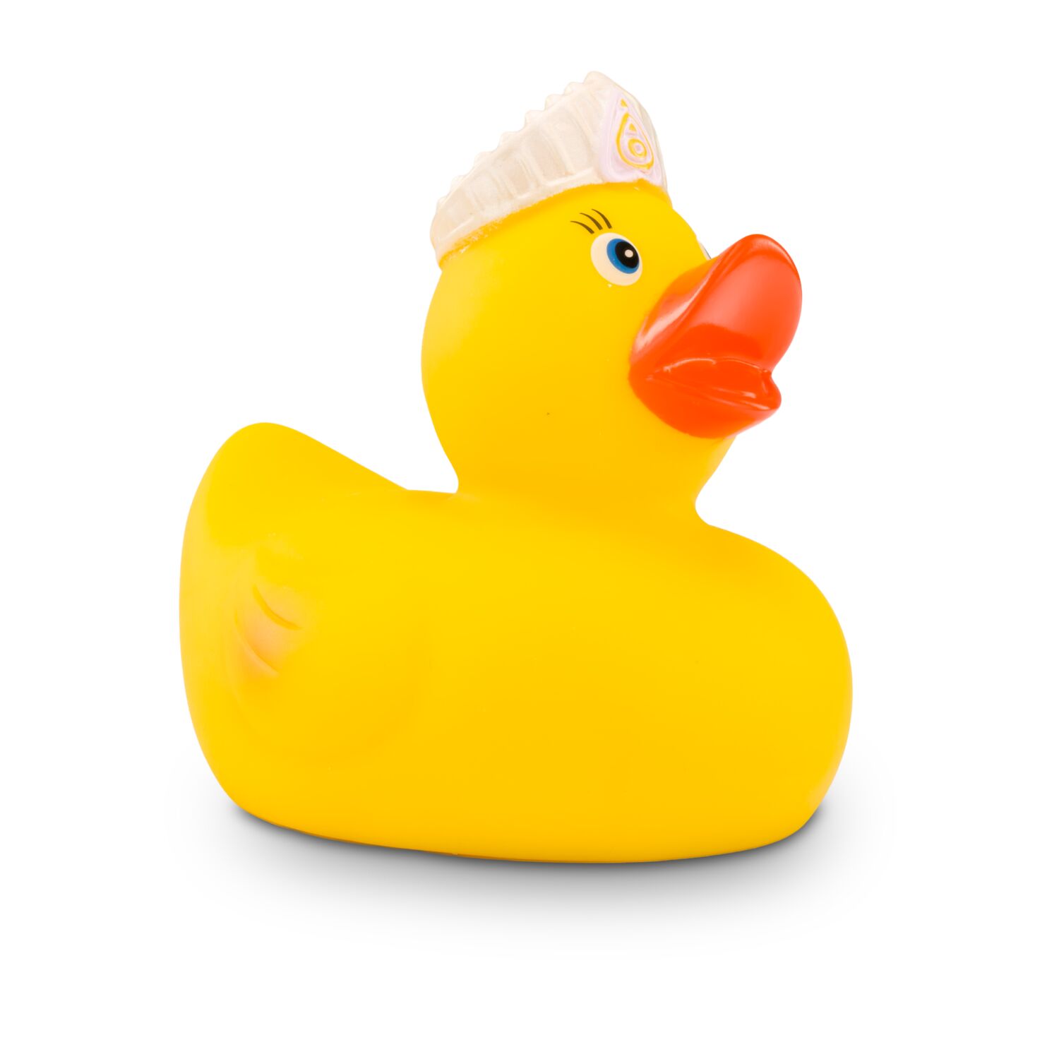 Verbeugt euch vor der Königin Quak. Sie ist eine Ente entsprungen aus einem Märchen und auf der Suche nach dem dazugehörigen König. Sie trägt eine goldene Krone auf dem Kopf und lässt mit langen Wimpern ihren Charme spielen. Größe: ca. 8 cm. Inklusive Quietschventil