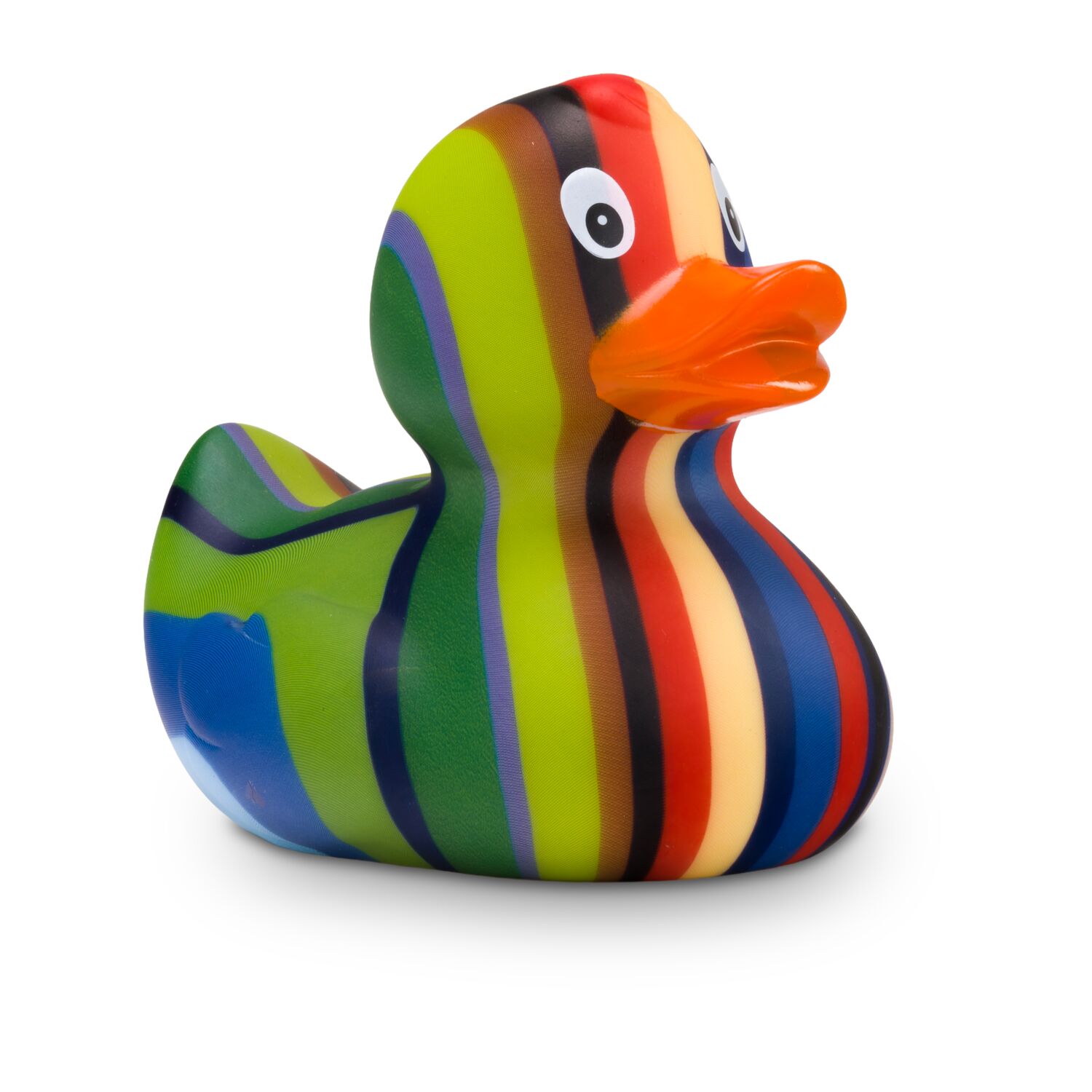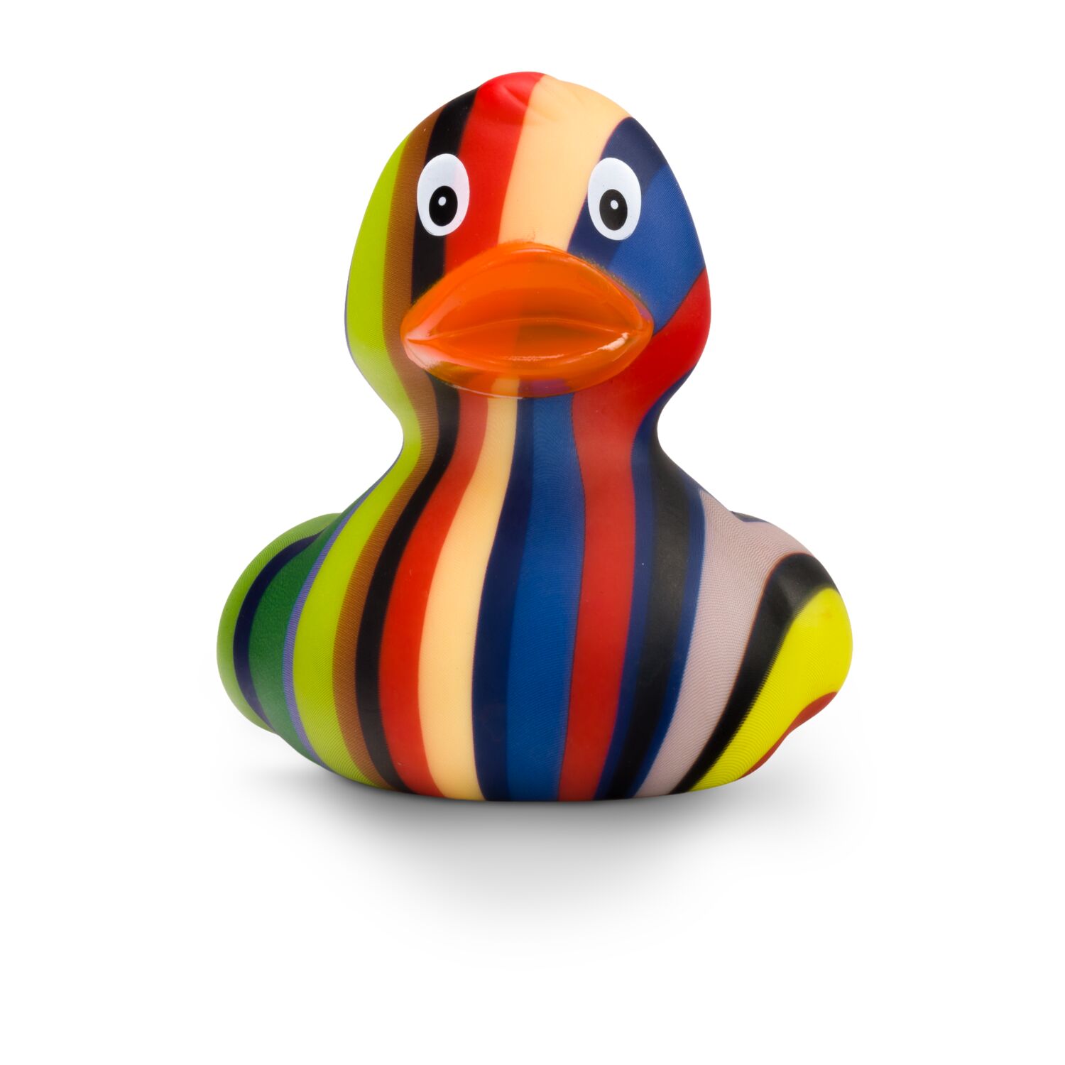 Lenny Längsstreifen ist wortwörtlich ein echt bunter Vogel. Ihn zieren viele bunte Streifen am ganzen Körper, was ihn zu einem richtigen Hingucker macht. Die farbenfrohe Erscheinung wird durch ein besonderes Herstellungsverfahren ermöglicht, die jede Badeente zu einem Unikat macht. So sieht kein Lenny aus, wie der andere. Größe: ca. 8 cm. Inklusive Quietschventil