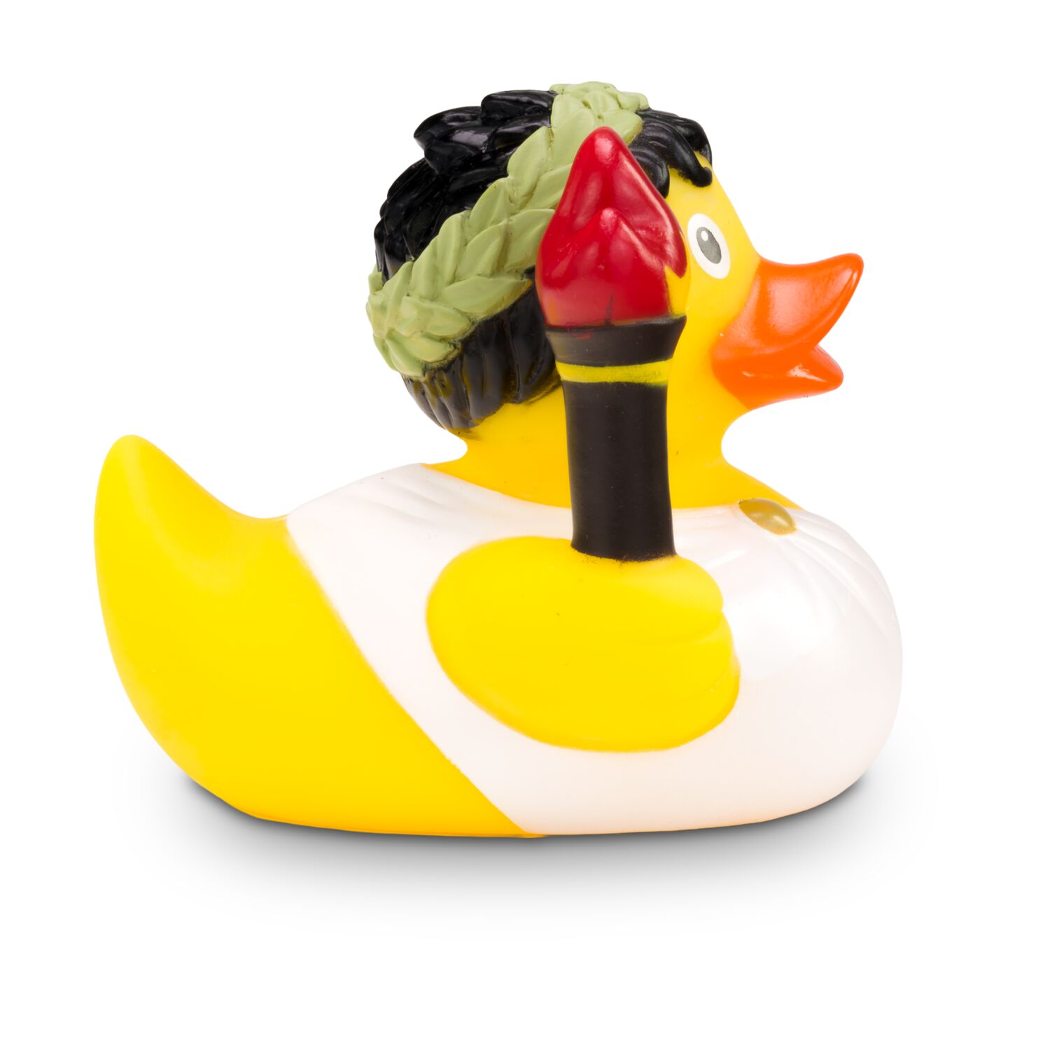 Ole Olympia war schon einmal als Wettkämpfer bei den Olympischen Spielen. Dabei sein ist alles! Nach all den sportlichen Erfolgen, darf er dieses Jahr sogar die olympische Fackel tragen. Dazu trägt er eine festliche, traditionelle griechische Toga in Weiß und hält die Fackel sicher im Flügel. Voller Stolz trägt er den traditionellen Olivenkranz auf seinen dunklen Locken. Diese Badeente ist der perfekte Motivator für Leistungssportler aller Sportarten. Größe: ca. 8 cm. Inklusive Quietschventil