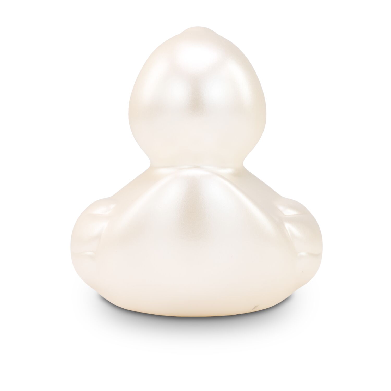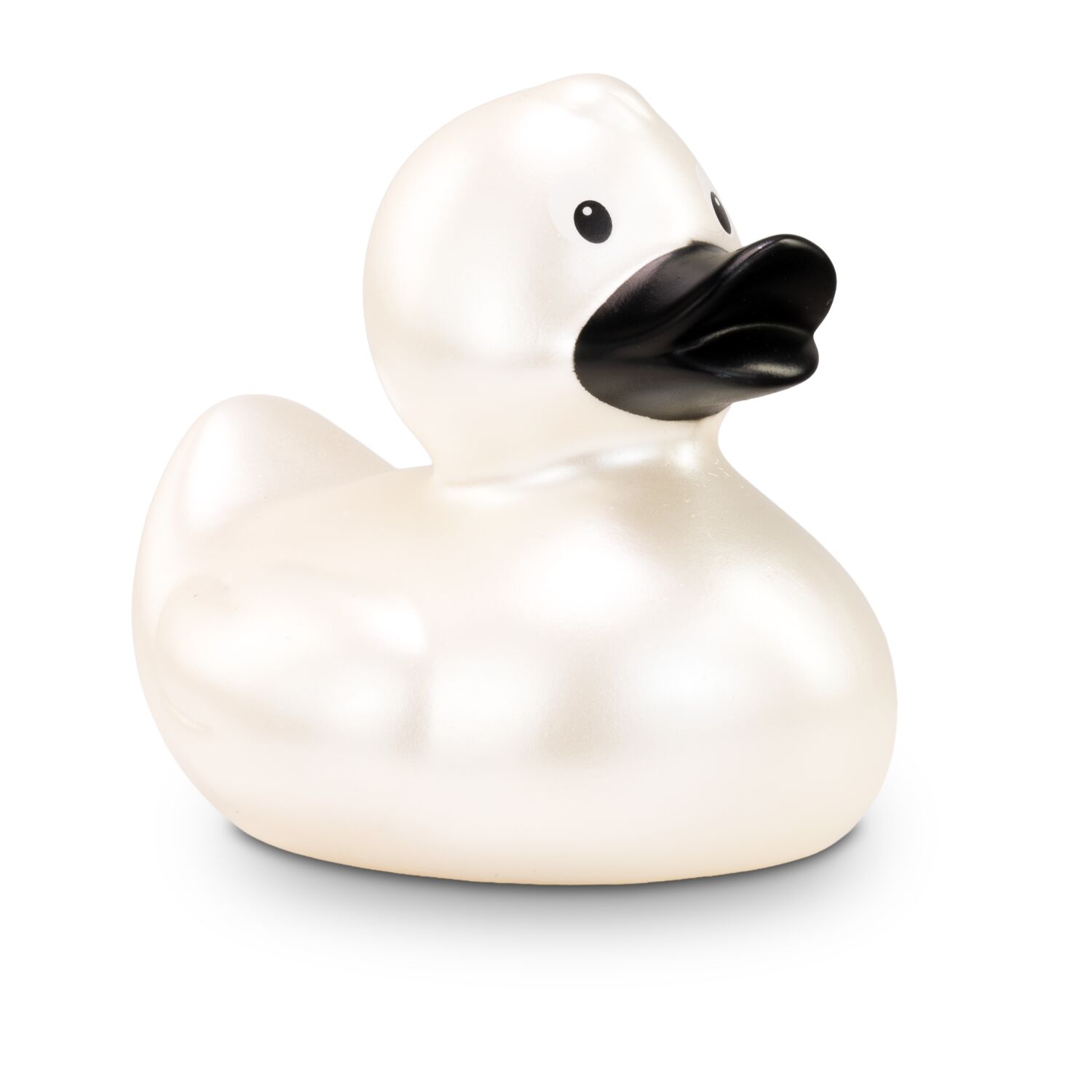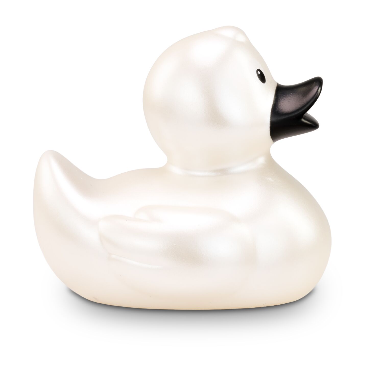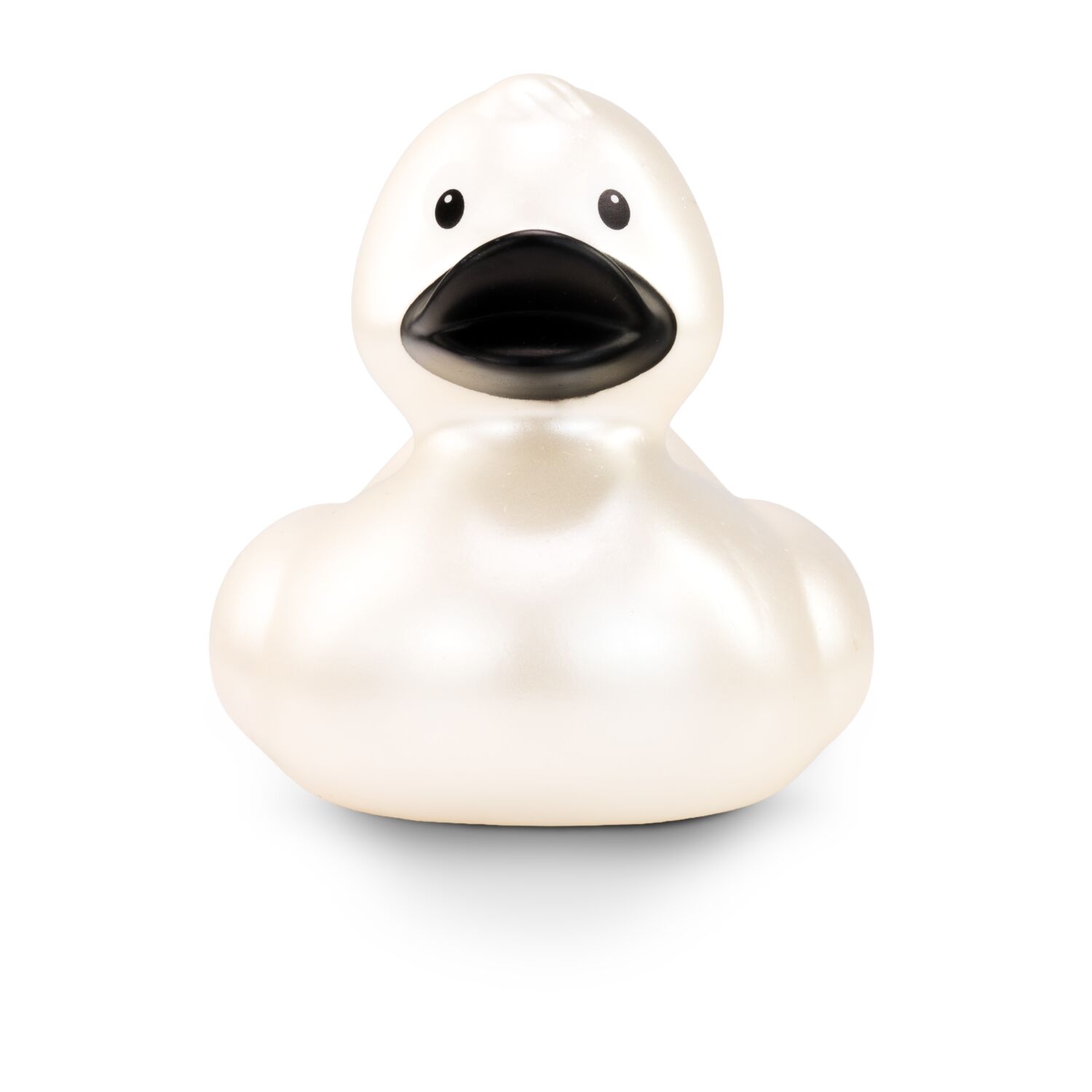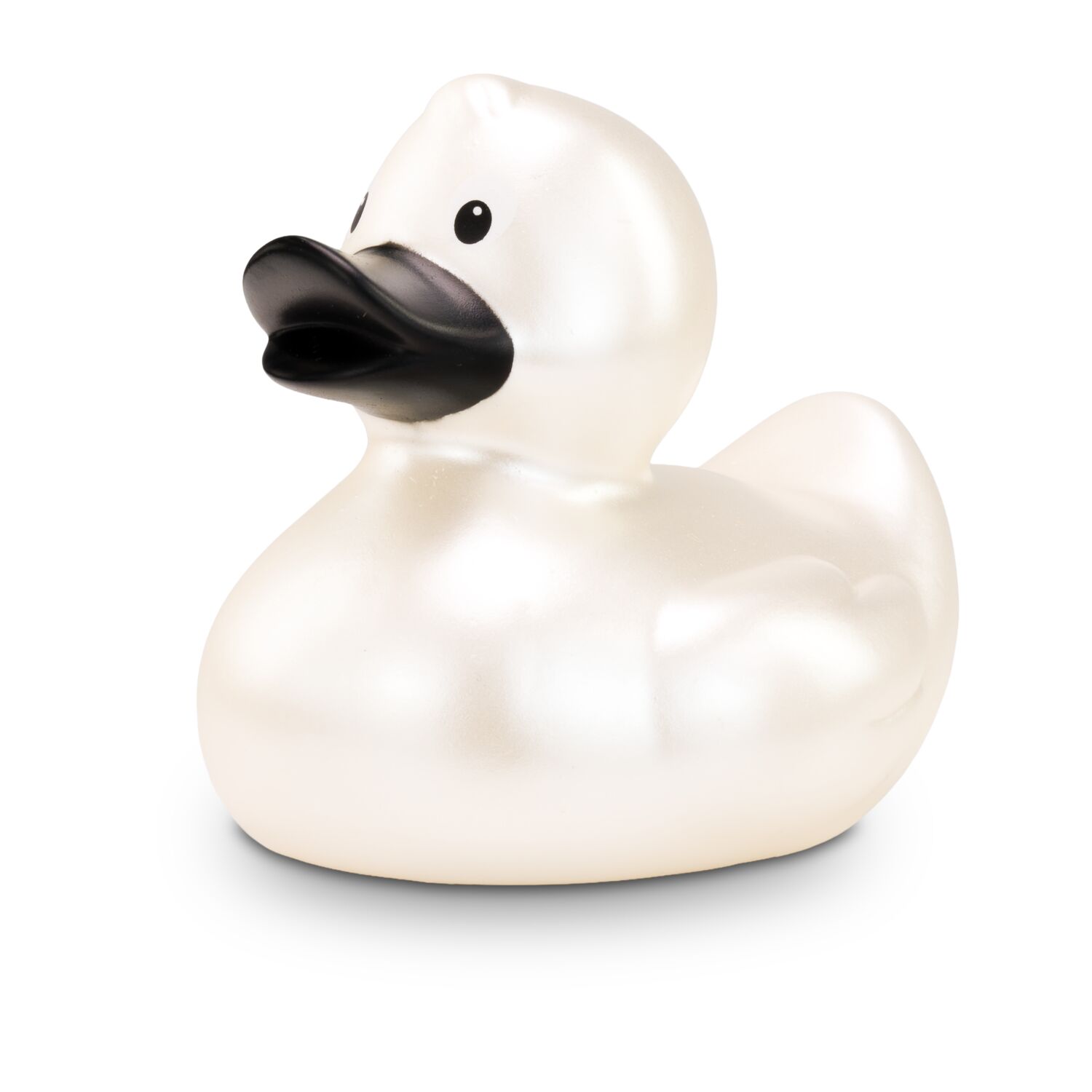 Pia Perlmutt besticht mit einem schillernden, irisierenden Glanz. Sie trägt mit Stolz ein perlmuttfarbenes Federkleid und einen eleganten schwarzen Schnabel. So zieht sie als zeitlose Schönheit den Neid vieler Entendamen auf sich. Mit ihrem formschönen, zeitlosen Körper ist sie ein Badeenten-Klassiker. Damit hat sie noch viele große und kleine Geschwister, auch in anderen Farben. Größe: ca. 8 cm. Inklusive Quietschventil