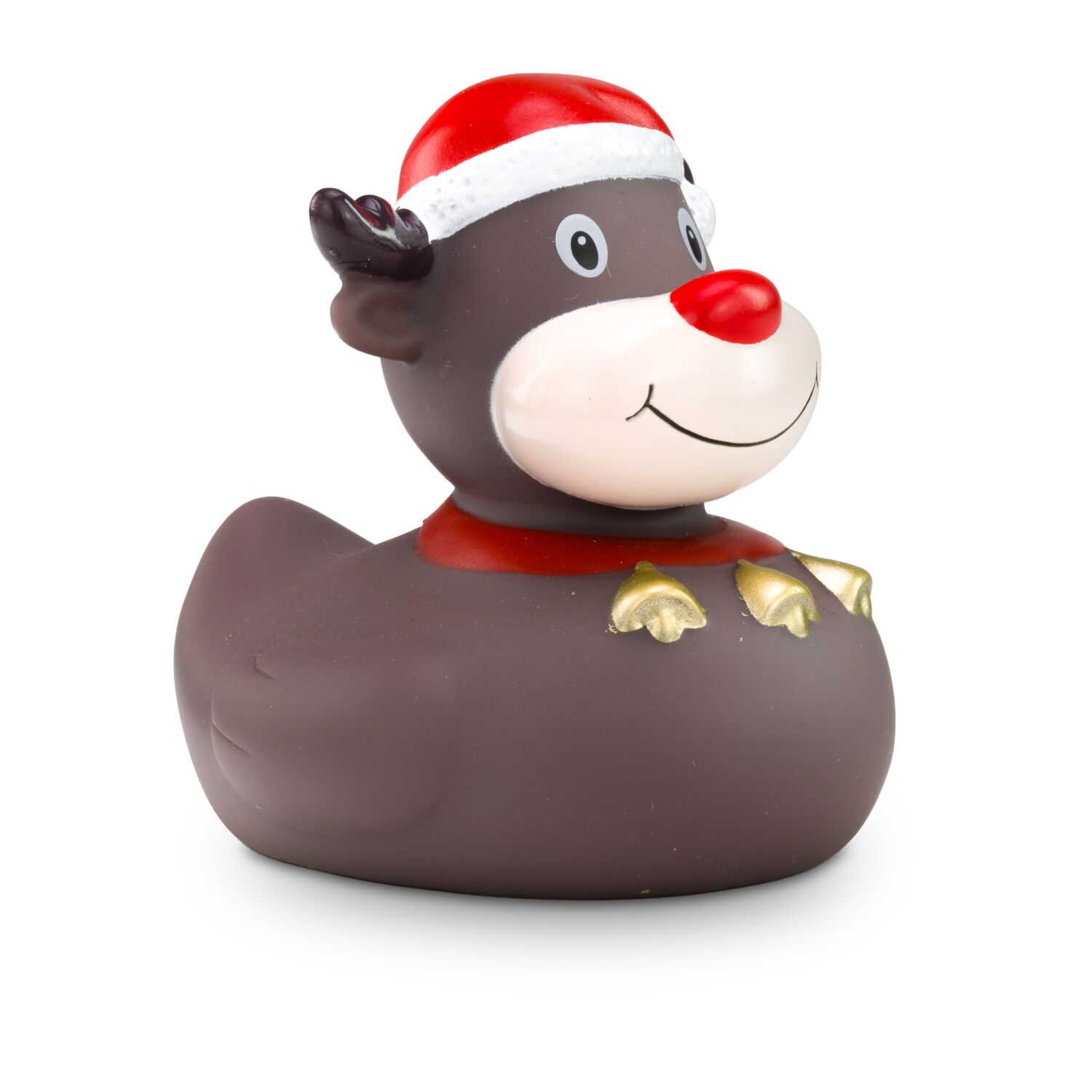 Weihnachten kann kommen, denn Rudolph Rentier bringt mit seiner typisch roten Nase, der roten Weihnachtsmütze mit Bommel und dem roten Halsband mit drei goldenen Glöckchen weihnachtliche Stimmung ins Bad. Eine originelle, winterliche Quietschfigur in brauner Rentierfarbe, die nur durch seine Körperform an eine klassische Badeente erinnert. Tipp: Siehe auch seinen Bruder "Rudolph Rentier Gefrostet" in der weißen, gefrosteten Version. Größe: ca. 8 cm. Inklusive Quietschventil