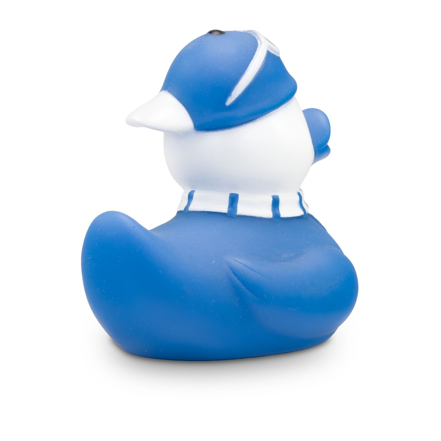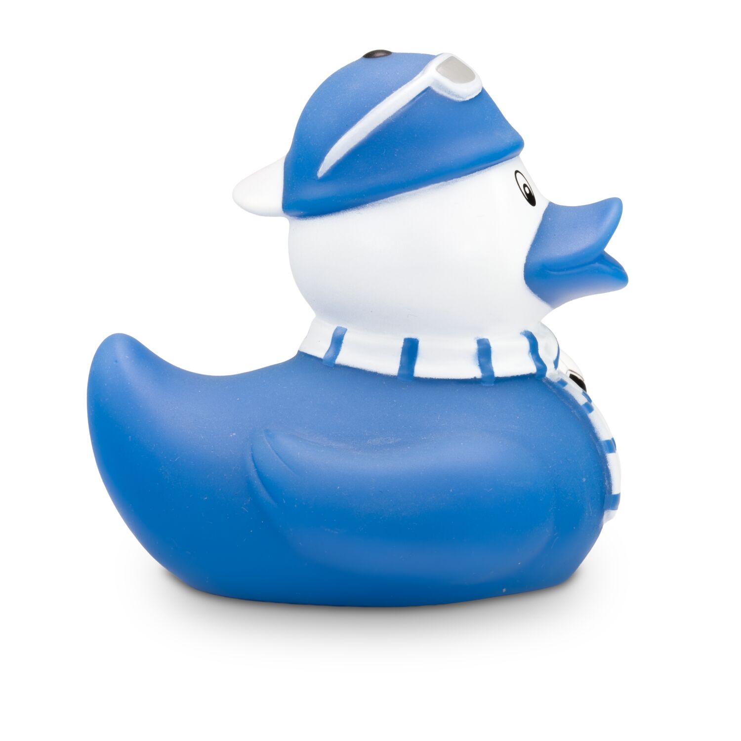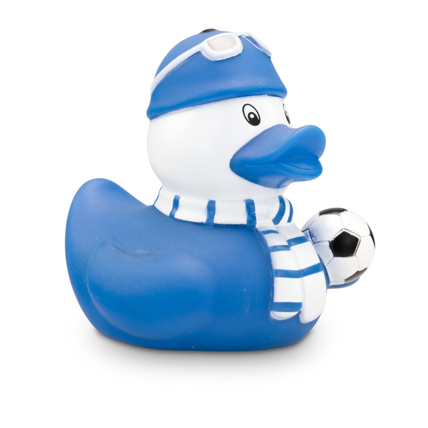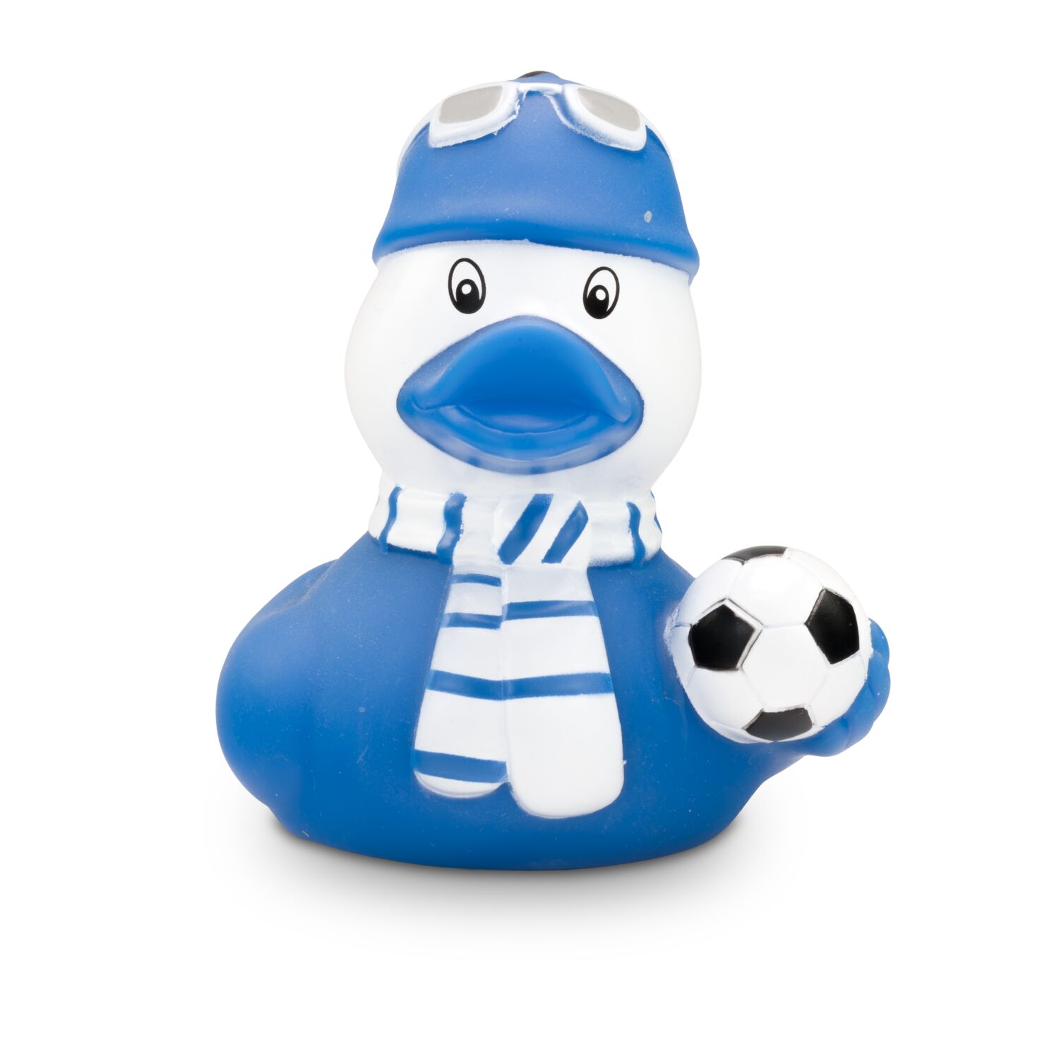 TOOOR! Sandro Stadion ist begeisterter Fußball-Fan und hat sich für den Stadion-Besuch in Schale geworfen. Er trägt einen Fanschal in seinen Lieblingsfarben Weiß und Blau und eine blaue Mütze mit weißer Sonnenbrille darauf. Unter dem Flügel hält er einen Fußball griffbereit. Größe: ca. 8 cm. Inklusive Quietschventil