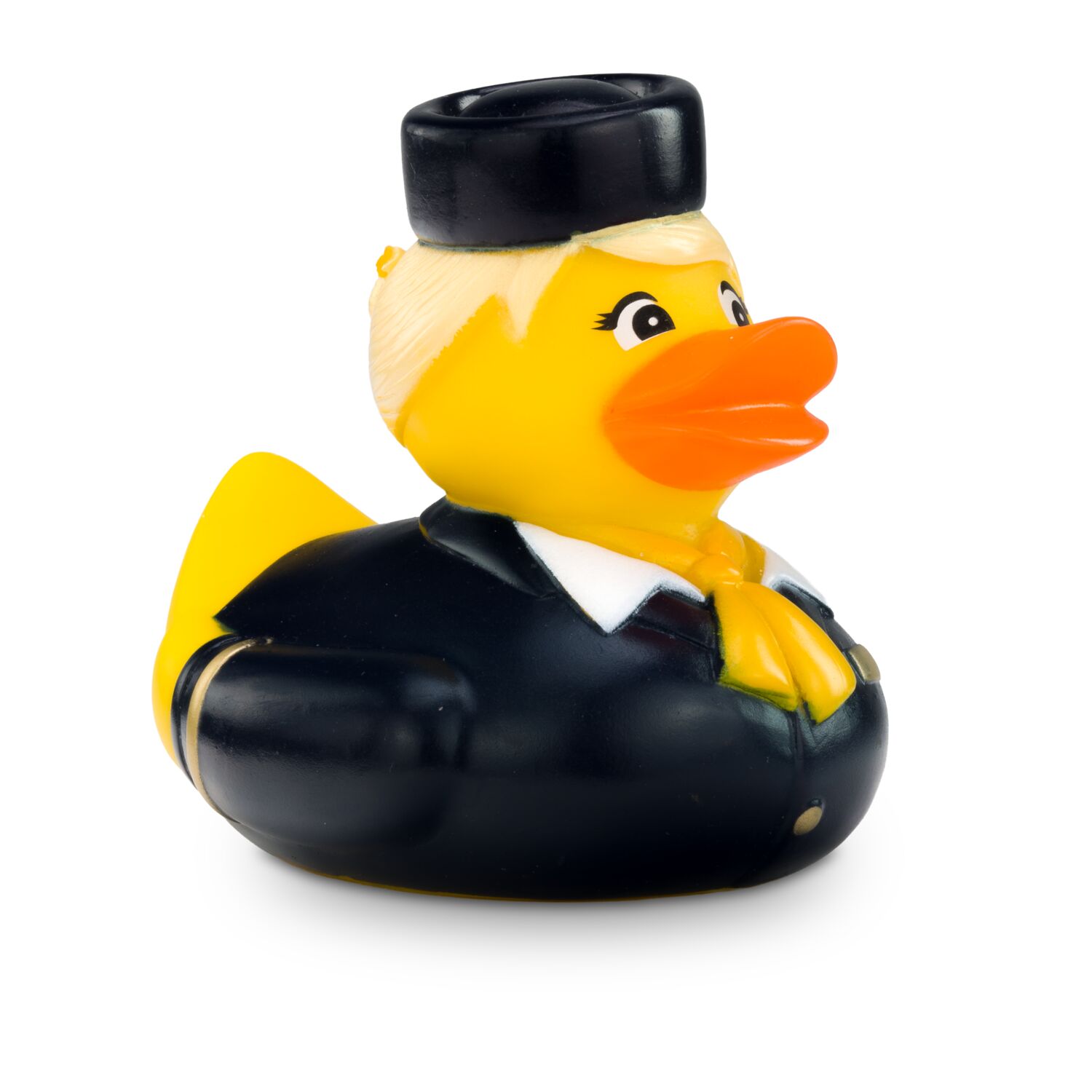 Die charmante Flugbegleiterin Steffi Stewardess begleitet sie auf ihre Reise in die Badewanne. Mit blauer Uniform, weißer Bluse, gelbem Halstuch und keckem Hütchen ist Steffie ein echter Blickfang. Goldene Streifen an den Manschetten und das goldfarbene Namensschild runden ihren eleganten und authentischen Look ab. Die perfekte Quietscheente für Vielflieger, Airlines oder als origineller Werbeartikel für Reiseunternehmen. Tipp: Steffi gibt es auch mit rotem Halstuch. Größe: ca. 8 cm. Inklusive Quietschventil