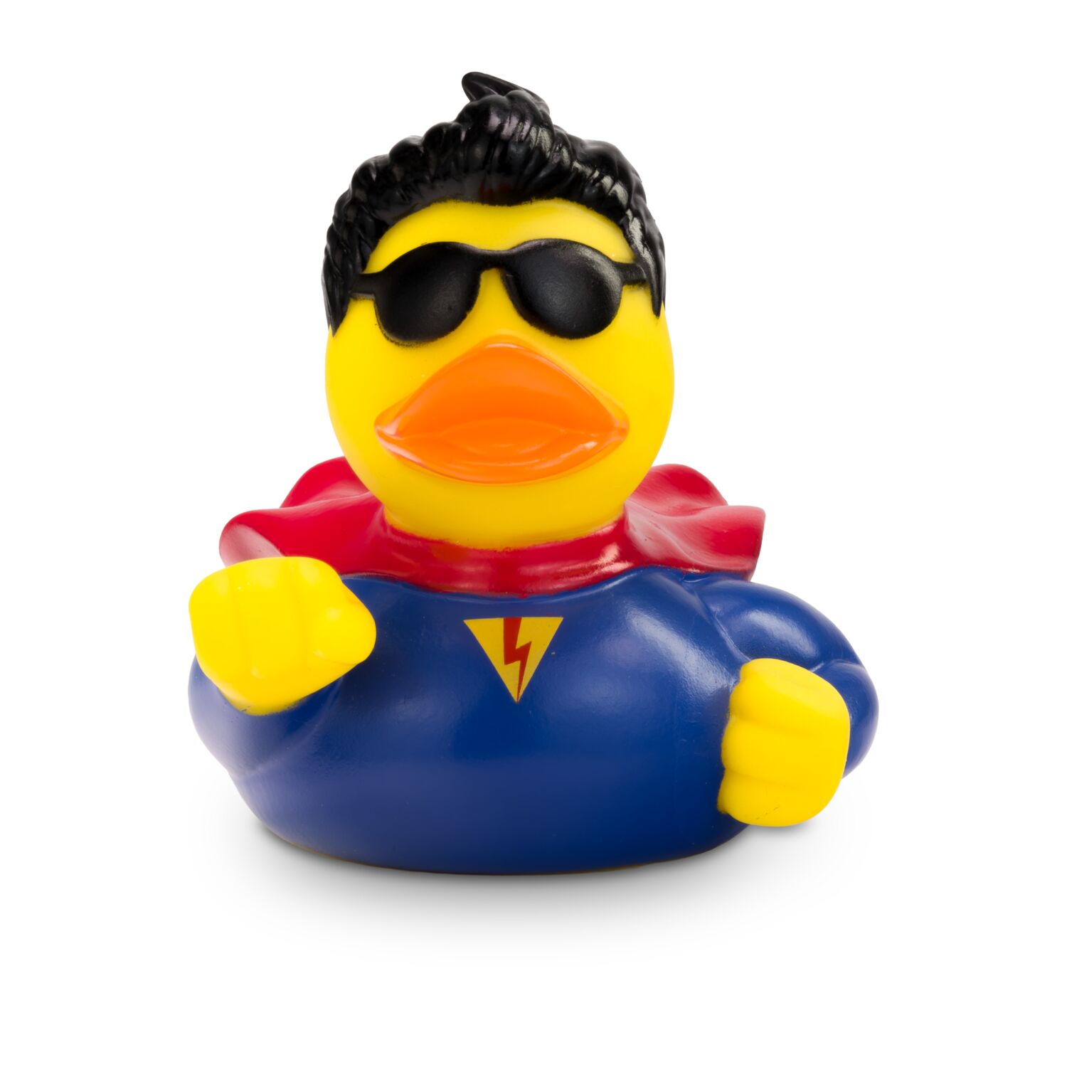 Hier kommt ein echter Held: Superduck ist stets zur Stelle, wenn Hilfe gefragt ist. Er trägt seinen blauen Superheldenanzug mit Blitz-Print und seinen roten Umhang voller Stolz. Eine Badeente die besonders Kindern Mut macht und in schwierigen Zeiten Halt gibt. Größe: ca. 8 cm. Inklusive Quietschventil