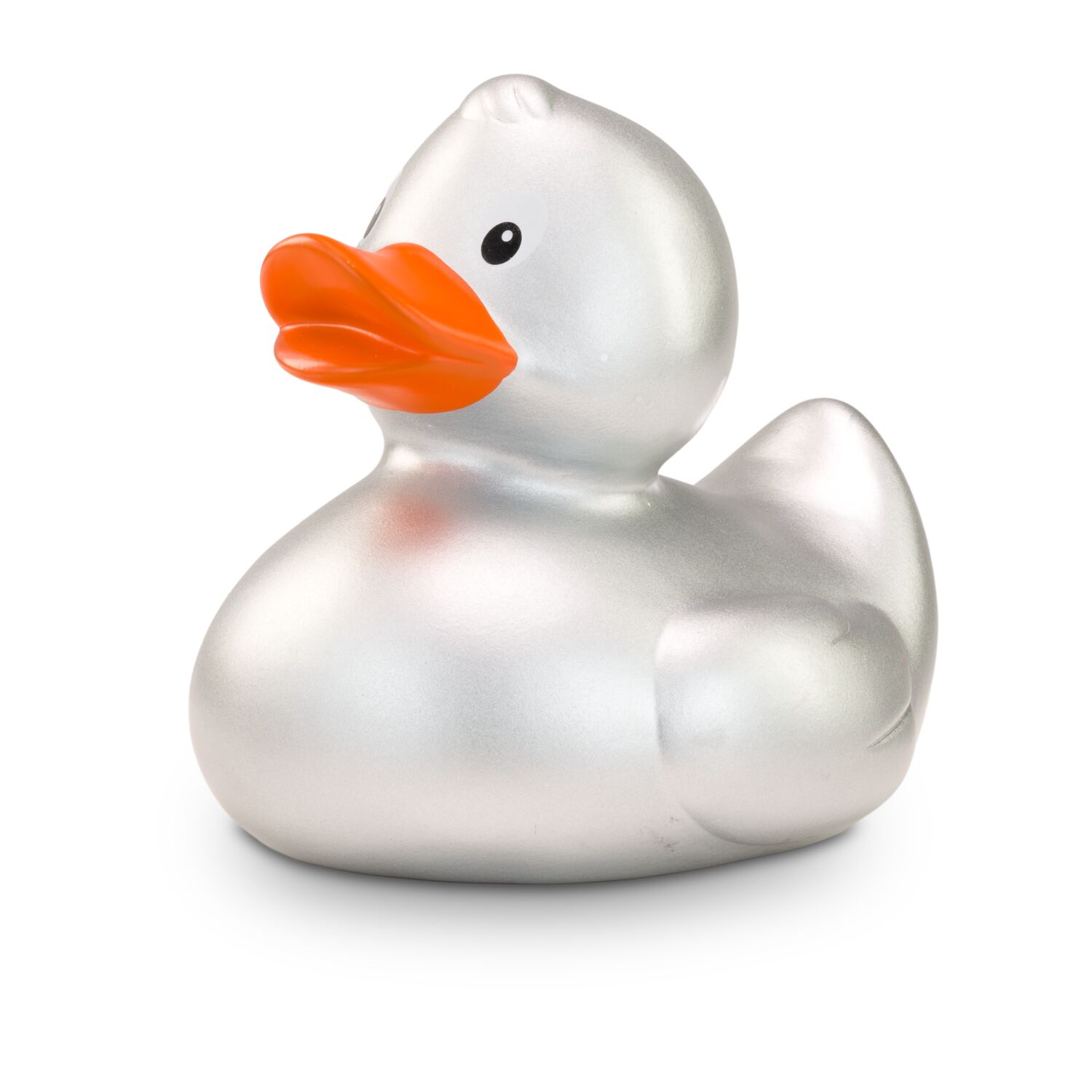 Klein, aber oho. Sylvies kleine Schwester überzeugt mit ihrem silbernen Gefieder, dem leuchtend orangenen Schnabel und ihrem formschönen Entenkörper auch im Kleinformat. Sie wirkt selbst als Mini-Ente besonders glamourös und doch zeitlos. Als Teil einer großen Familie klassischer Badeenten hat Sylvie noch weitere Geschwister, auch in anderen Farben. Größe: ca. 6 cm. Inklusive Quietschventil