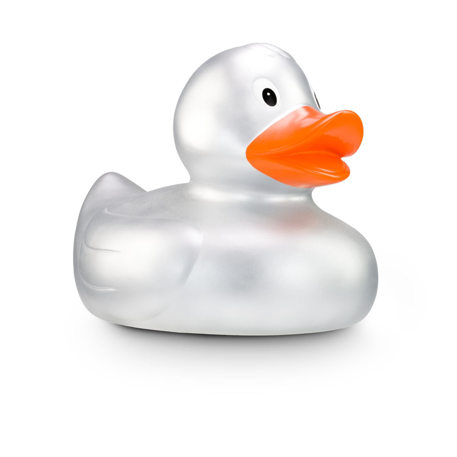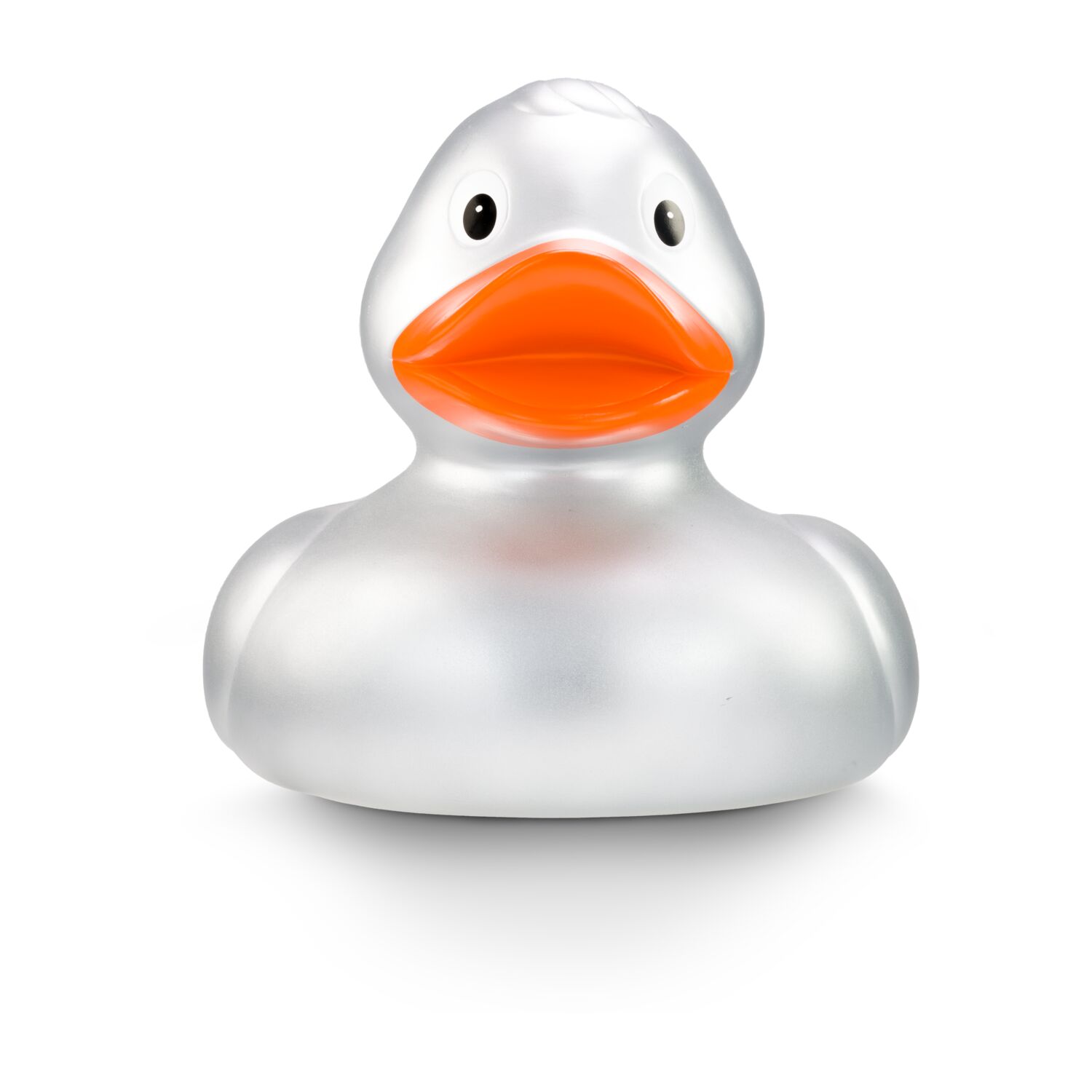 Groß, glamourös und zeitlos - Sylvie XXL beeindruckt mit ihrem eleganten silbernen Gefieder, dem leuchtend orangenen Schnabel und ihrem formschönen Entenkörper. Mit satten 30 cm Länge bringt sie metallischen Glanz in jedes Haus. Sie wirkt futuristisch und doch klassisch - das macht sie besonders beliebt bei allen, die auf das gewisse Etwa setzen. Als Teil einer großen Familie hat Sylvie XXL noch weitere Geschwister, auch in anderen Farben. Größe: ca. 30 cm. Inklusive Quietschventil