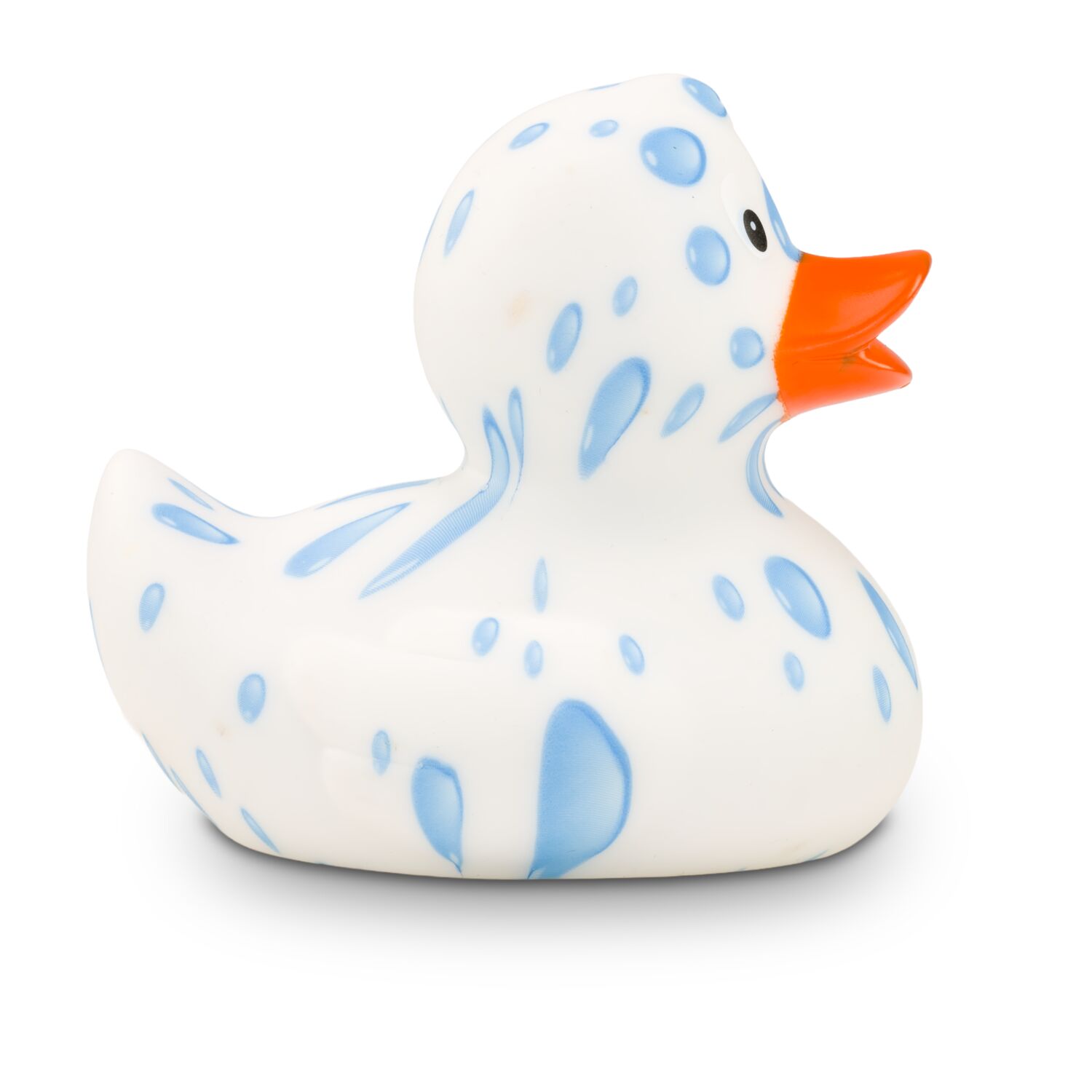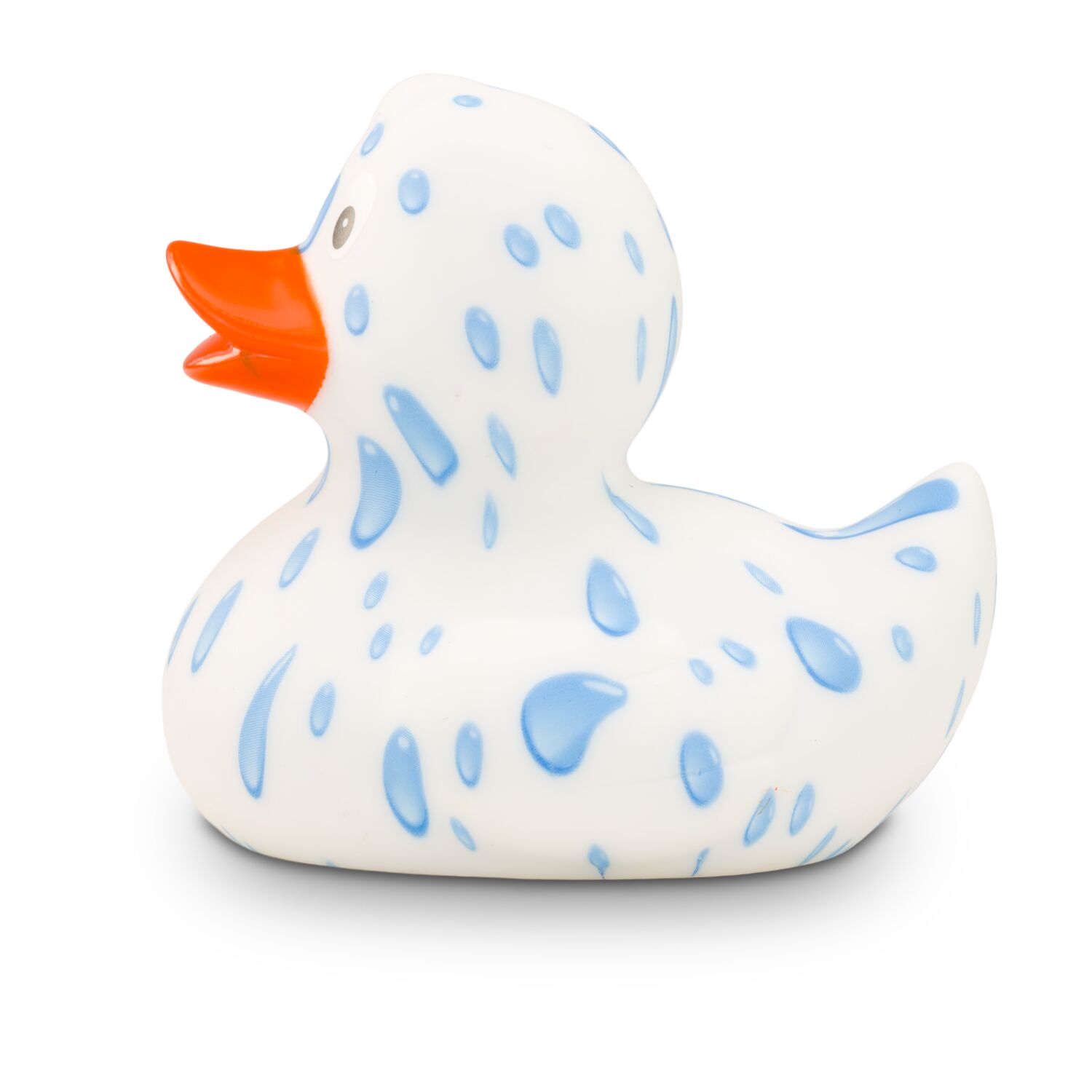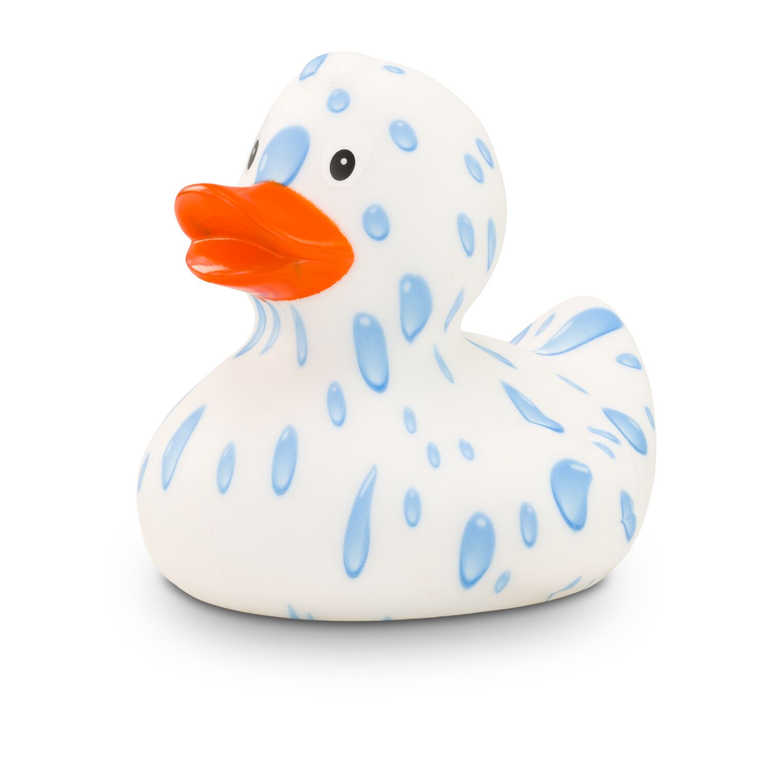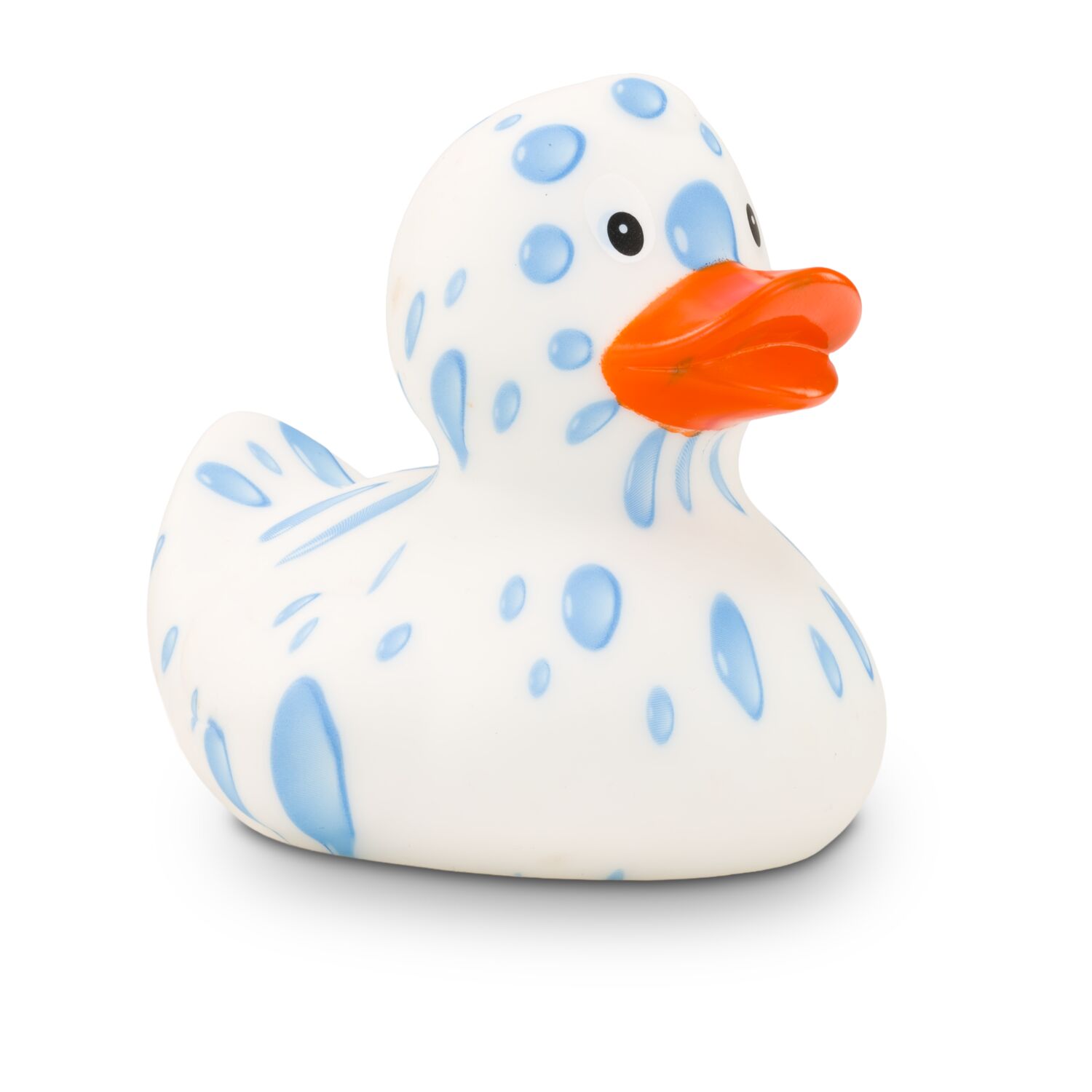 Tommy Tropfen hält sich gerne im kühlen Nass auf. Sein weißes Gefieder ist mit zahlreichen Wassertropfen in verschiedenen Formen geschmückt. Er hat einen orangenen Schnabel. Diese Werbeente eignet sich sehr gut für Bäder oder Wasserwerke. Durch das spezielle Herstellungsverfahren ist kein Patrick Plansch wie der andere - jede ente ein Unikat. Größe: ca. 8 cm. Inklusive Quietschventil