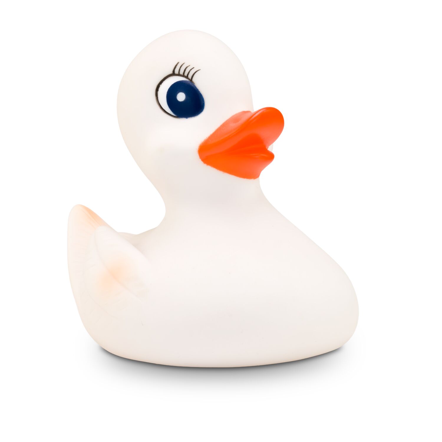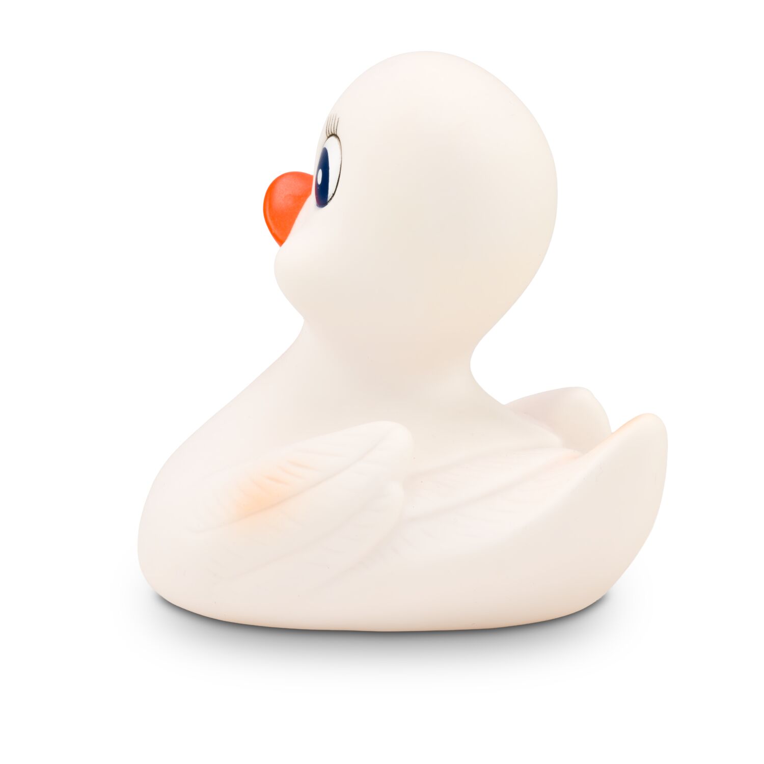 Durch das elegante, weiße Gefieder kommen die langen Wimpern und blauen Augen besonders schön zur Geltung. Die beliebte Badeente mit ihrem großen, schlanken Modelkörper ist die bezaubernde Schwester von Heidi. Größe: ca. 10 cm. Inklusive Quietschventil