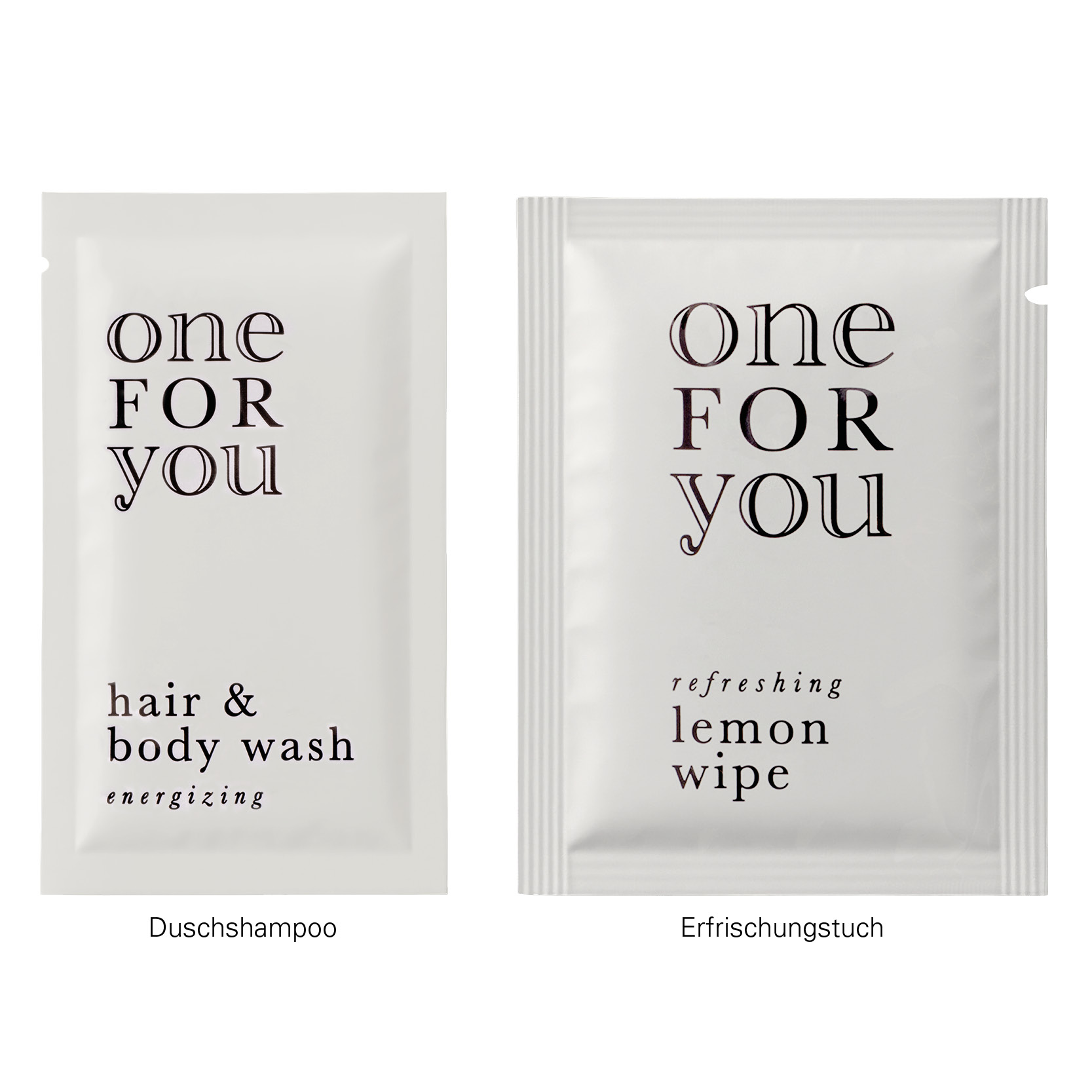 1 Tütchen Duschgel & Shampoo oder 1 Tütchen mit einem Erfrischungstuch