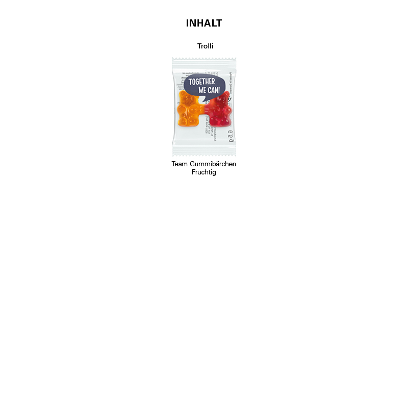 Aufklappbare Werbekarte im Visitenkartenformat, weißer Karton, mit praktischer Abreißperforation, individuell bedruckt. Inhalt: 1 Flowpack in Standardgestaltung (Motiv: together we can) mit 1 Trolli Team Gummibärchen in Premium Qualität mit 10 % Fruchtsaftanteil, bunt gemischt, 6,5 g,