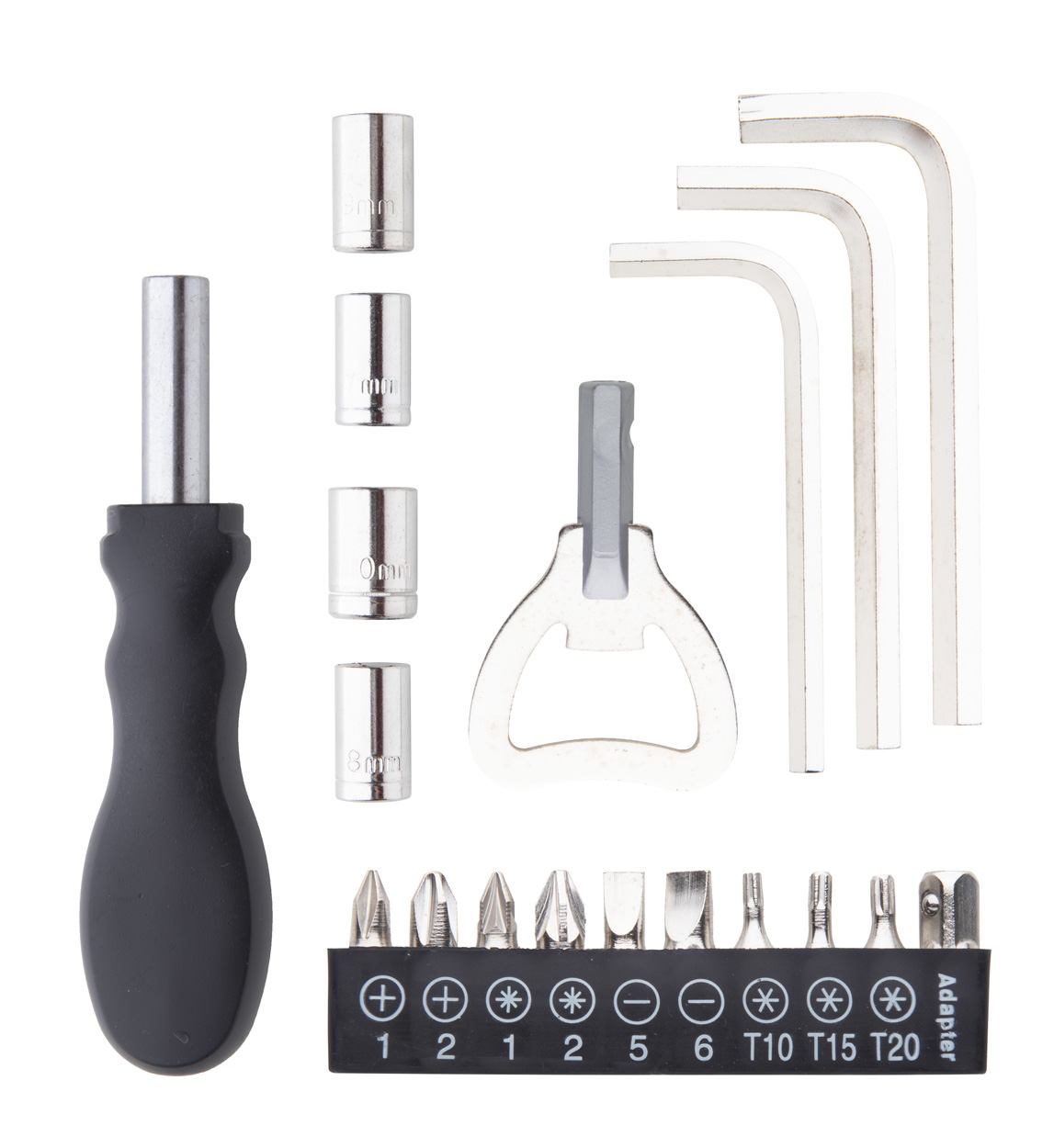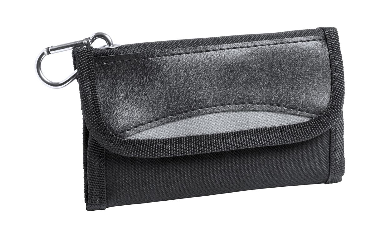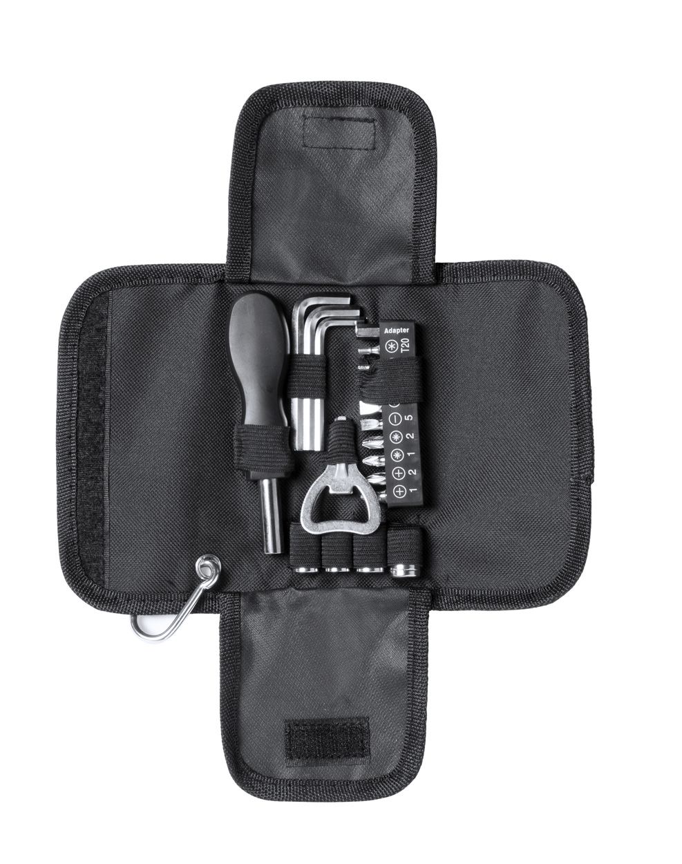 19-teiliges Werkzeugset in Polyester-Etui mit Karabinerhaken.