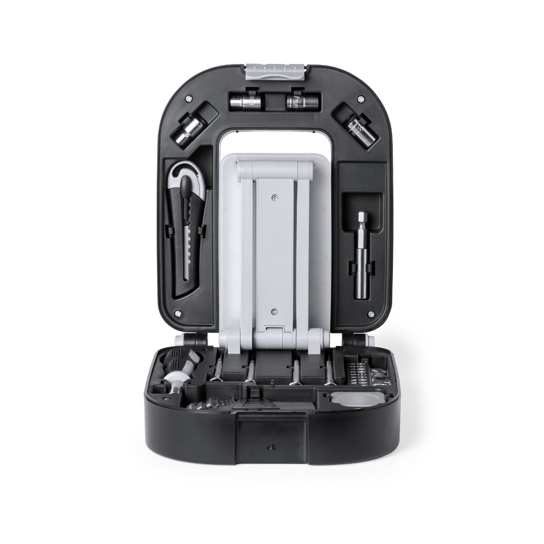 Original Werkzeugset mit Licht und 30 Zubehörteilen. Wird in einer robusten schwarzen ABS-Box mit Verschluss geliefert. In der Box integrierte, faltbare Lampe mit 24 LEDs und EIN / AUS-Taste. Inklusive Schraubendreher mit vielen flachen, Phillips- und Torx-Spitzen, Präzisionsschraubendreher-Set, Rohrschlüssel, Inbusschlüssel in verschiedenen Größen, Schneider und 1 m Flexometer. Batteriebetriebene Lampe (3xAA nicht im Lieferumfang enthalten). Präsentiert in einer individuellen Box mit Kraftpapier-Design.