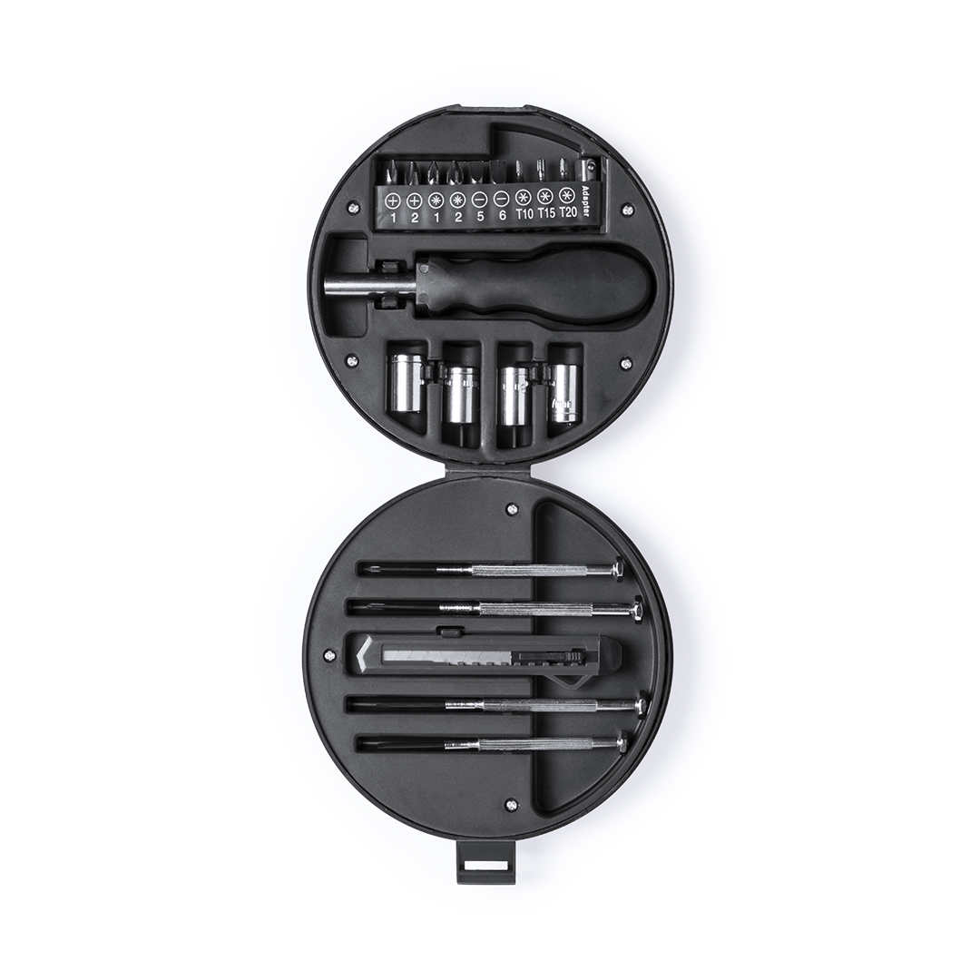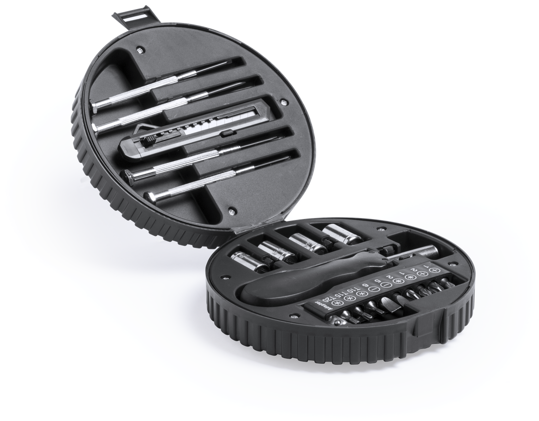 20-teiliges Werkzeugset in Koffer mit Rad-Design. Enthält einen Satz Präzisionsschraubendreher, Befestigungswerkzeug, Schraubendreherköpfe (Schlitz und Kreuz), Sechskantschlüssel und Teppichmesser. Präsentiert in einer individuellen Box.
