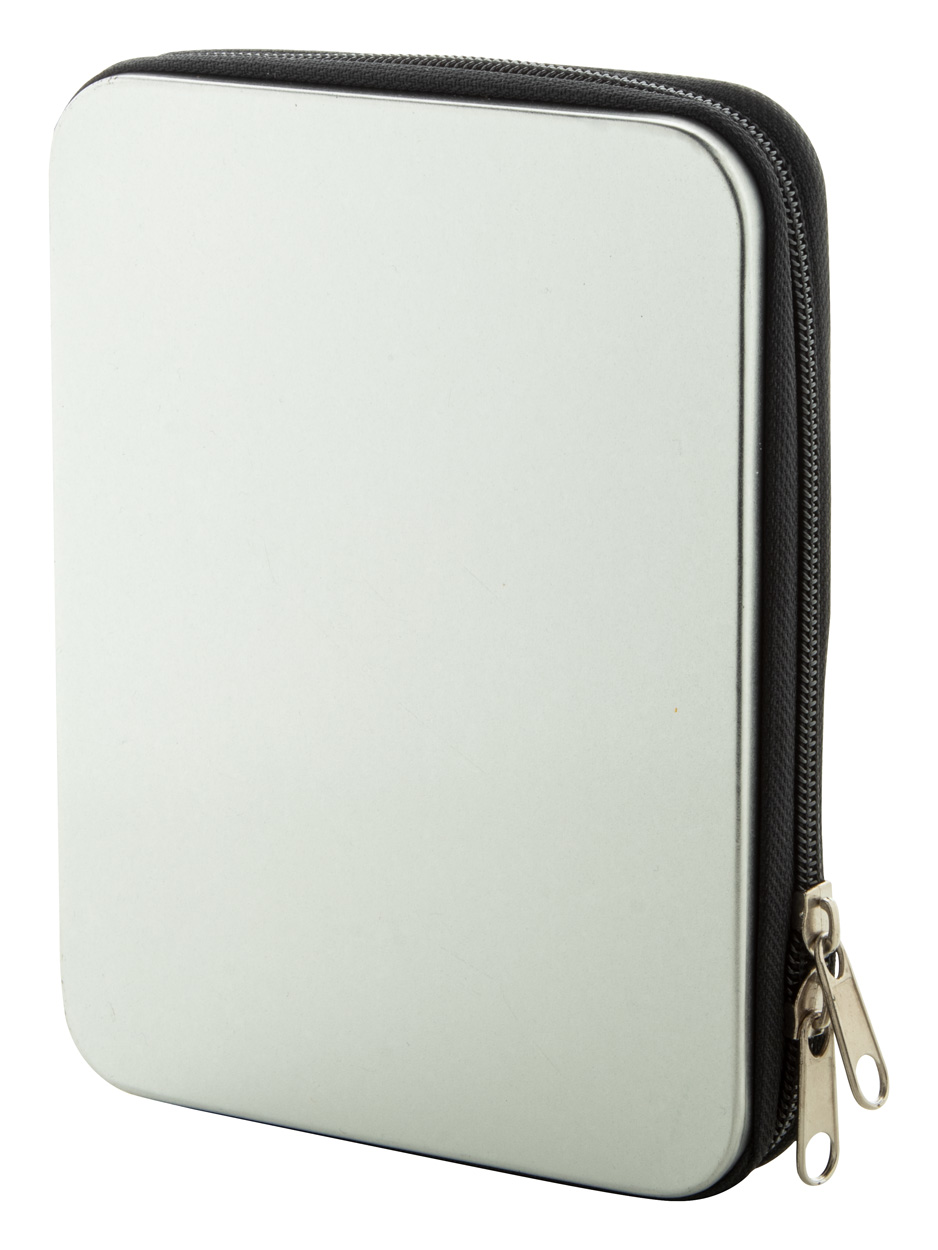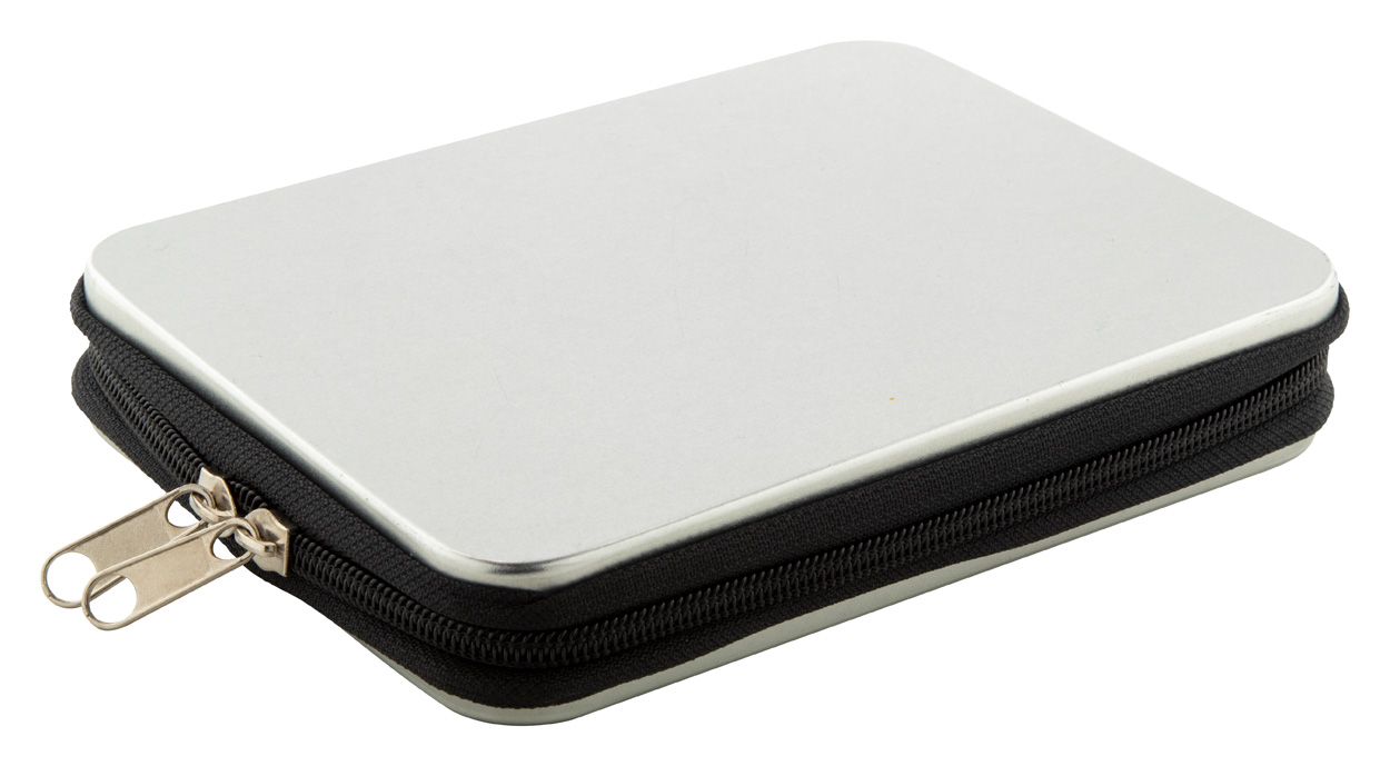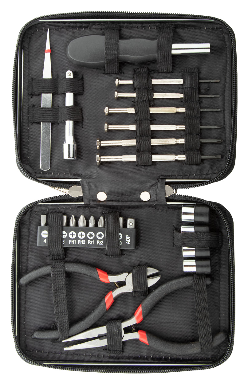 25-teiliges Werkzeugset aus Aluminium mit Reißverschlussetui. Enhält: Spitzzange, Schneidzange, Innensechskantschraubendreher, Verklängerung, Pinzette, 6 Präzisionsschraubendreher, 4-teiliger Steckschlüsselsatz, 10-teiliger Schraubendreher-Bit-Satz.