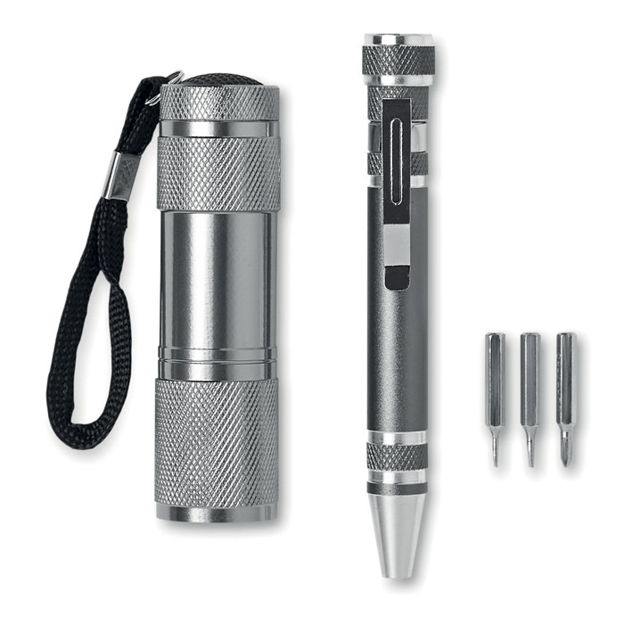 Werkzeug-Set: Aluminium Taschenlampe mit 9 LEDs sowie ein Multifunktionswerkzeug in Form eines Stiftes. Inklusive 3 Schlitz- und 3 Kreuzschraubenziehern. 3 AAA Batterien exklusive. Lieferung in einer Schachtel.