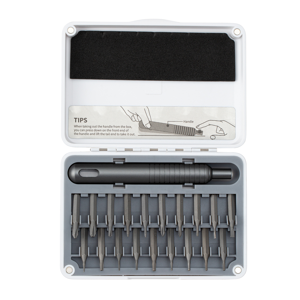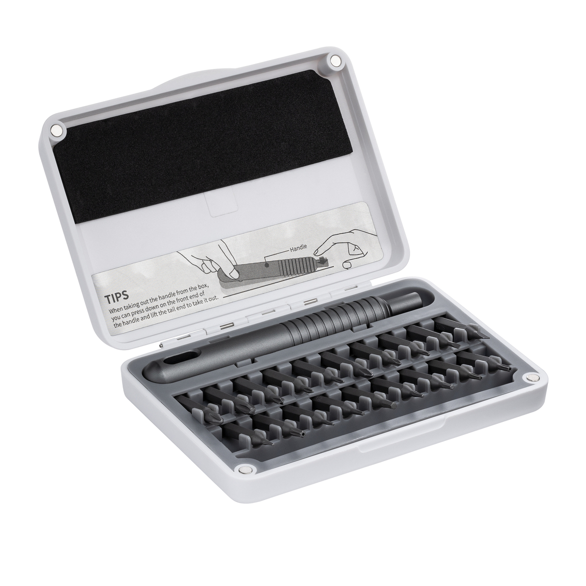 Präzise Arbeit erfordert präzise Werkzeuge. Dieses hochwertige Werkzeug-Set für Feinmechanik präsentiert sich in einer stilvollen, schwarzen Box und wurde speziell für filigrane Arbeiten an Laptops, Computern, Brillen und ähnliches konzipiert. Der matte Schraubendreher mit Bithalter und die 19 magnetischen Bits aus besonders hartem S2-Edelstahl - darunter 9 Sternschrauben Bits, 2 Schlitzschrauben Bits und 8 Kreuzschrauben-Bits - sorgen für maximale Anpassungsfähigkeit und Präzision. Die Box aus recyceltem ABS-Kunststoff zeigt sich nicht nur elegant, sondern bewahrt mit ihrem hochwertigen Magnetverschluss den Inhalt sicher auf. Das Innere aus recyceltem Polypropylen schützt und organisiert die Werkzeuge optimal. Die Box kann mit UV- oder Tampondruck veredelt werden. Auf Anfrage bieten wir auch eine Lasergravur auf dem Bit-Halter aus Edelstahl an.