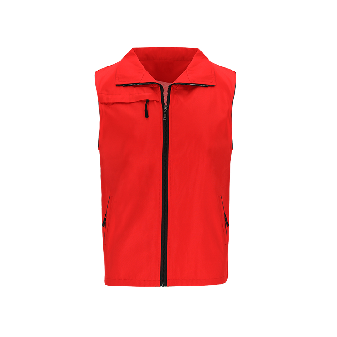 Unisex-Weste aus leichtem, atmungsaktivem Stoff mit weißem Mesh-Futter. Schwarzer Frontreißverschluss und silberner Zipper. Einschließlich einer Außentasche auf der rechten Brust und zwei Seitentaschen mit schwarzen Reißverschlüssen und Zugern. Mit einem Halbmond auf der Innenseite des Kragens.