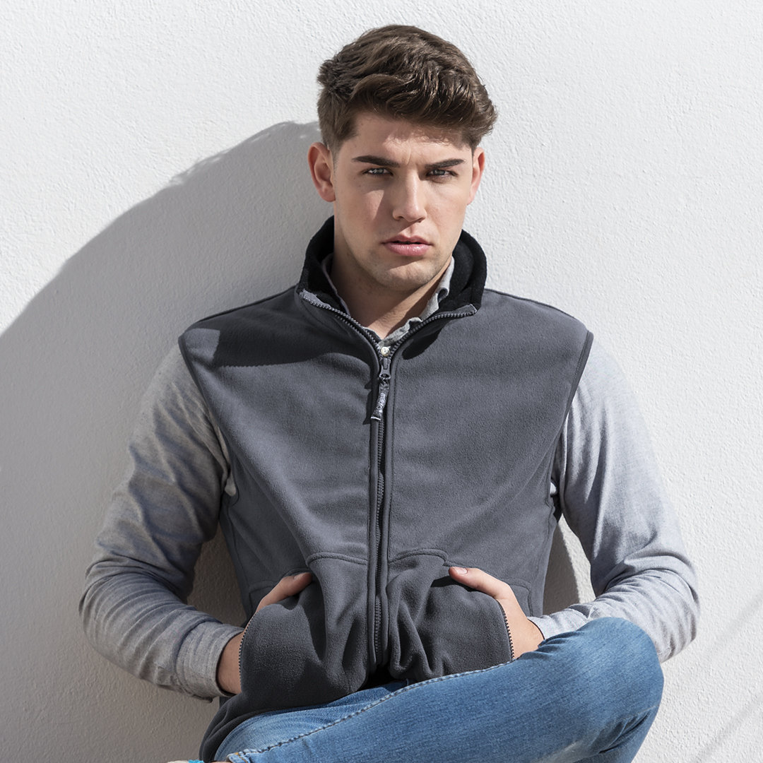 Weste aus weichem und warmem Polar-Fleece (280 g / m2) mit Anti-Pilling-Behandlung. Mit farbigem Innenkragen, Reißverschluss mit Zugband, seitlichen Reißverschlusstaschen und elastischem Bund. Erhältlich in den Größen M, L, XL und XXL.