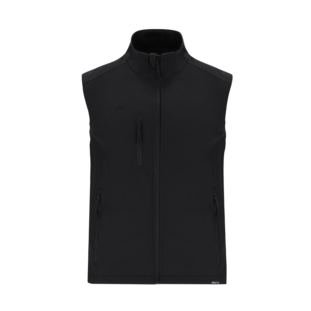 RPET Softshell-Westen aus 3 Schichten, 340 g / m². Mit 8000mm Membran, wasserdicht und atmungsaktiv. Außen Softshell und innen Mikrofleece in Schwarz. Mit Außentasche auf der rechten Brust und zwei seitlichen Reißverschlusstaschen. Mit Zentralreißverschluss und umgekehrten Reißverschlüssen an den Taschen, einschließlich schwarzer Zugbänder. Passender Kinnschutz und verstellbarer Bund mit elastischem Band und Stopper. RPET-Etikett am Saum des Kleidungsstücks.
