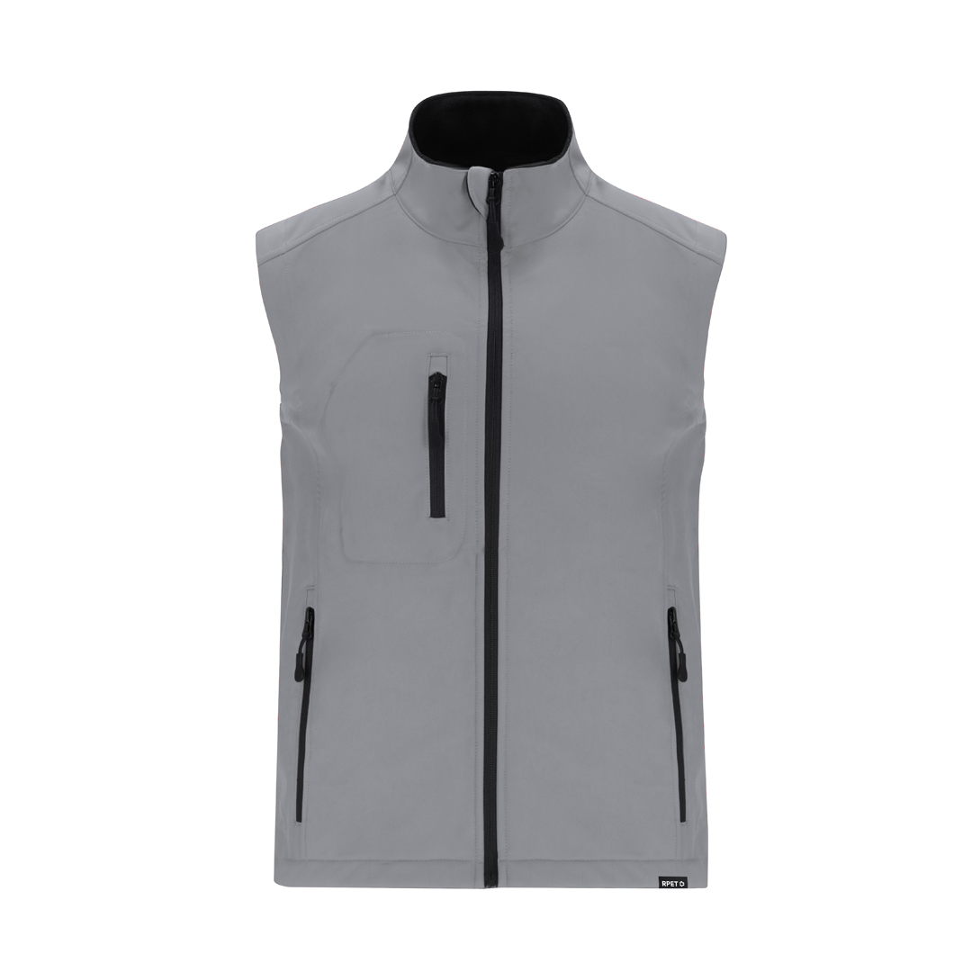 RPET Softshell-Westen aus 3 Schichten, 340 g / m². Mit 8000mm Membran, wasserdicht und atmungsaktiv. Außen Softshell und innen Mikrofleece in Schwarz. Mit Außentasche auf der rechten Brust und zwei seitlichen Reißverschlusstaschen. Mit Zentralreißverschluss und umgekehrten Reißverschlüssen an den Taschen, einschließlich schwarzer Zugbänder. Passender Kinnschutz und verstellbarer Bund mit elastischem Band und Stopper. RPET-Etikett am Saum des Kleidungsstücks.