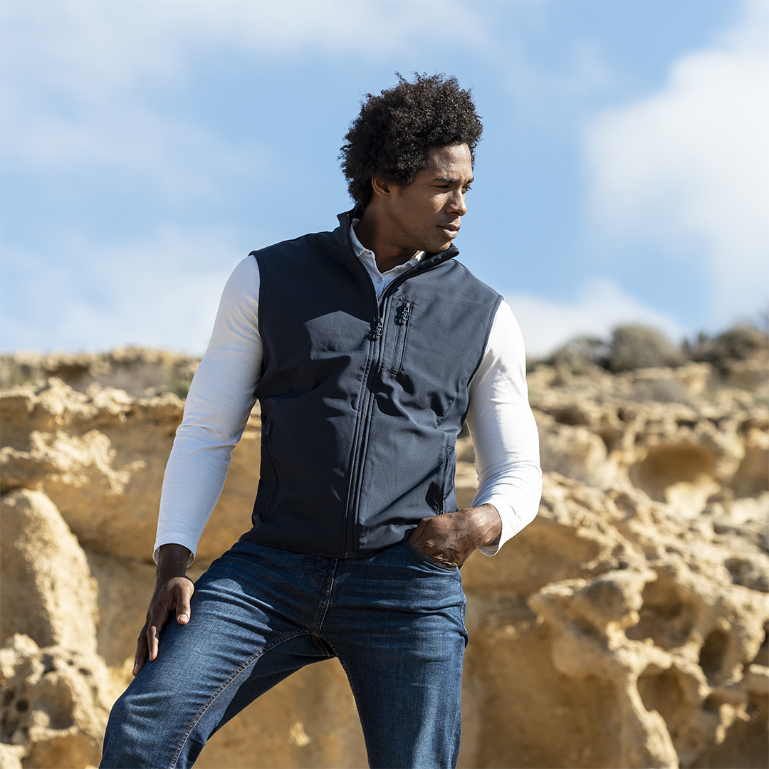 Wasserdichte, winddichte und atmungsaktive Weste aus einer Kombination von RPET-Materialien, die aus recyceltem Kunststoff hergestellt werden, um die Wiederverwendung von Kunststoffabfällen zu fördern und zur Nachhaltigkeit des Planeten beizutragen: 300g / m2 Softshell und Elastan außen mit 100% Polyester-Mikrofleece innen. Öko-Emblem am unteren Saum des Kleidungsstücks. Mit Reißverschluss und mit Brust- und Seitentaschen mit unsichtbarem Reißverschluss und passenden Zugbändern. Erhältlich in einer breiten Farbpalette und in den Größen S, M, L, XL, XXL.
