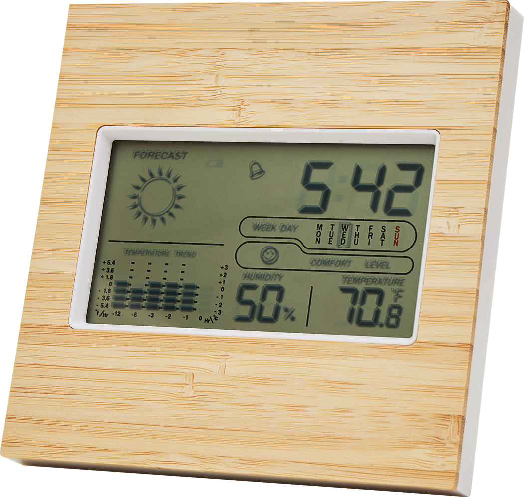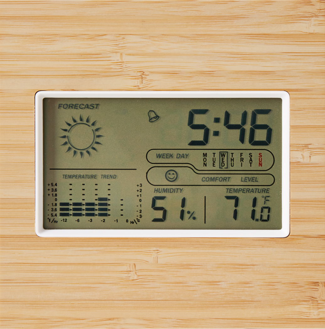 Wetterstation FORECAST: mit Bambusfront, Alarmfunktion, Datums- und Zeitanzeige, Hygrometer und Thermometer (°C und °F), ausklappbarer Aufsteller und Loch zur Wandmontage auf der Rückseite, batteriebetrieben (2x AAA Batterien nicht enthalten), in Box