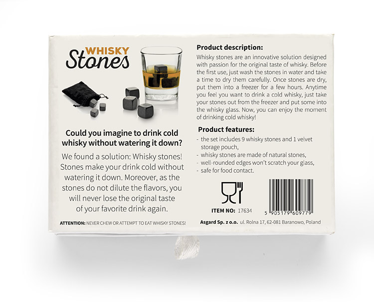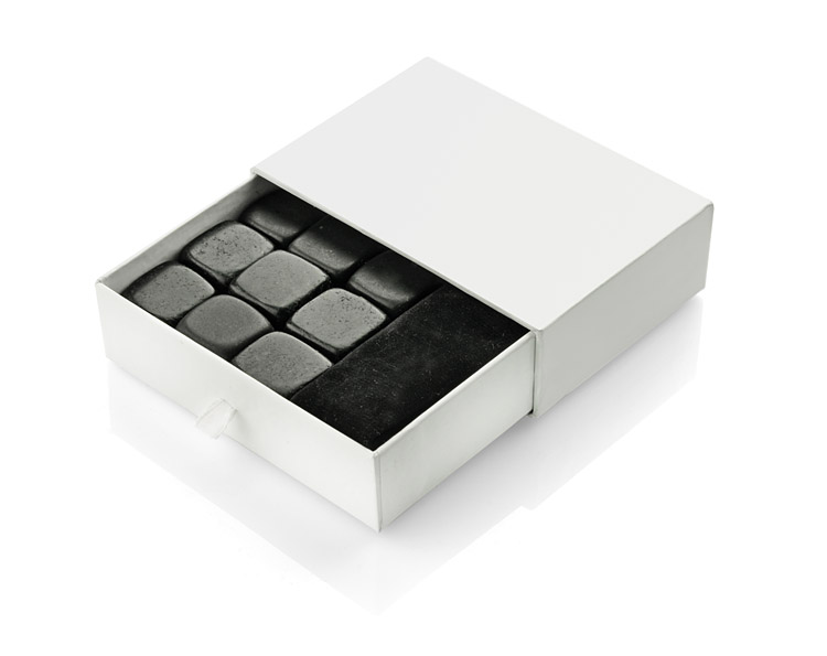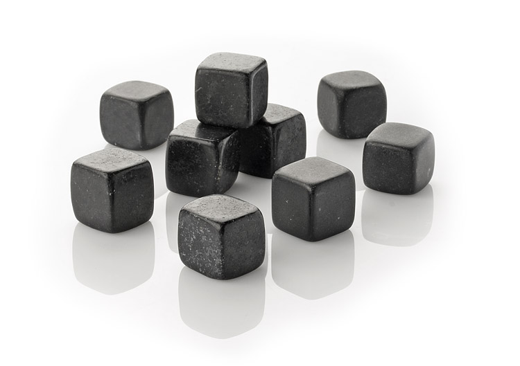 Whisky-Steine – eine völlige Marktneuheit - ein Gadget für anspruchsvolle Kunden, insbesondere für Whisky-Kenner. Dieses Set mit 9 speziellen Steinen ersetzt Eiswürfel. Die Würfel sind mindestens 4 Stunden in der Kühltruhe zu platzieren, damit sie die gewünschte Temperatur erreichen. Nach dem Herausnehmen kann man sie anstatt Eiswürfel verwenden. Die wichtigsten Vorteil dieser Lösungen im Vergleich mit den Eiswürfeln: sie verdünnen das Getränk nicht, lassen sich mehrmals anfertigen und sind äußerst originell. Die Würfel sind aus natürlichem Basalt gefertigt. Das Produkt verfügt ein Zulassungsattest für den Kontakt mit Lebensmitteln.